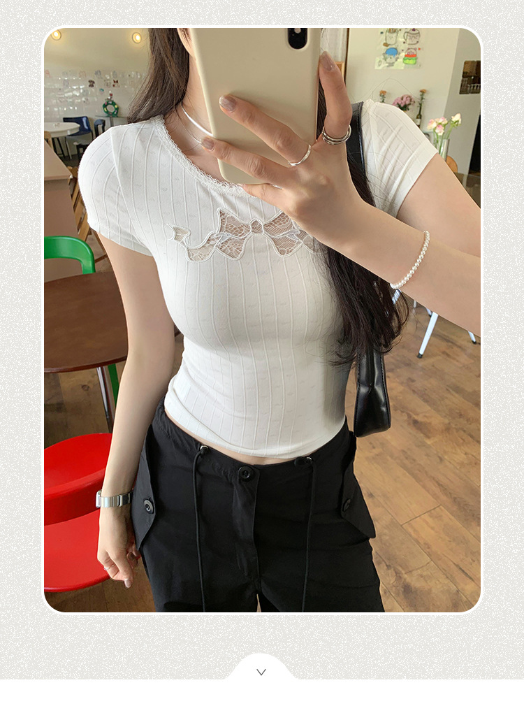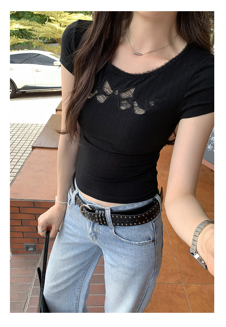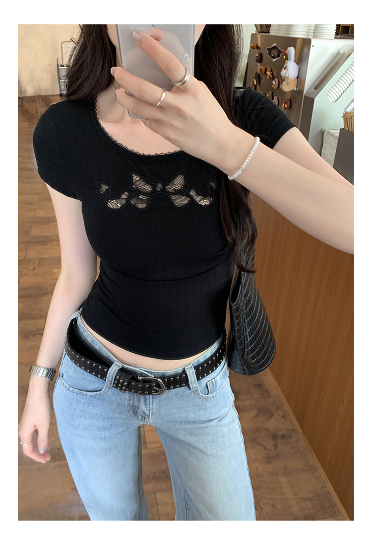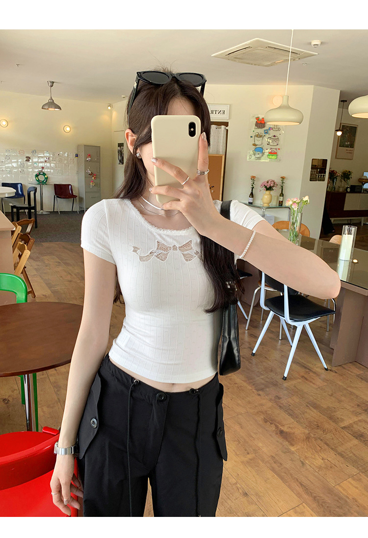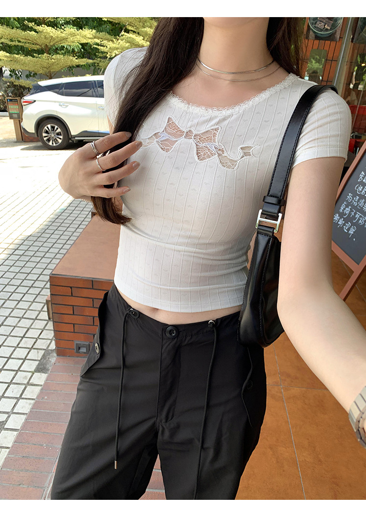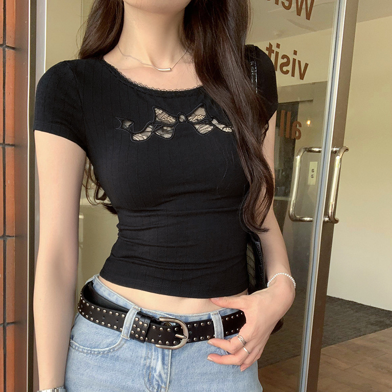 한국 스타일 순수한 욕망 할로우 레이스 어깨 반팔 티셔츠 여성 여름 새 달콤하고 핫 슬림 핏 쇼트 탑스토어 가기