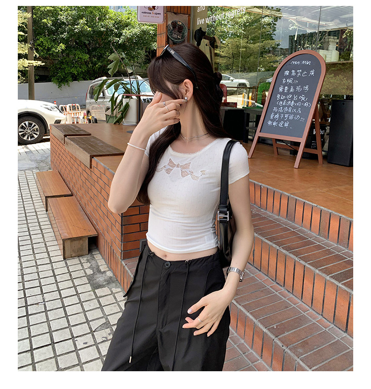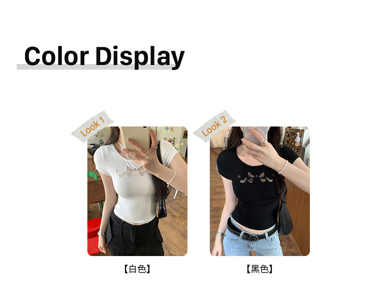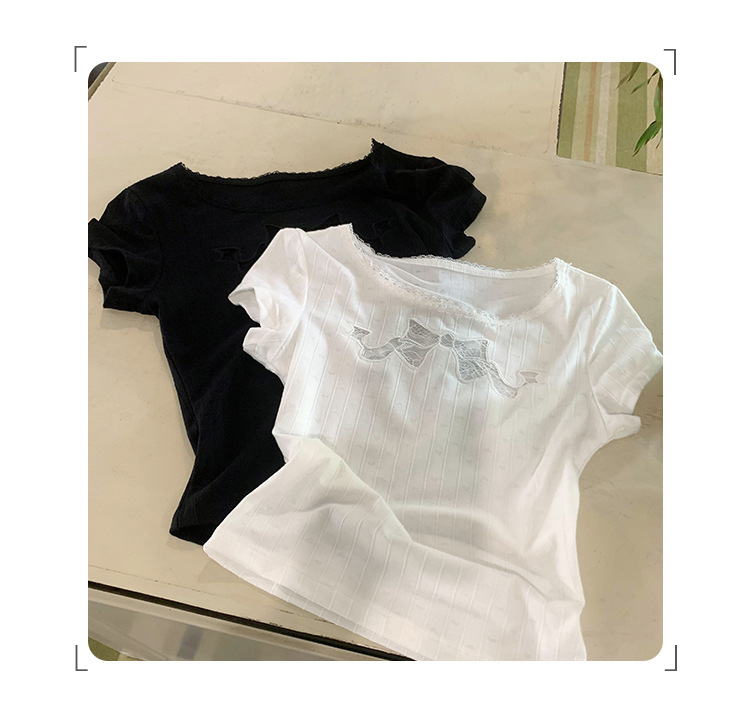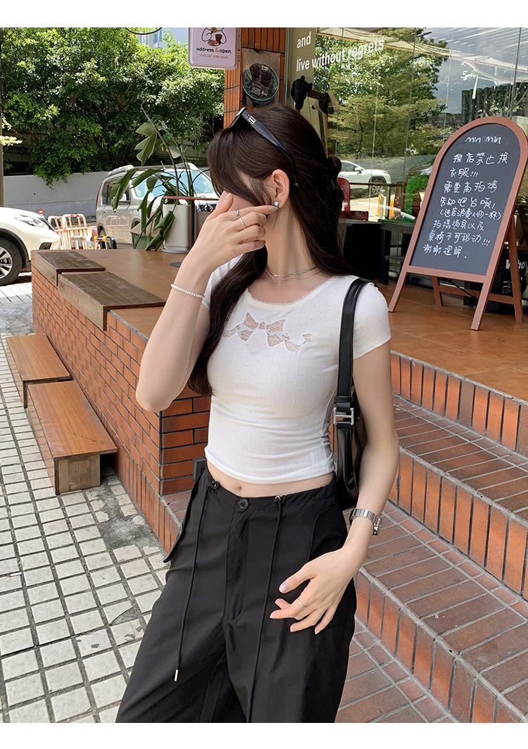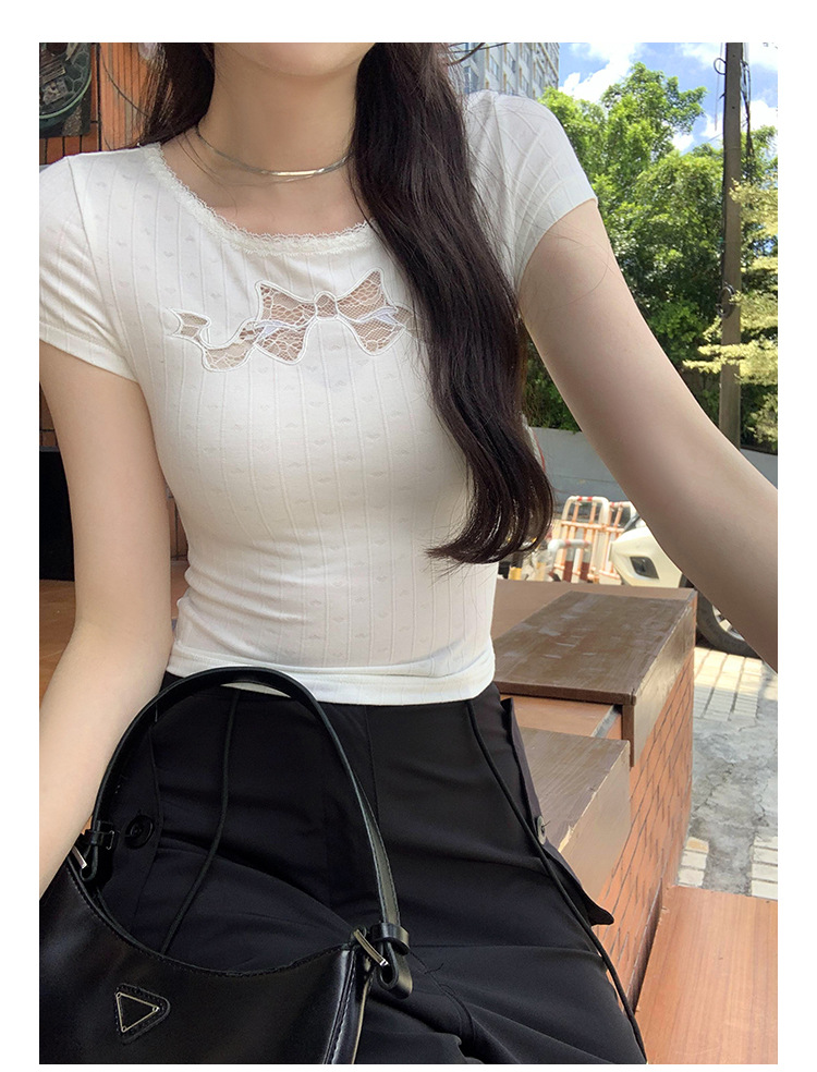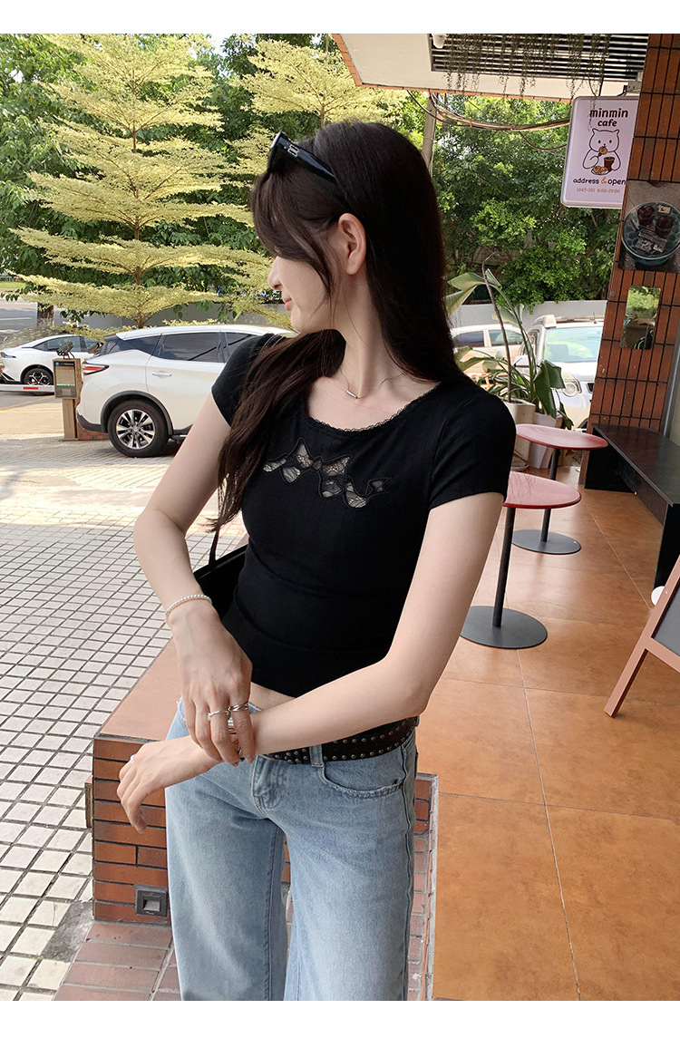 한국 스타일 순수한 욕망 할로우 레이스 어깨 반팔 티셔츠 여성 여름 새 달콤하고 핫 슬림 핏 쇼트 탑스토어 가기