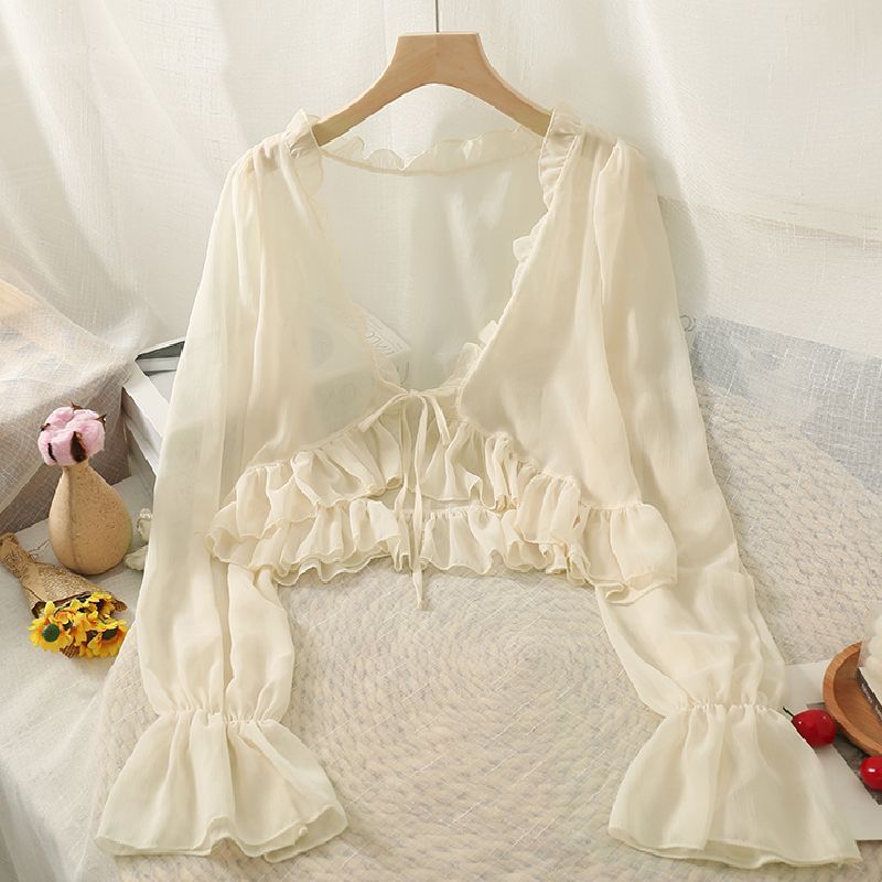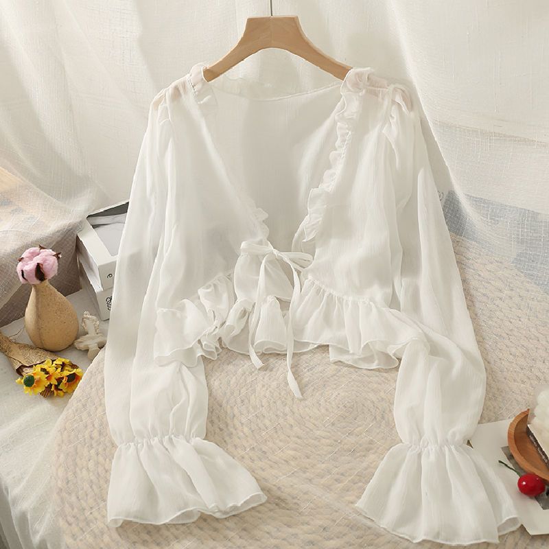 선 스크린 의류 러플 V 넥 목도리가 달린 여성용 얇은 시폰 카디건 슬링 스커트와 여름 짧은 블라우스스토어 가기