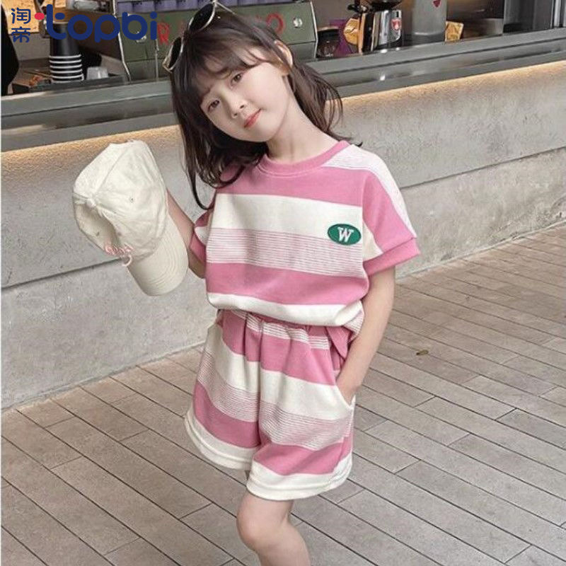 여자 여름 줄무늬 폭발 세트 2024 새로운 한국 스타일 서양식 어린이 인터넷 연예인 짧은 소매 유행 투피스 세트