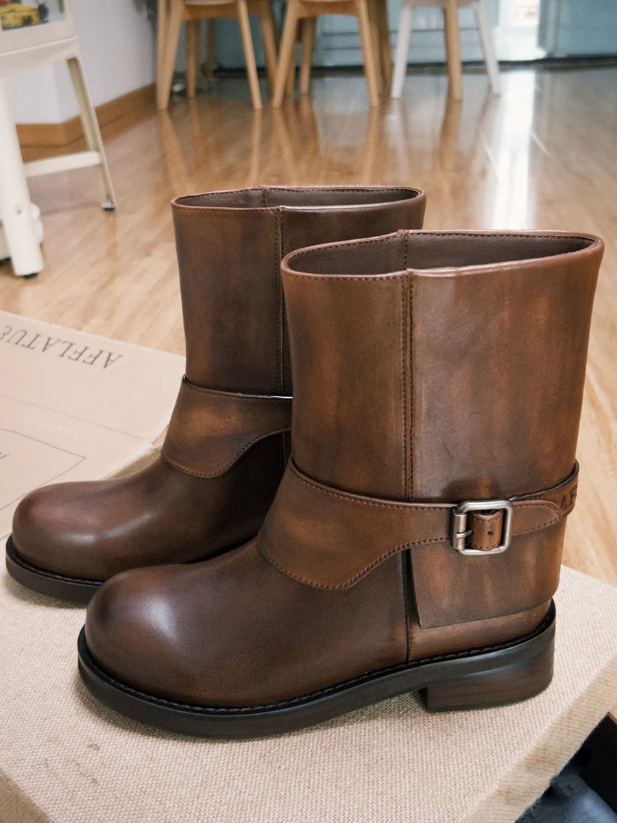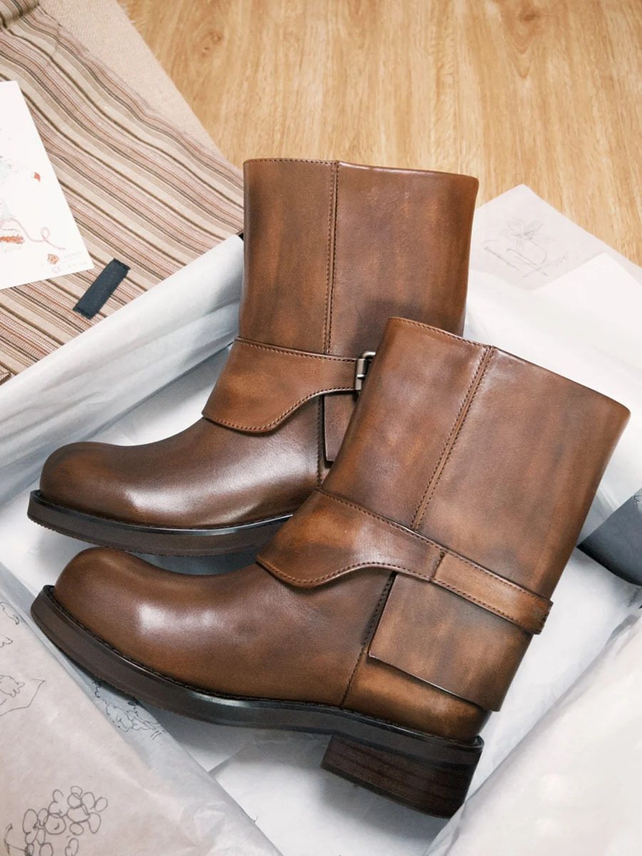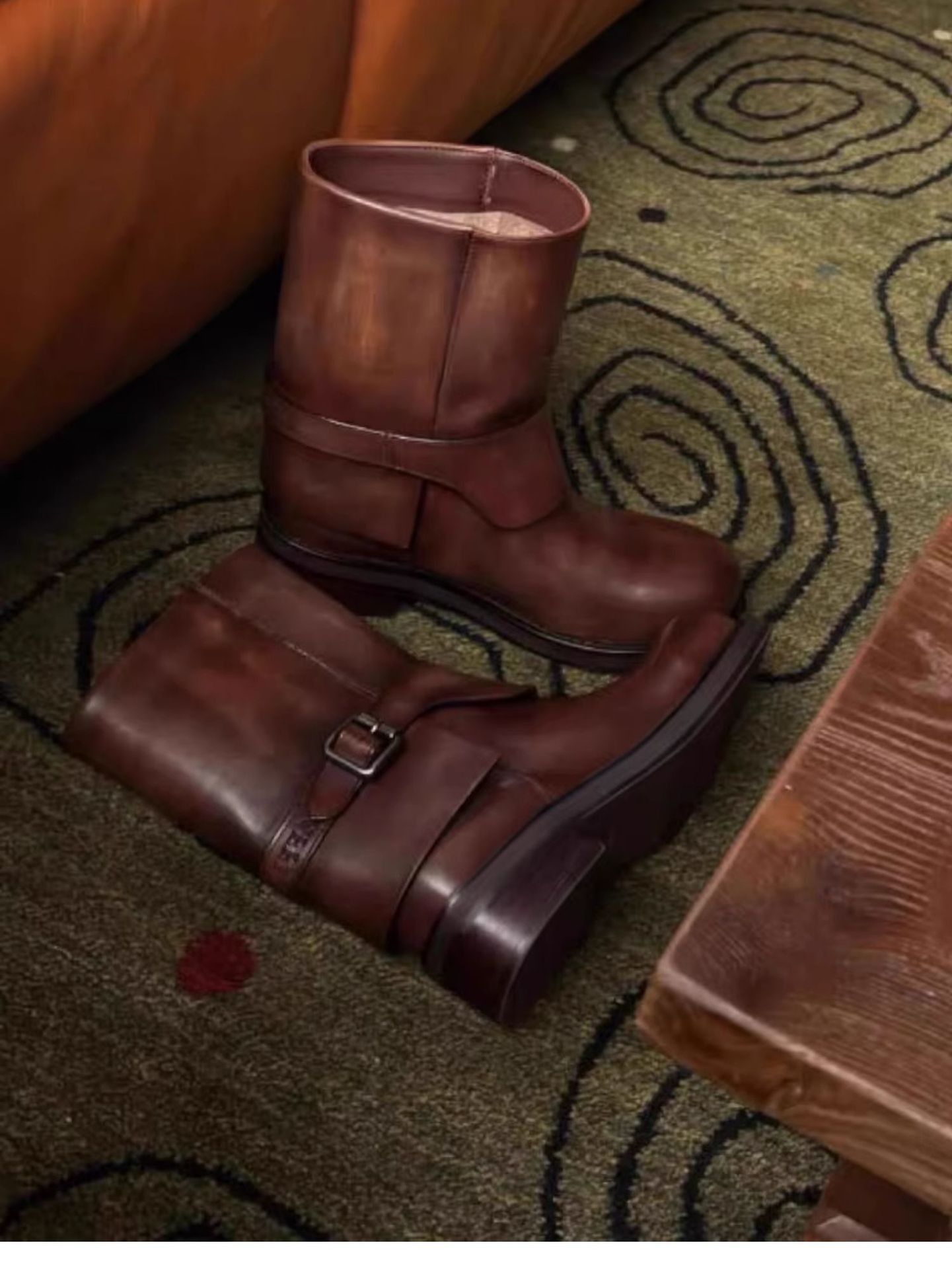 Cowhide Edition ~ 컬러 광택 첼시 부츠 여성용 올드 올 매치 스모크 부츠 웨스턴 픽 힐 미드 배럴 카우보이 부츠 나이트 부츠