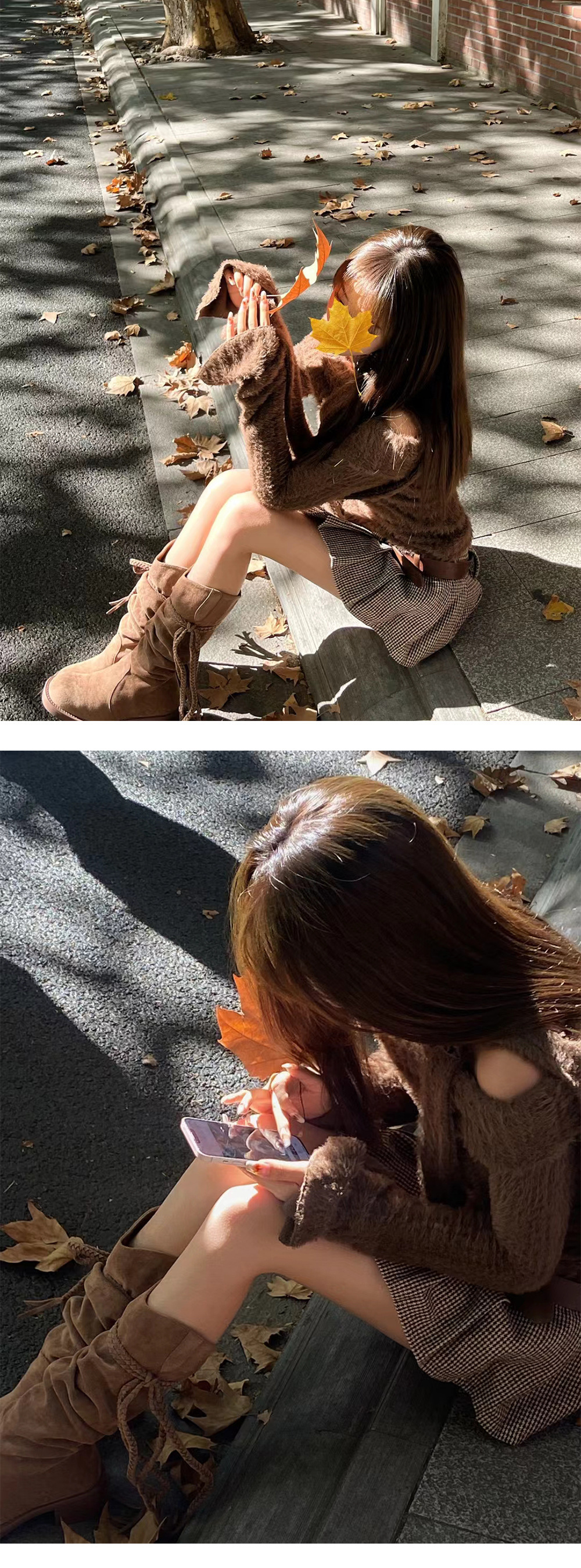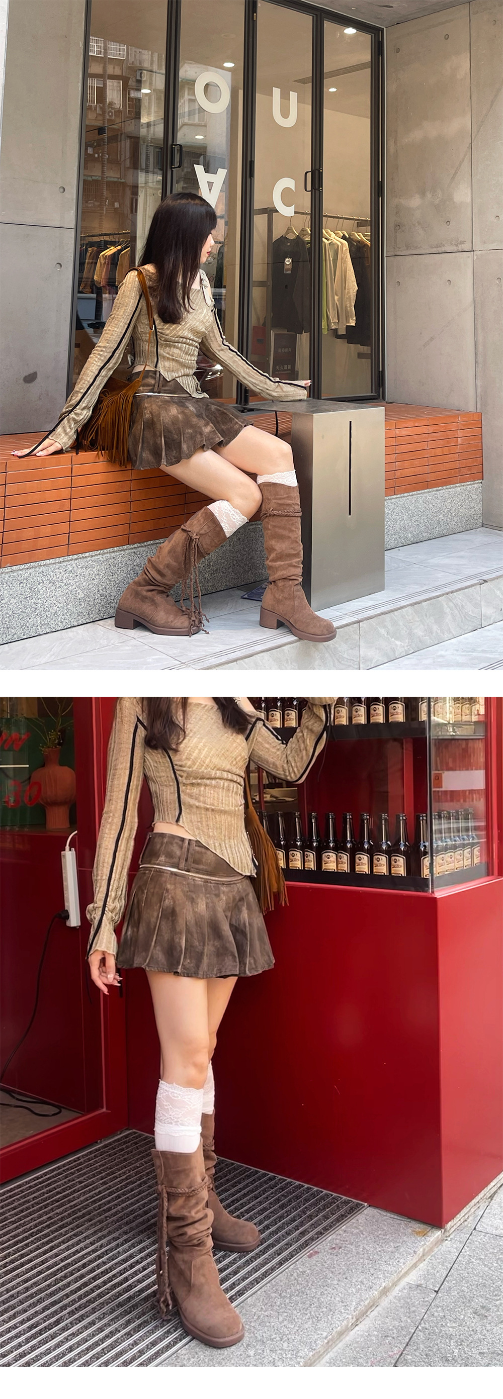 빈티지 다크 브라운 술 힙 부츠 여성용 2024 가을 및 겨울 새로운 두꺼운 힐 하이 부츠 폐기물 지구 바람 웨스턴 부츠 높은 부츠스토어 가기
