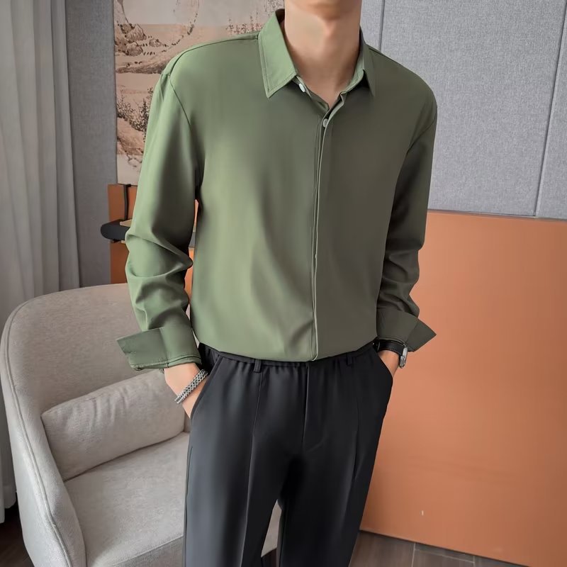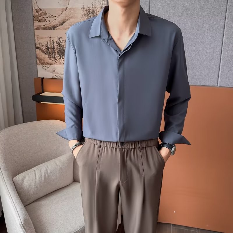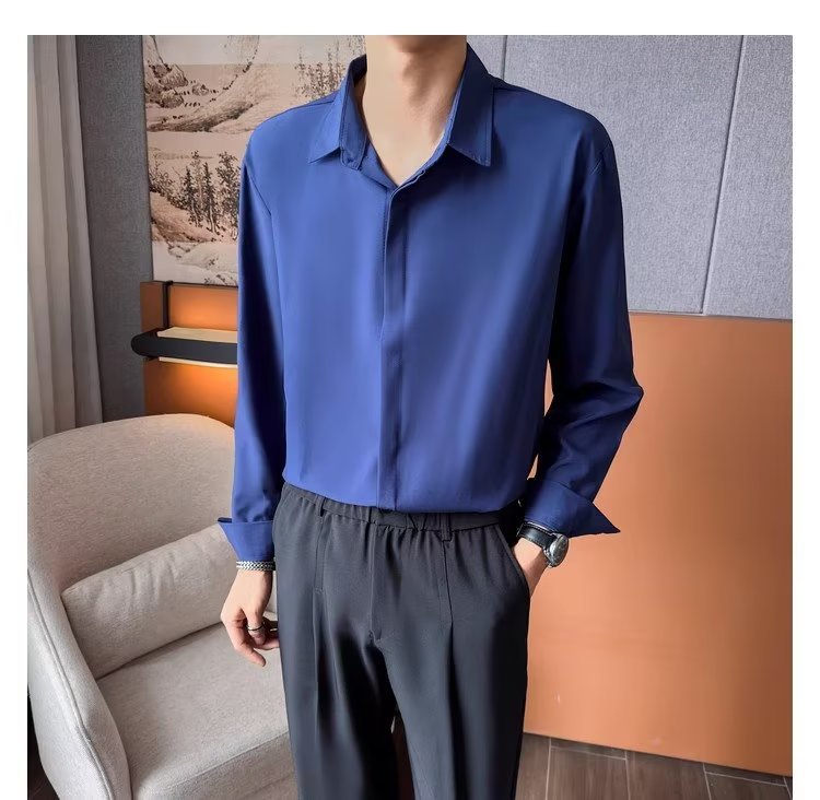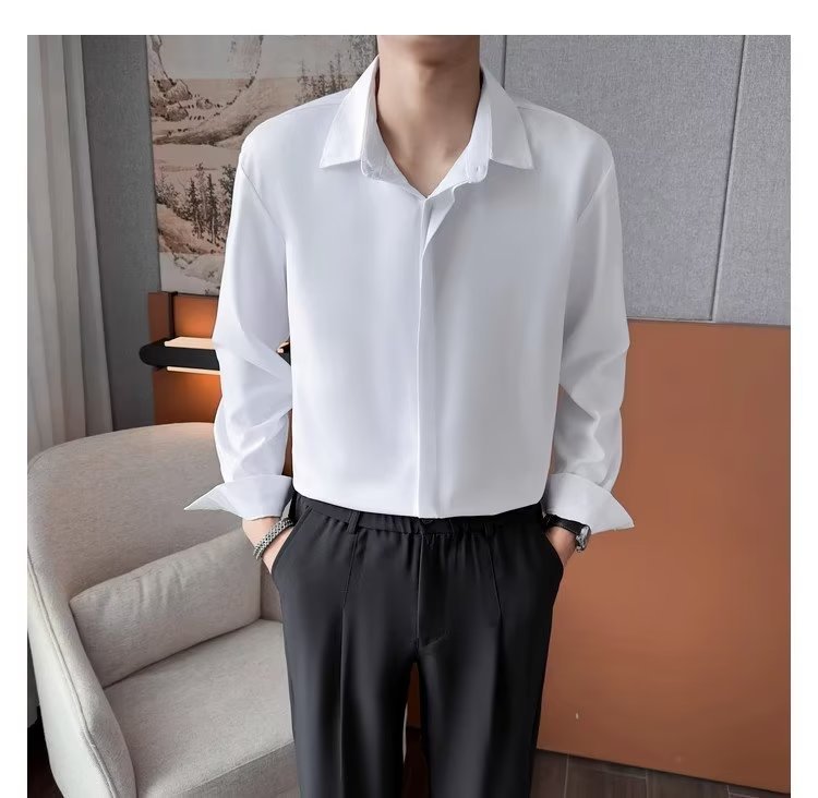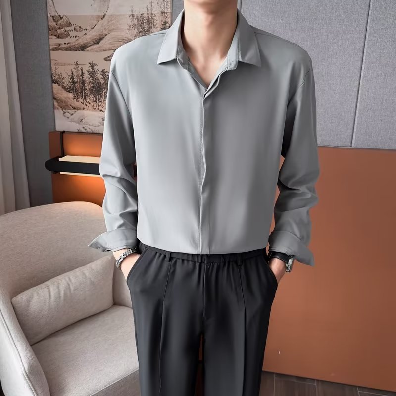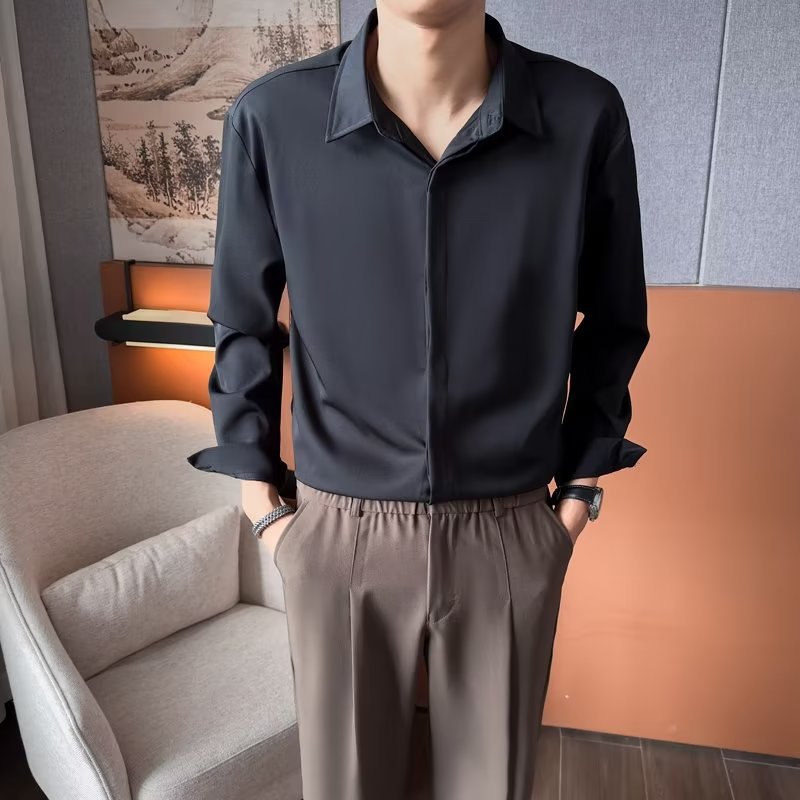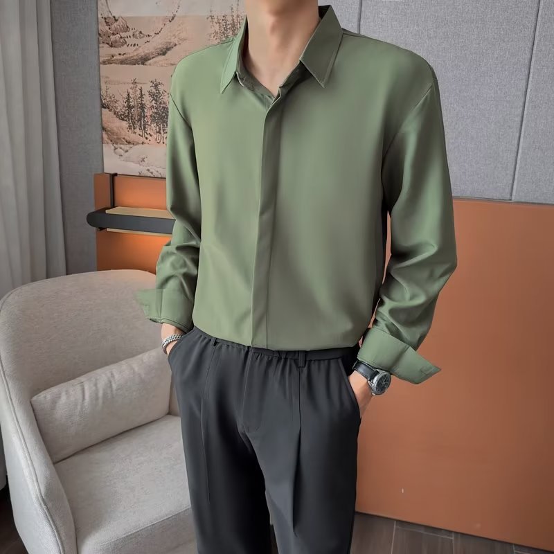 가을 남자의 긴 소매 숨겨진 버튼 다운 셔츠 원피스 비즈니스 내부 셔츠 느낌 비 다림질 캐주얼 유행 가벼운 성숙한 스타일