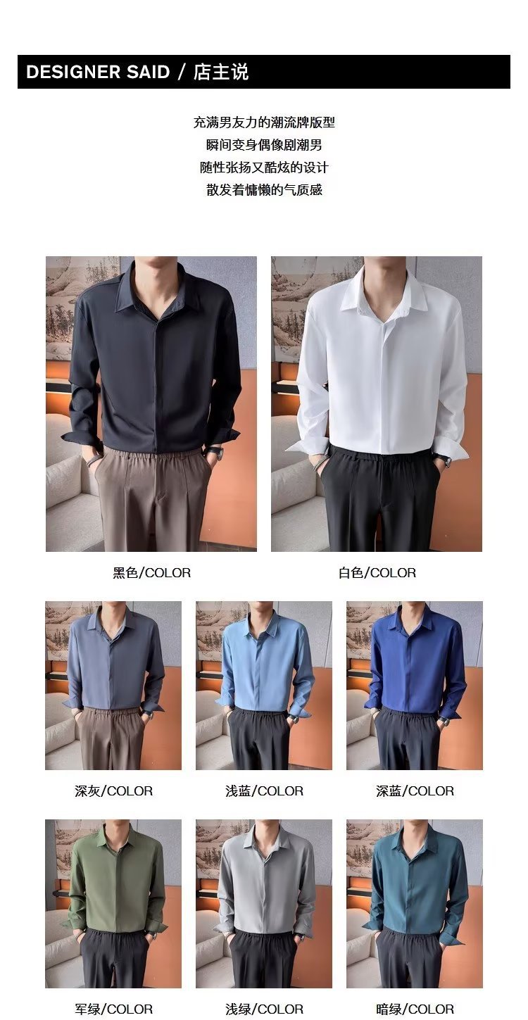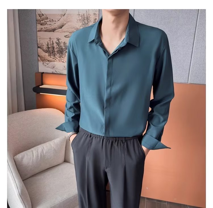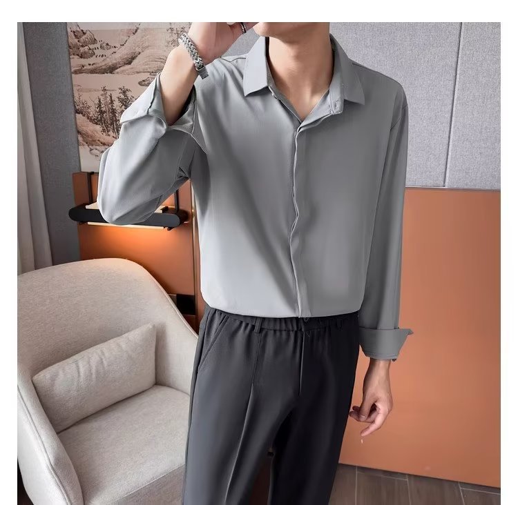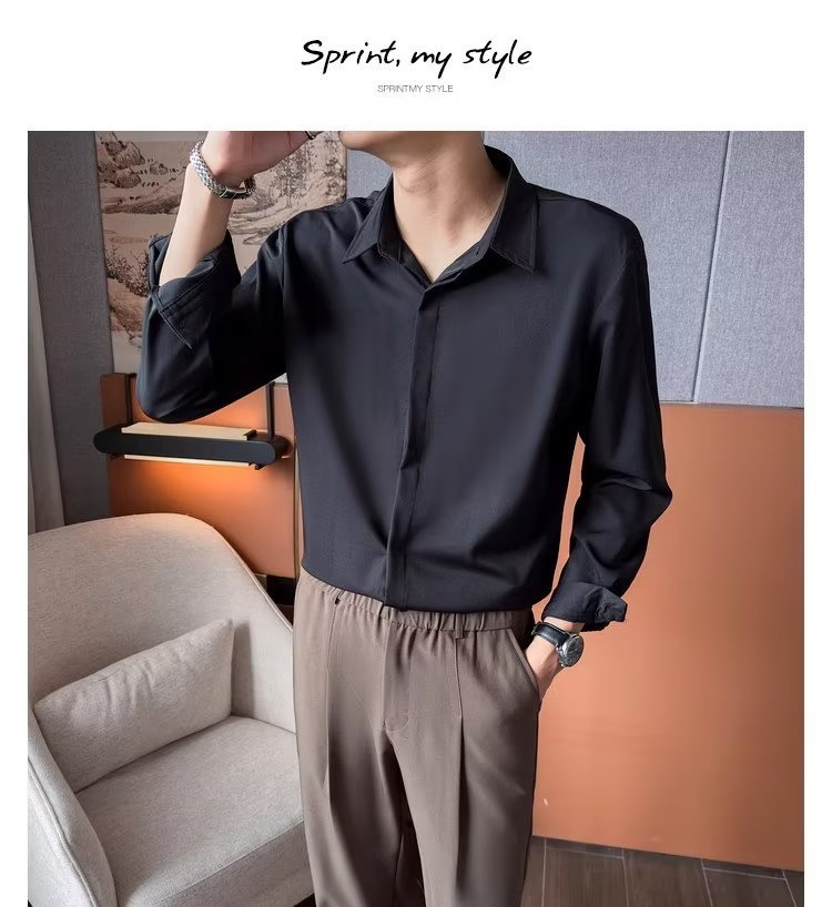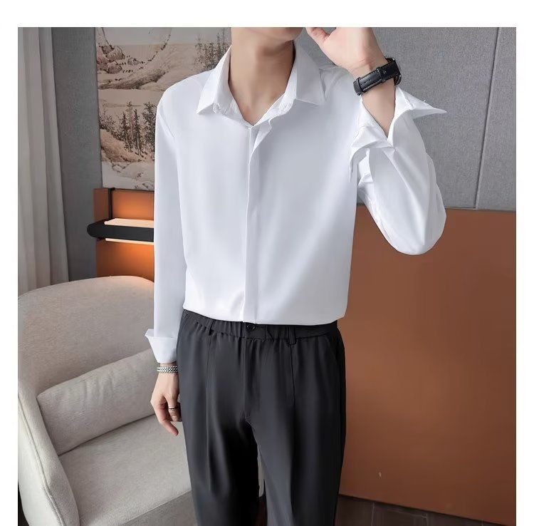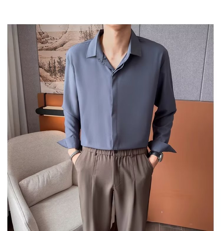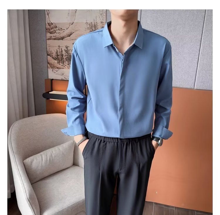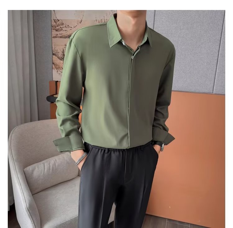 가을 남자의 긴 소매 숨겨진 버튼 다운 셔츠 원피스 비즈니스 내부 셔츠 느낌 비 다림질 캐주얼 유행 가벼운 성숙한 스타일스토어 가기