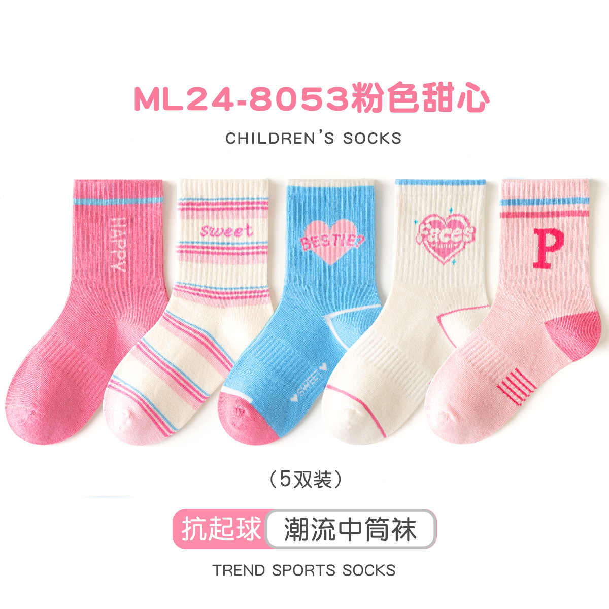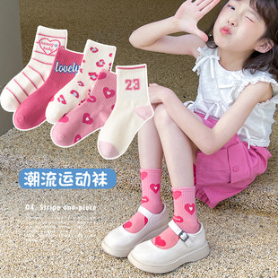 秋冬季儿童袜子批发粉色条纹爱心中大童棉袜高橡筋字母学生中筒袜