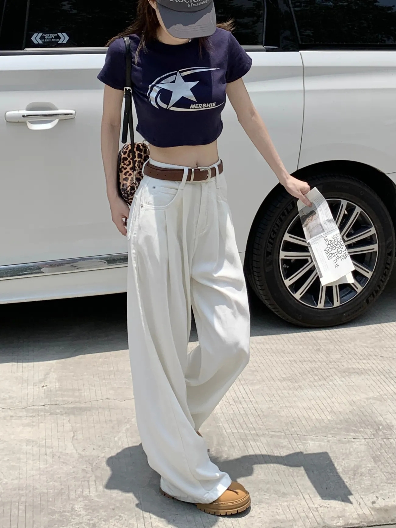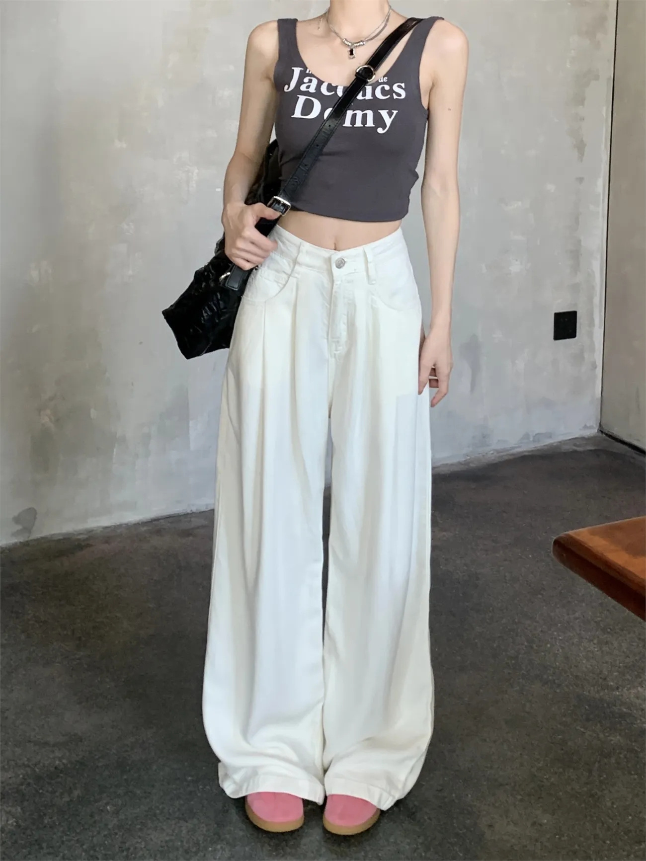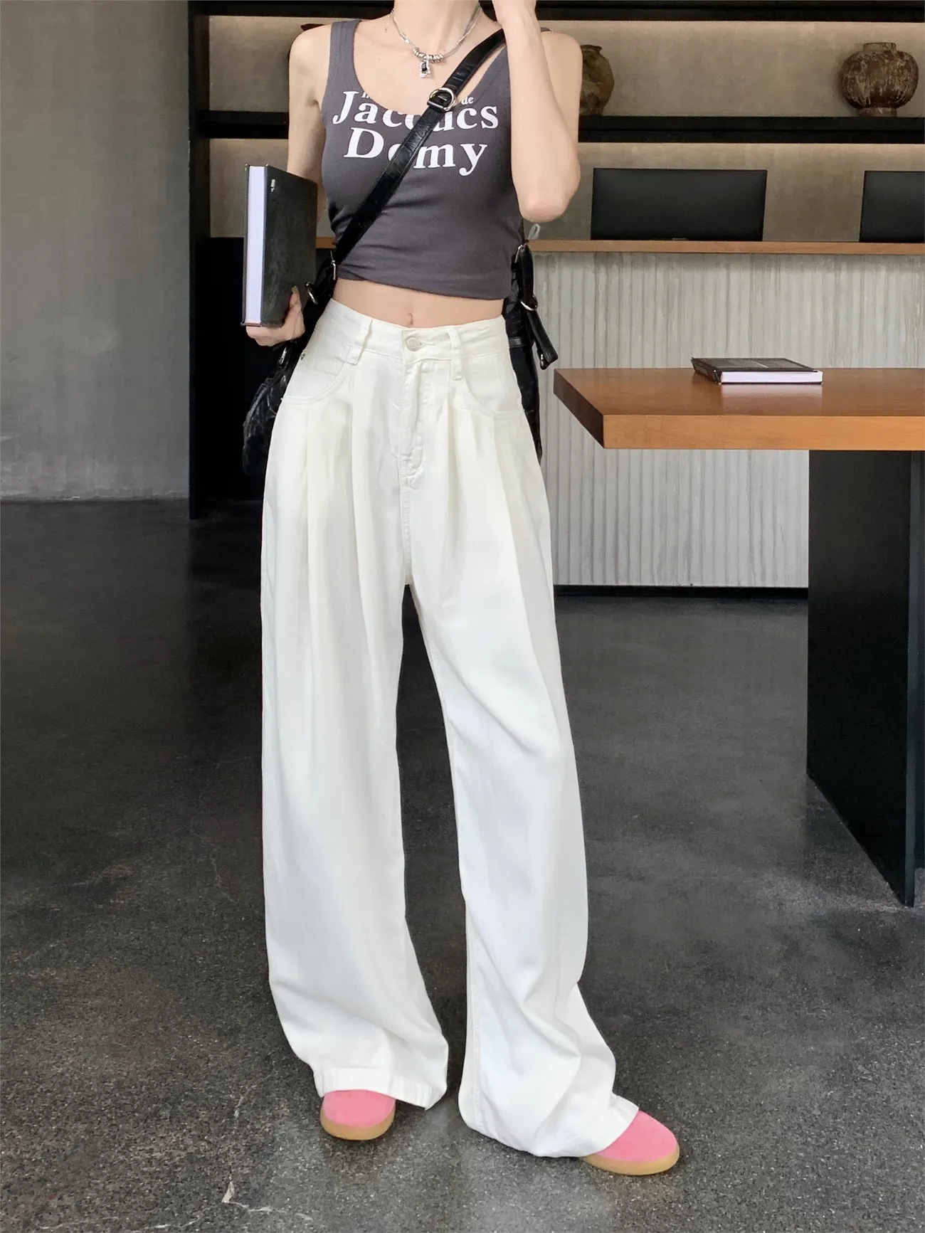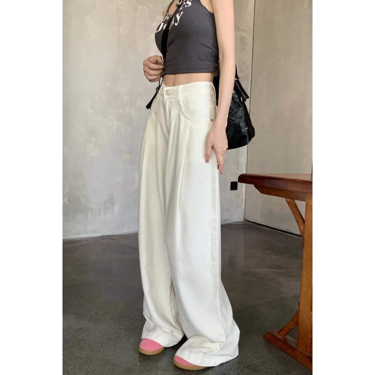 흰색 느슨한 슬림 넓은 다리 바지 청바지 여성의 가을 2024 높은 허리 Daggy 스트레이트 Lasting 유행 바지