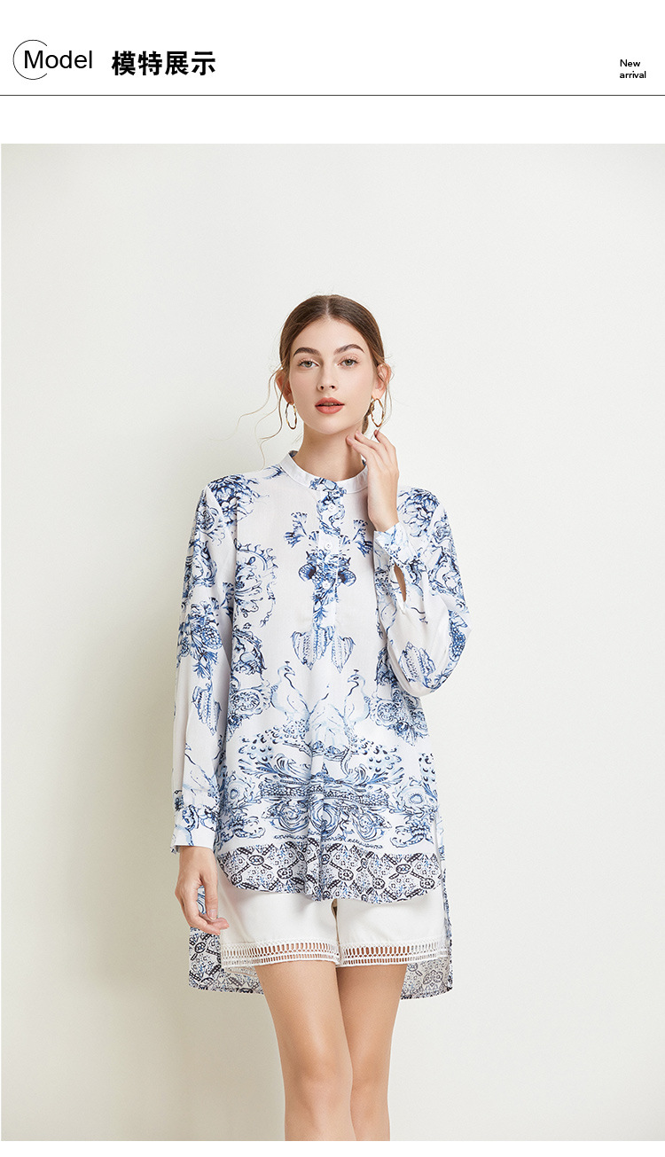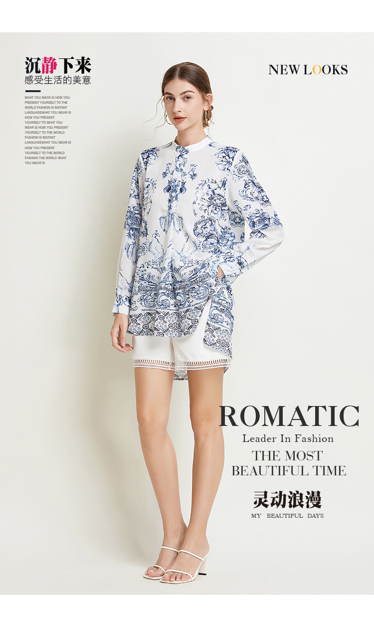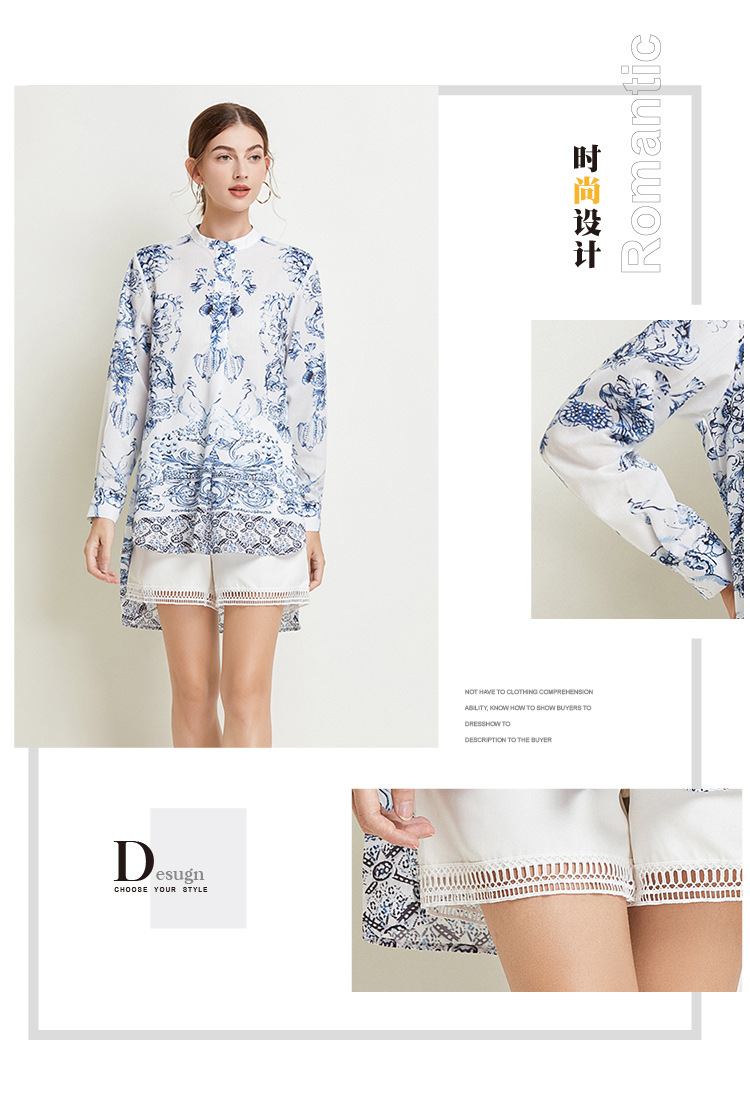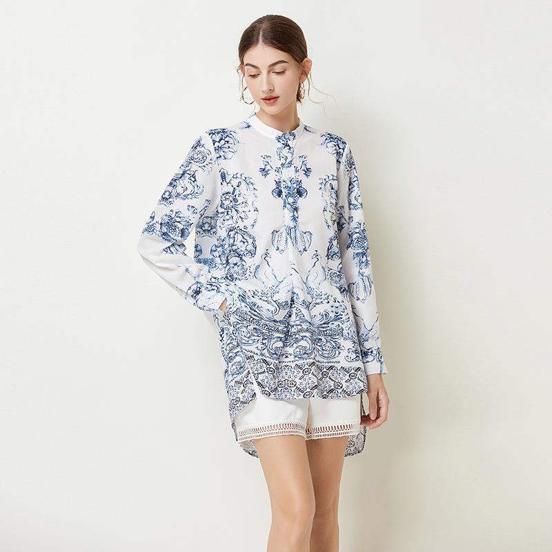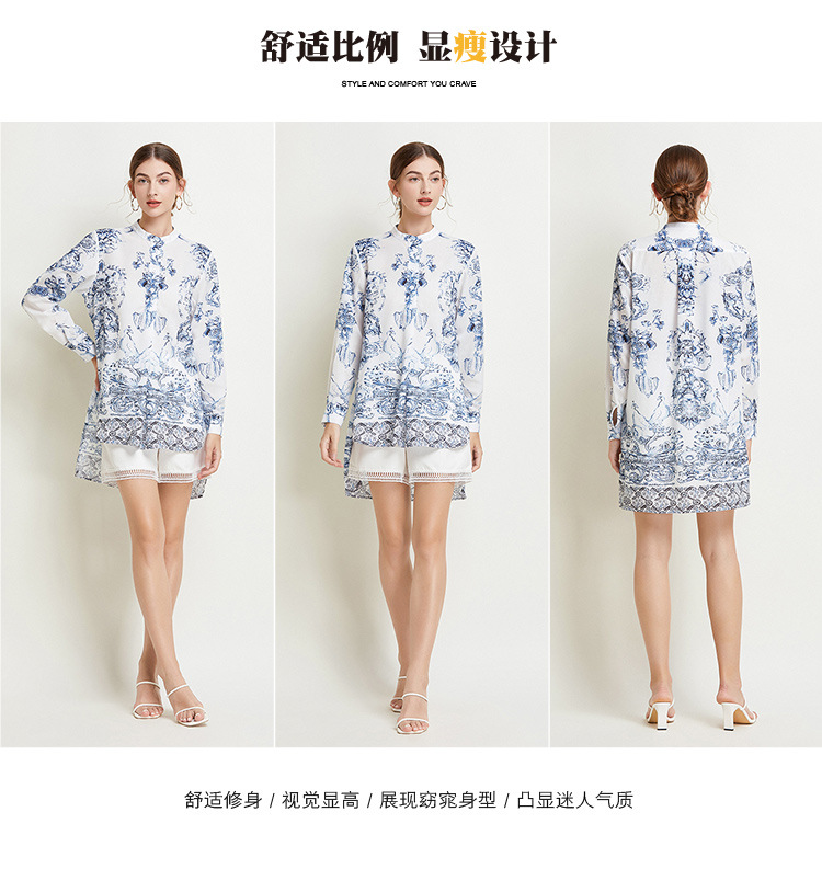 2024 대외 무역 유럽과 미국 여성의 인쇄 된 세트 여름 여성 캐주얼 착용 스탠드 칼라 비대칭 셔츠 투피스 세트스토어 가기