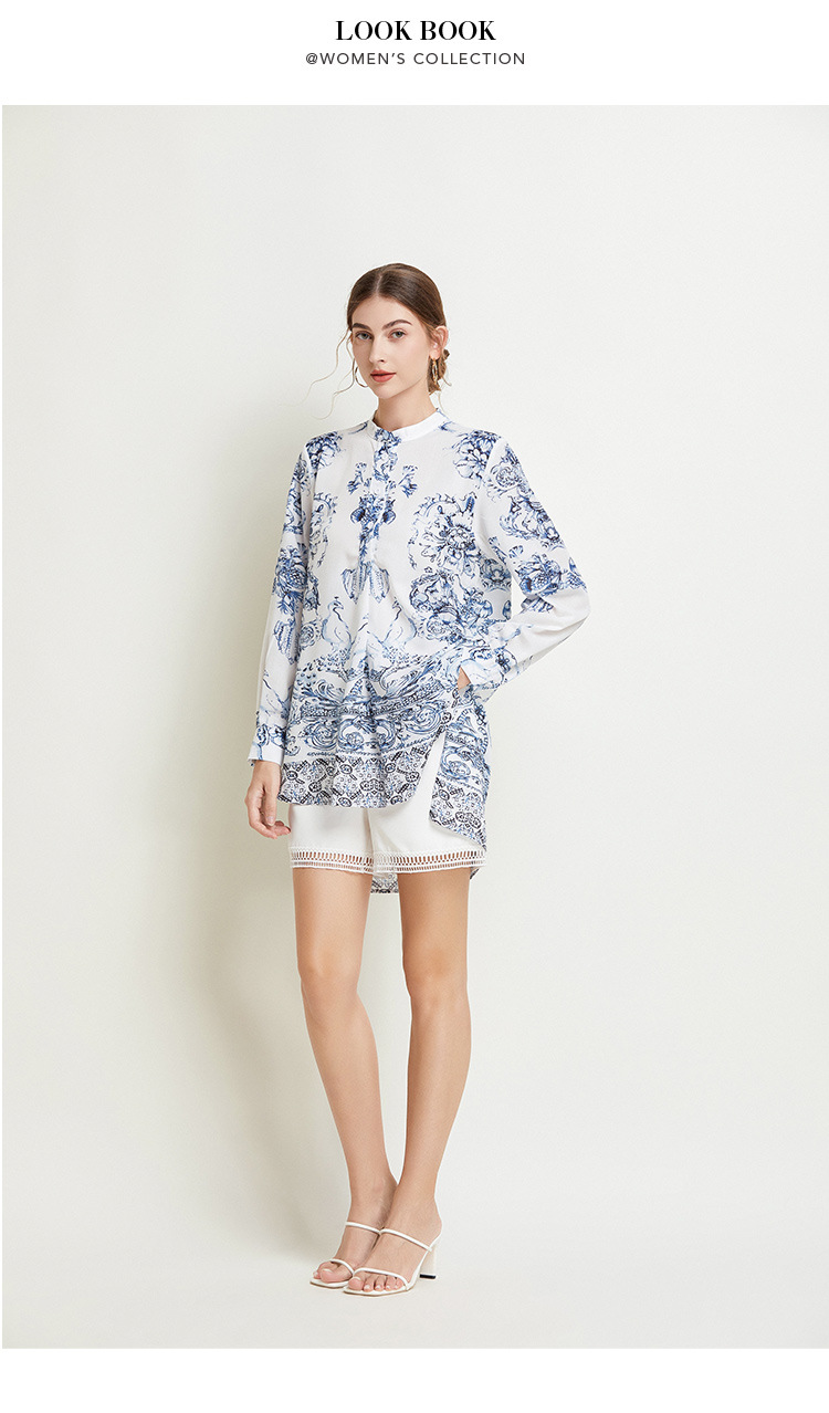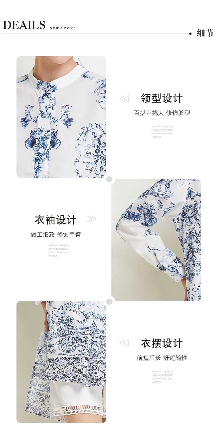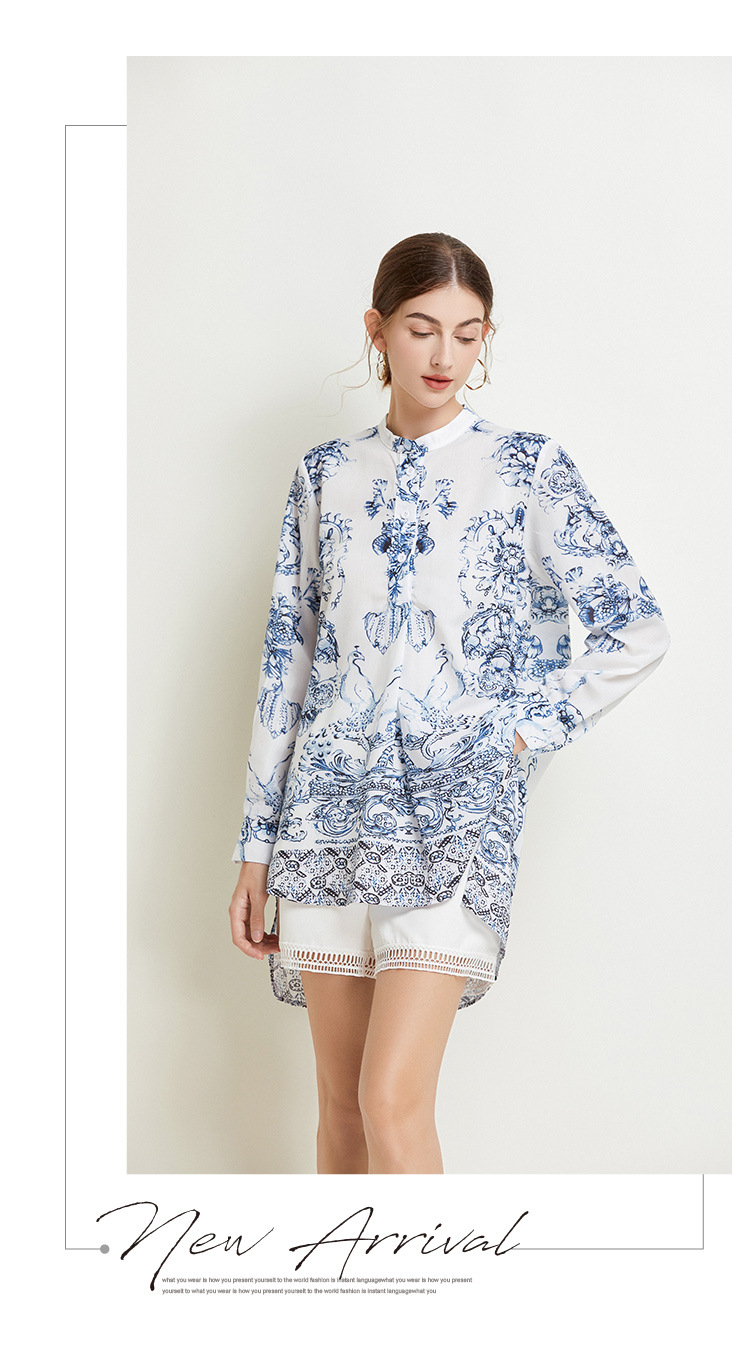 2024 대외 무역 유럽과 미국 여성의 인쇄 된 세트 여름 여성 캐주얼 착용 스탠드 칼라 비대칭 셔츠 투피스 세트스토어 가기
