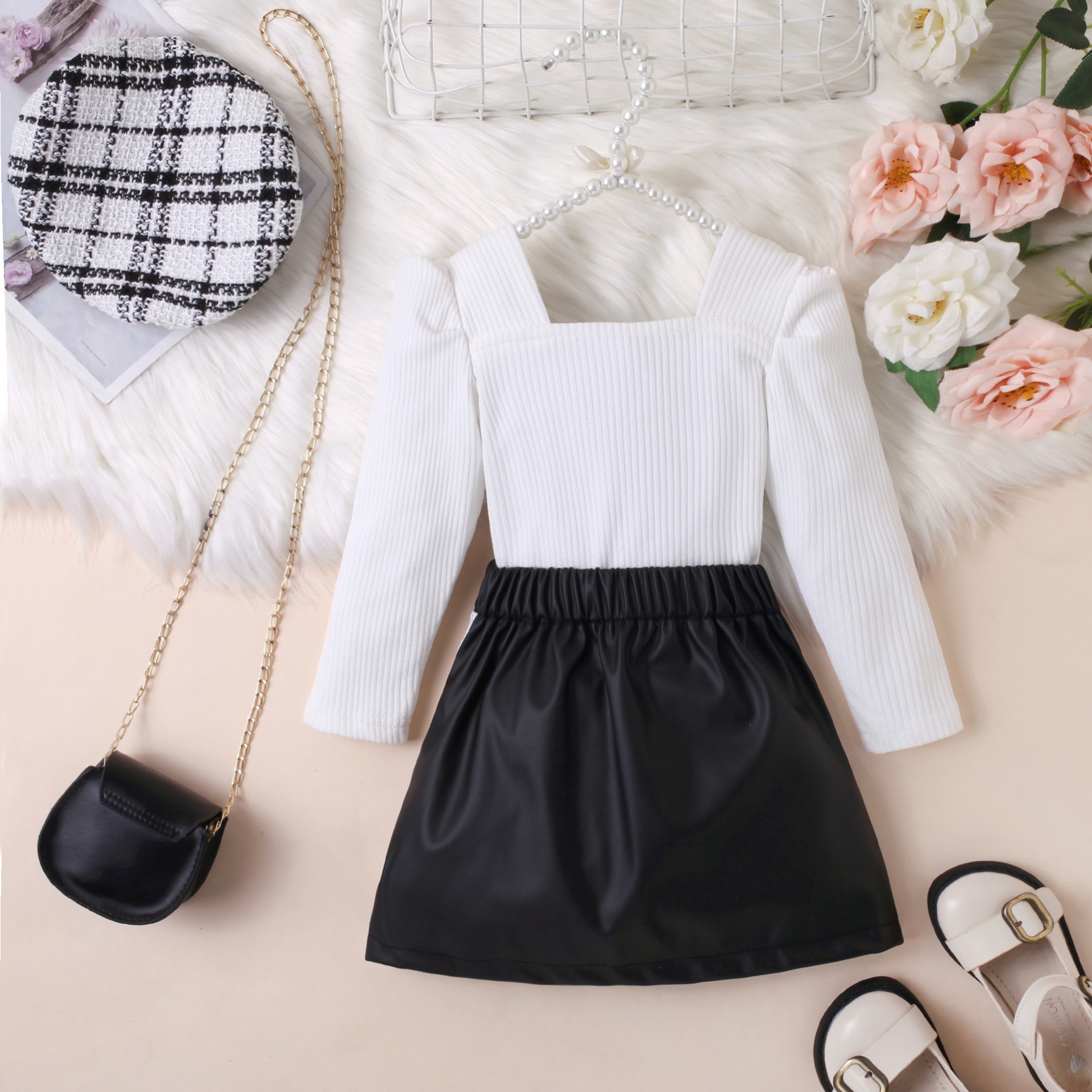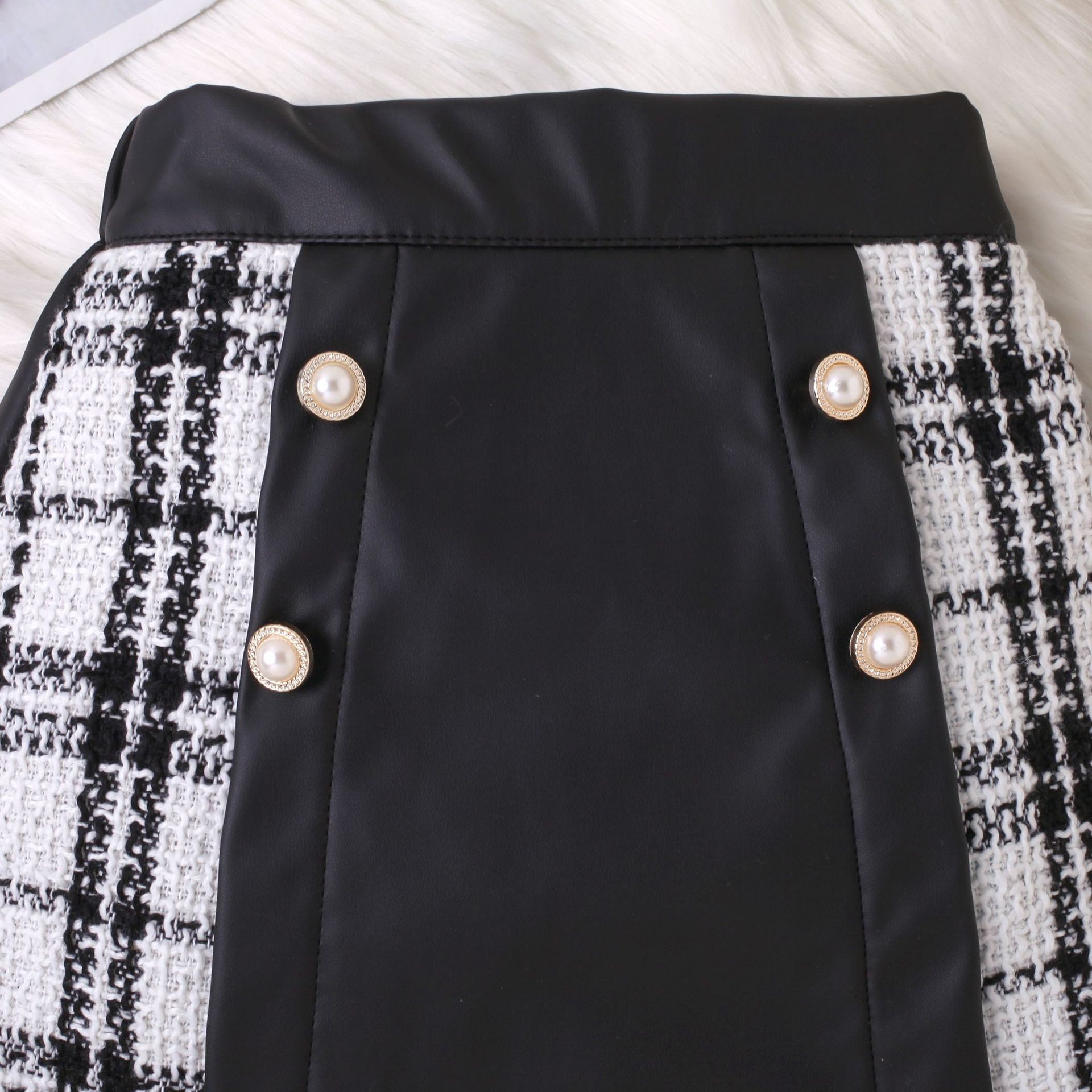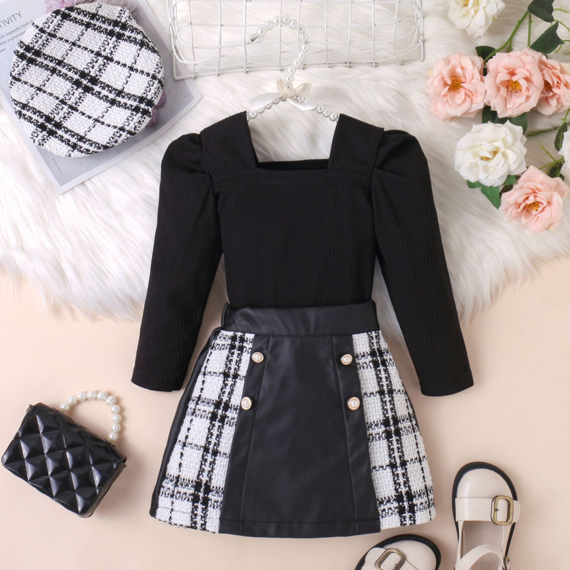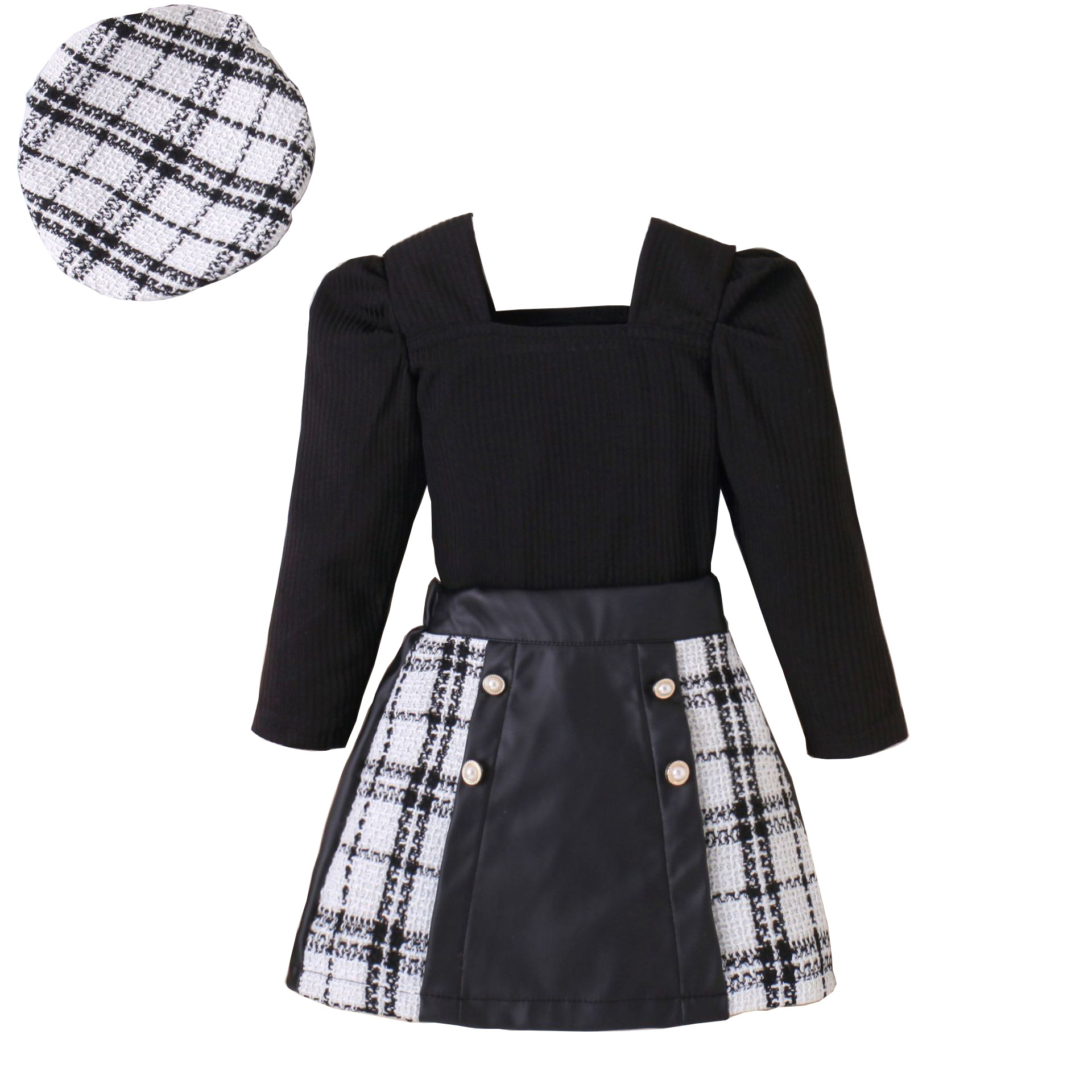 국경 간 유럽과 미국 소녀의 가을 세트 작은 샤넬 스타일 스퀘어 칼라 긴 소매 PU 스티칭 격자 스커트 모자 3 피스 세트