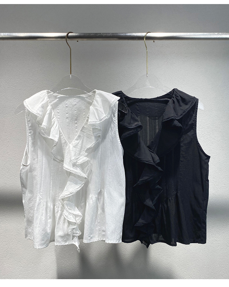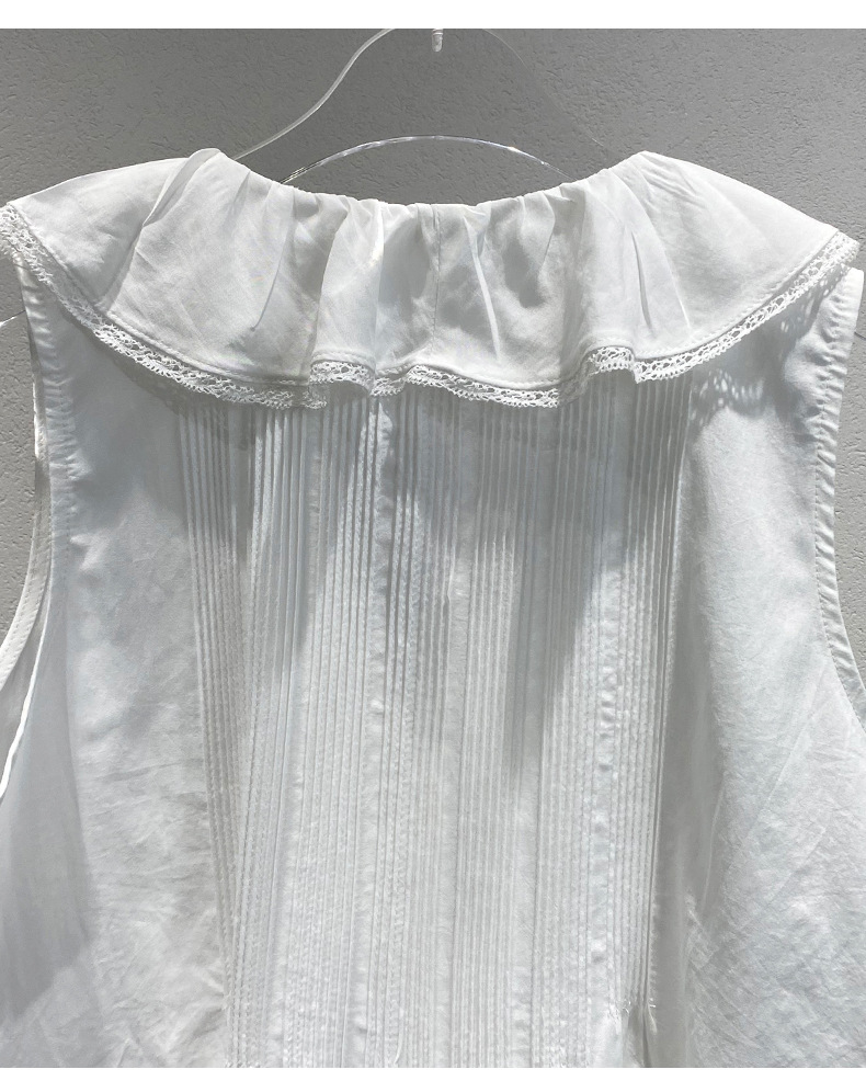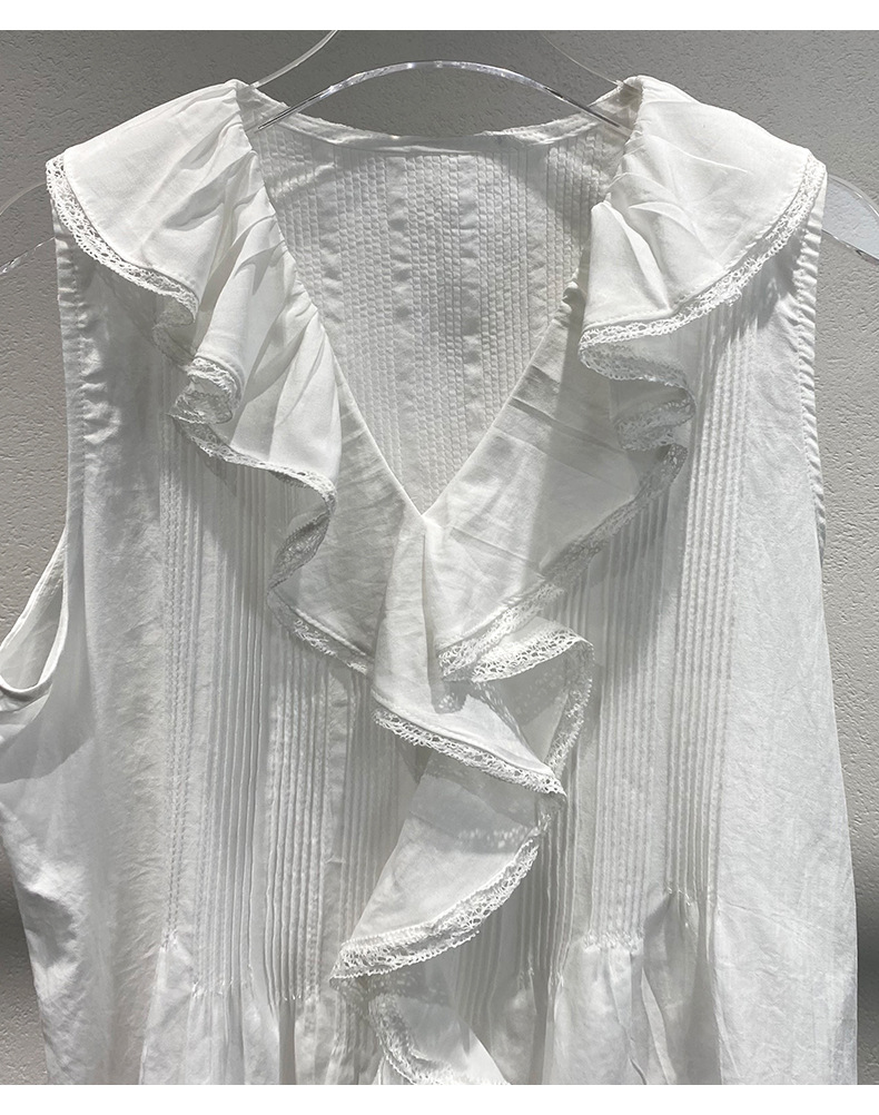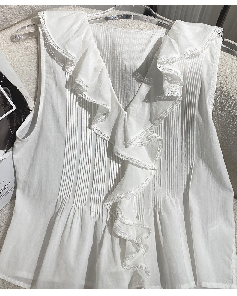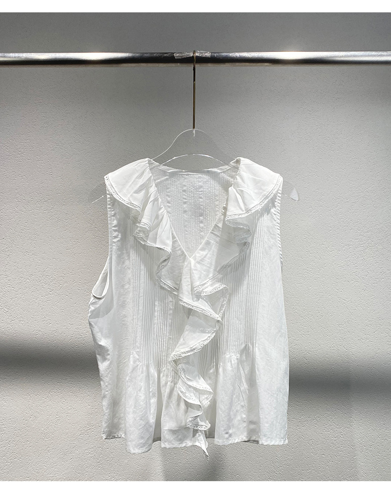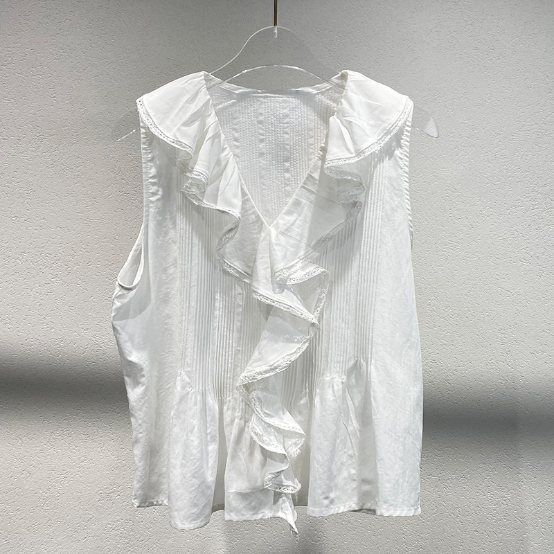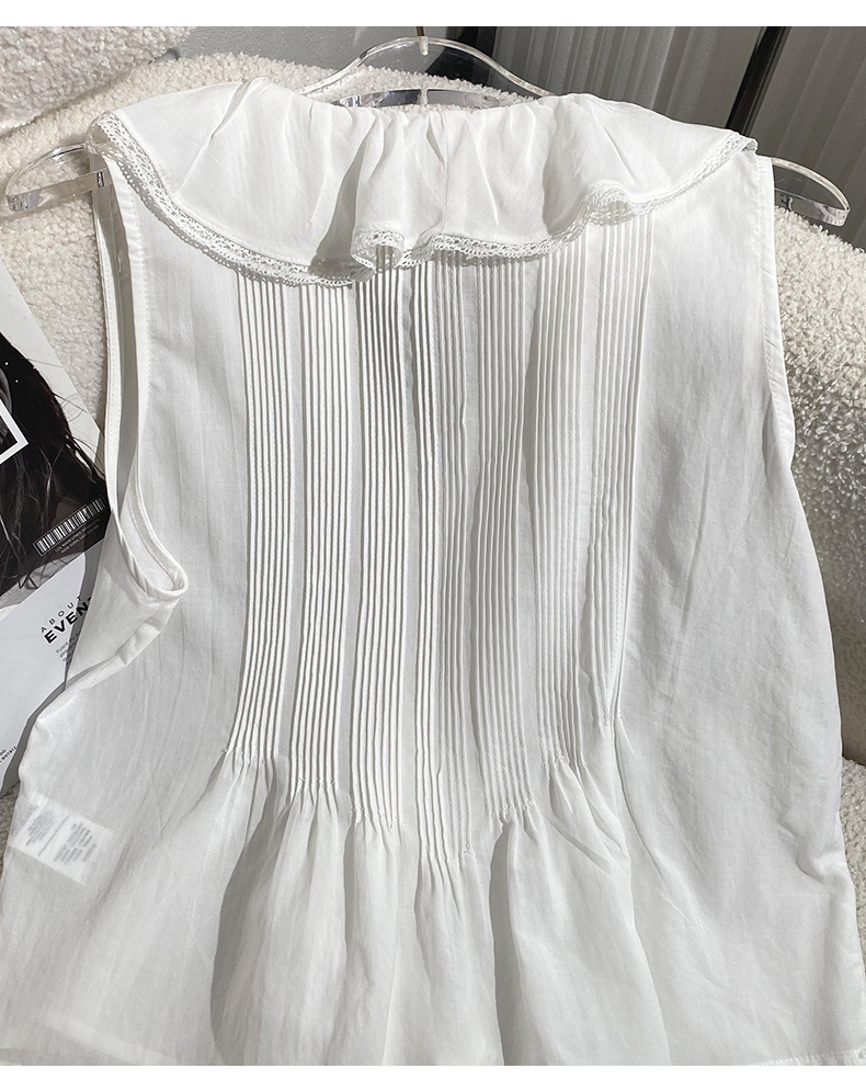 여름 새로운 화이트 레이스 바느질 러플 칼라 탑 루즈 올매치 민소매 셔츠