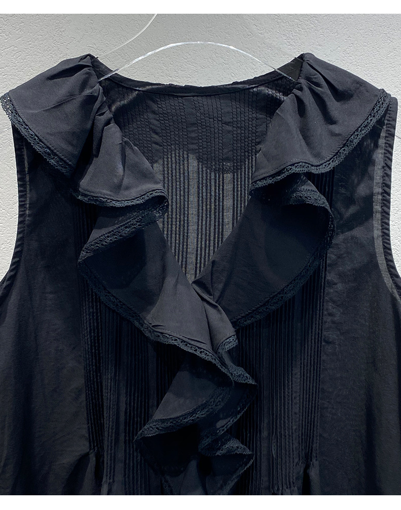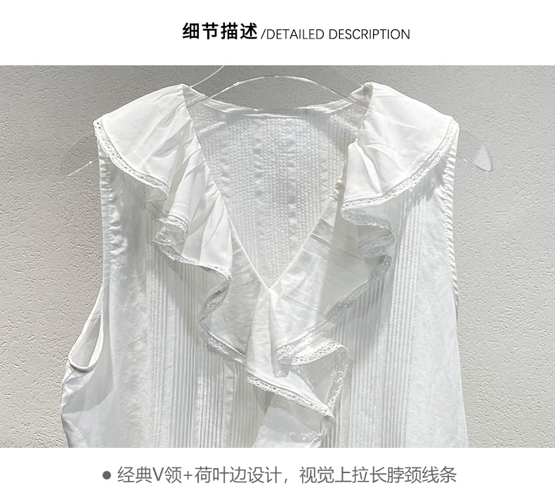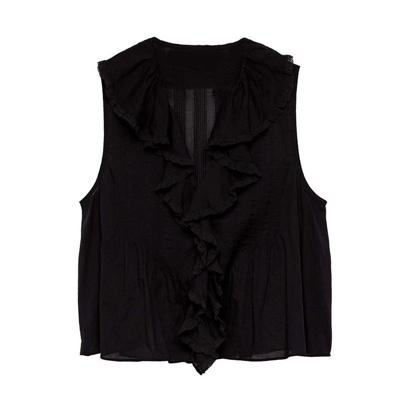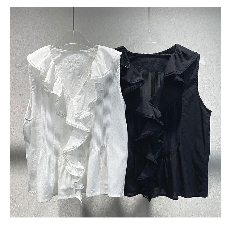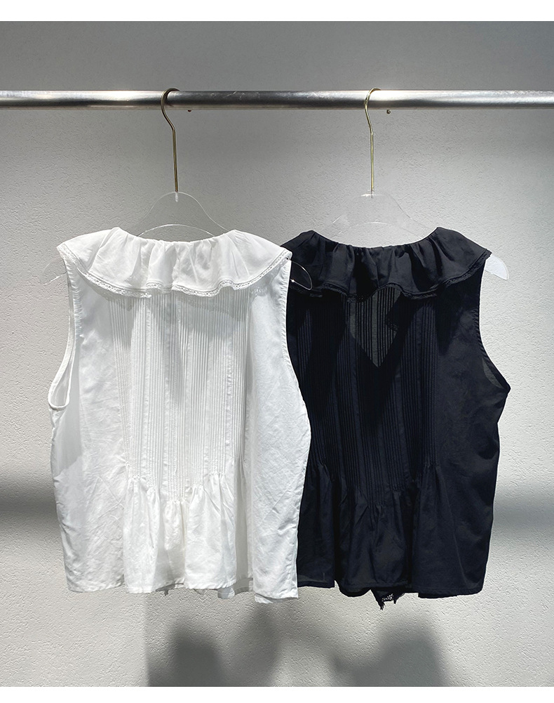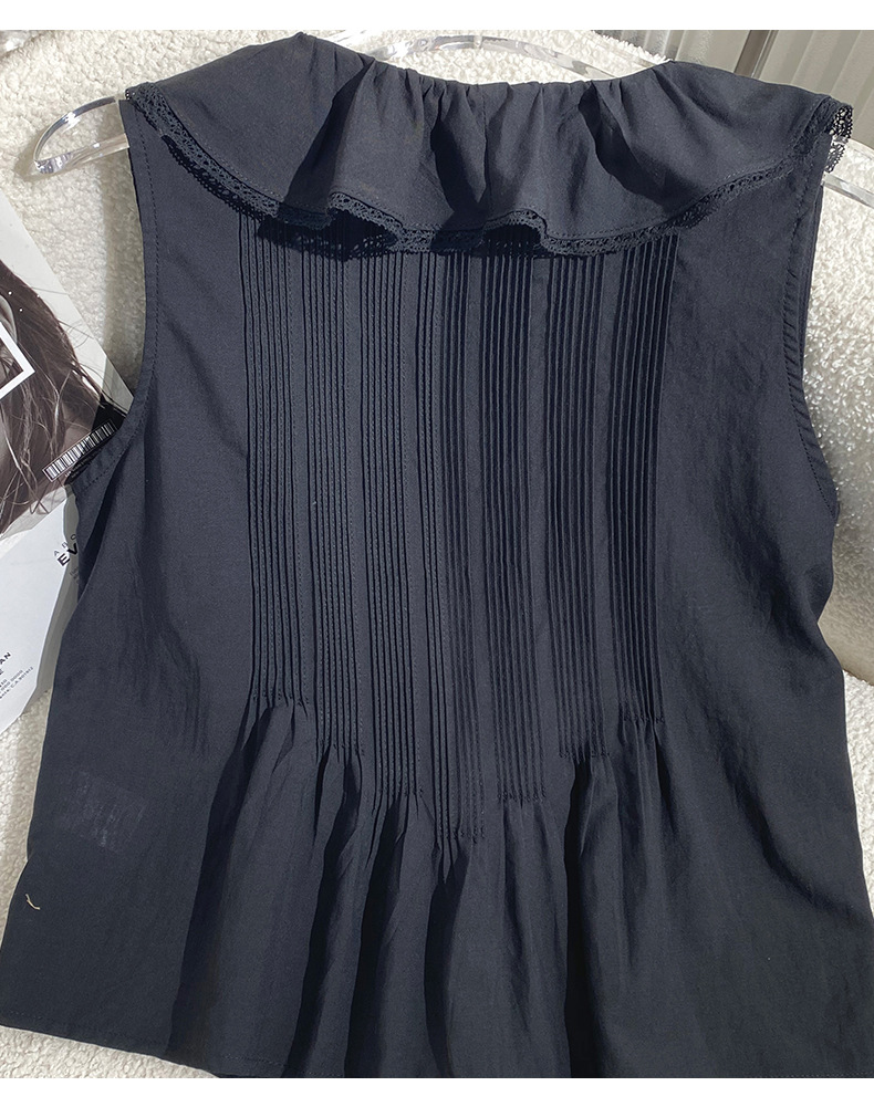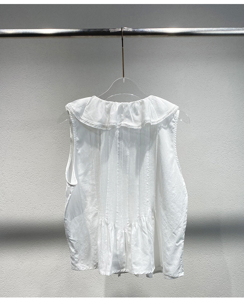 여름 새로운 화이트 레이스 바느질 러플 칼라 탑 루즈 올매치 민소매 셔츠