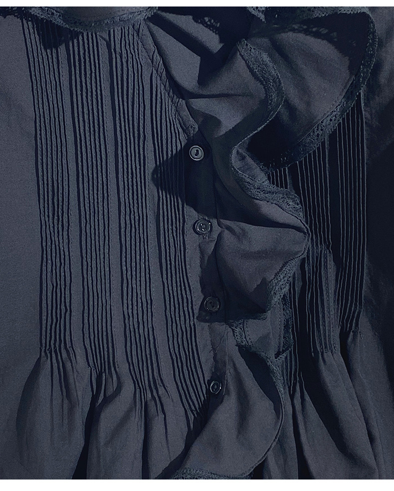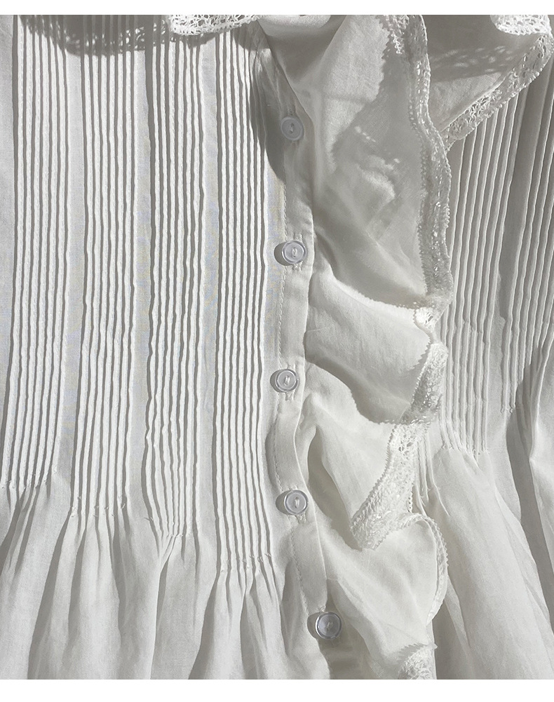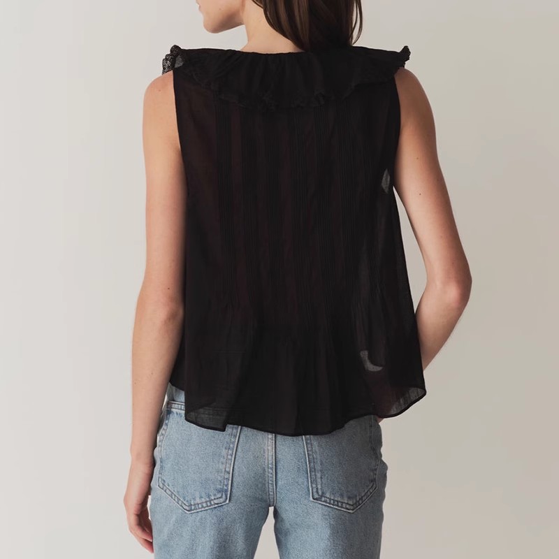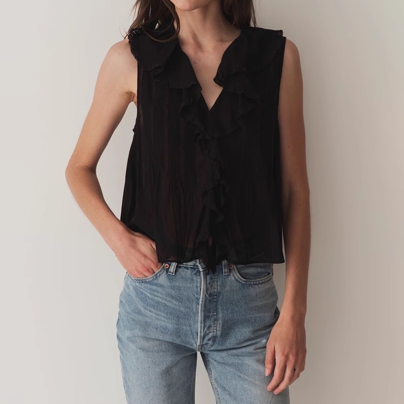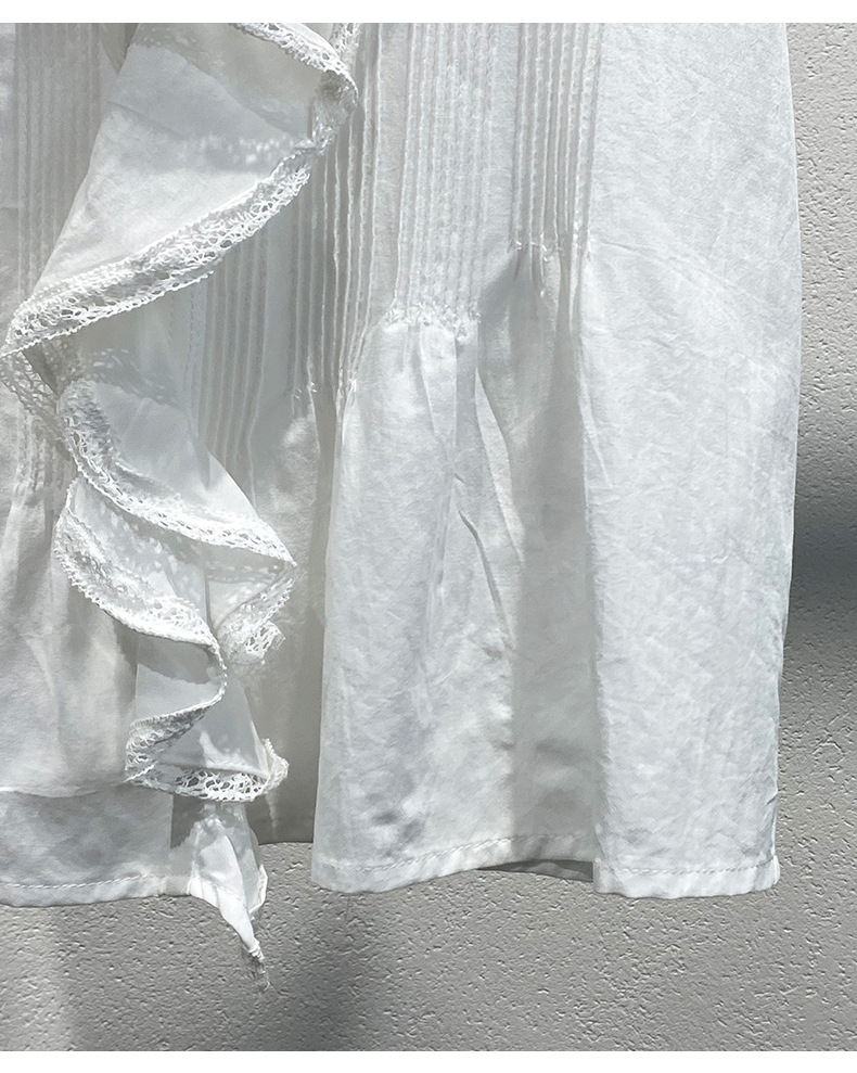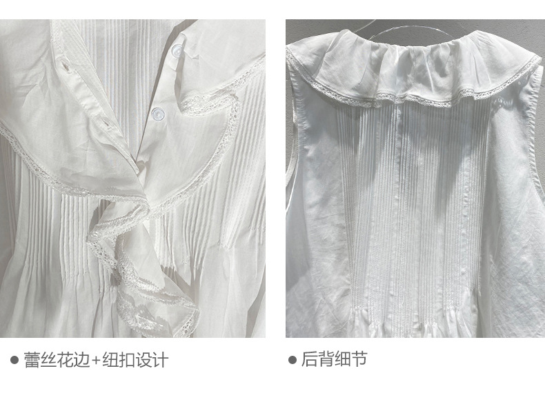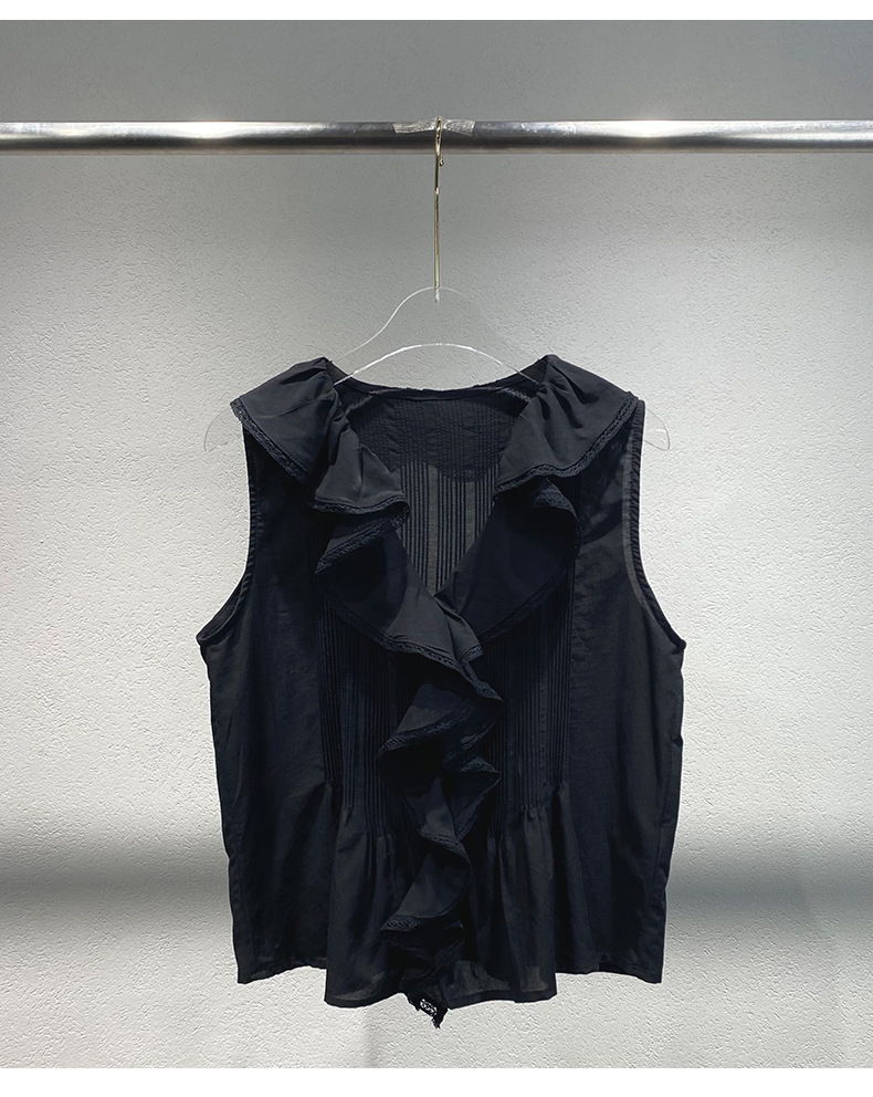 여름 새로운 화이트 레이스 바느질 러플 칼라 탑 루즈 올매치 민소매 셔츠