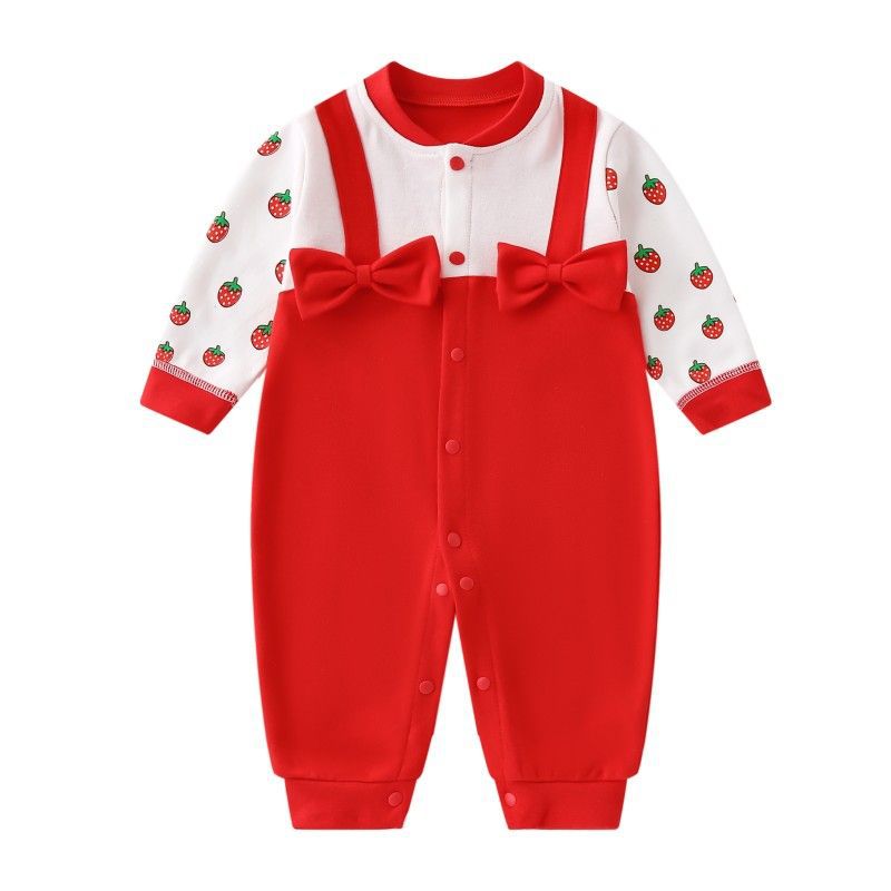 • 酒红色 纯棉-背带蝴蝶结草莓