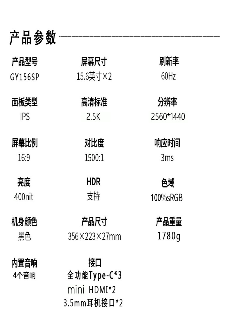 • 15.6인치 2560*1440 상하 듀얼 스크린 IPS/Type-C+HDMI 인터페이스(알루미늄 합금 쉘)