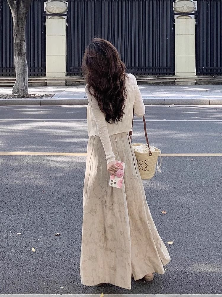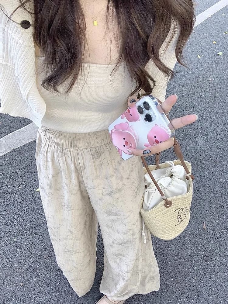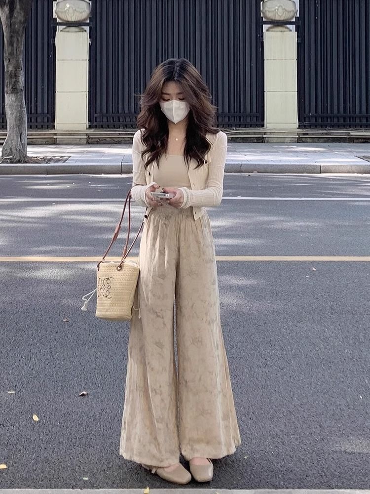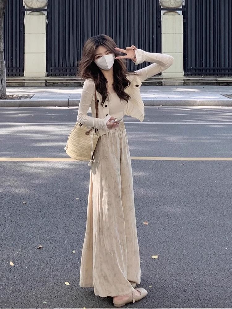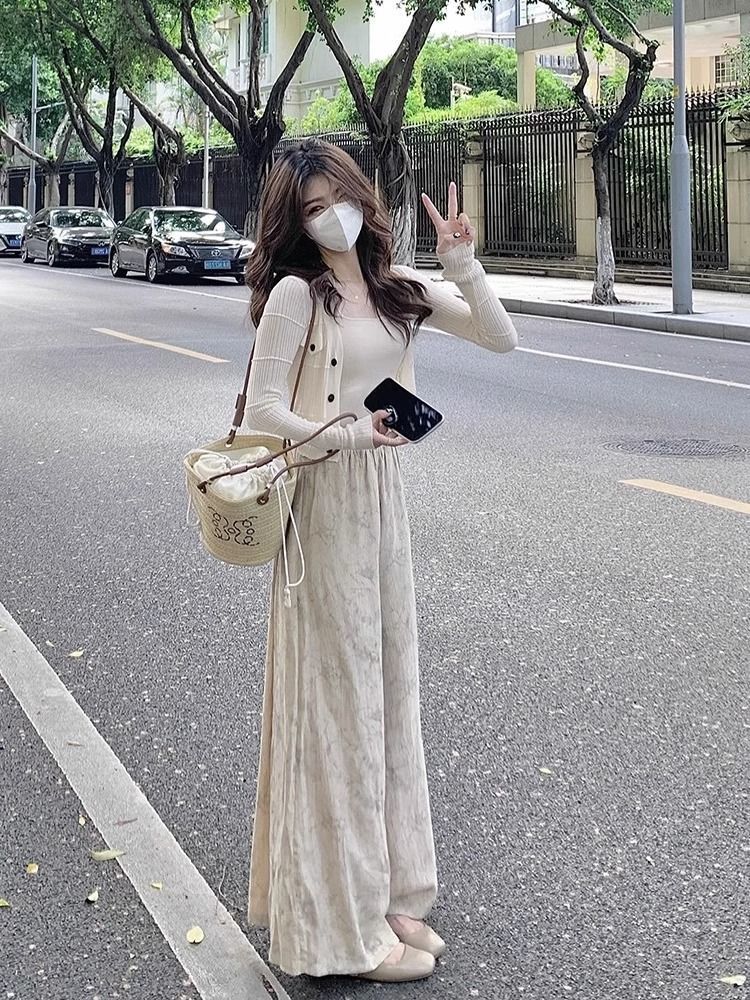 2024 여름 부드러운 디자인 감각 긴 소매 니트 카디건 인쇄 넓은 다리 바지 3 조각 세트 여성