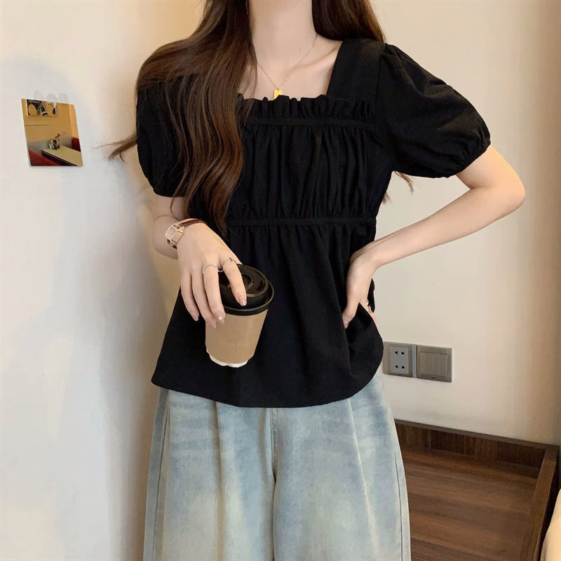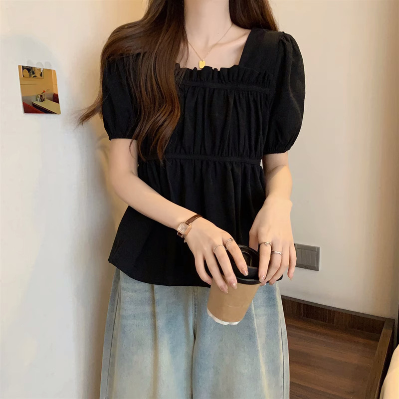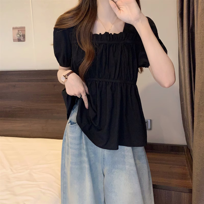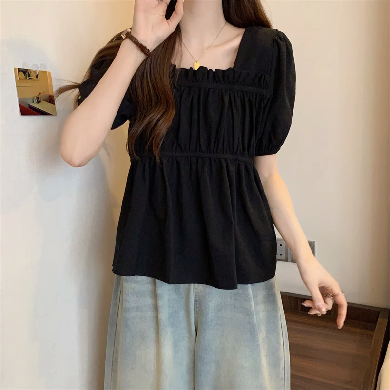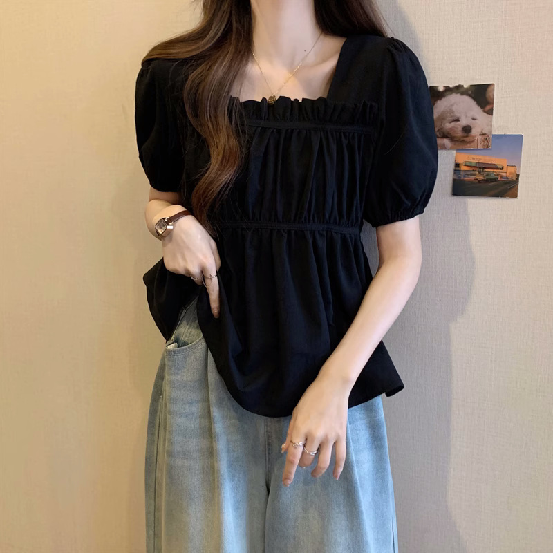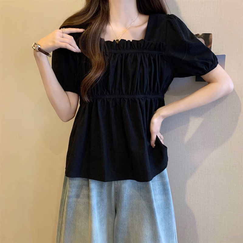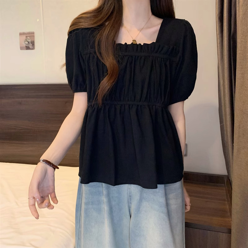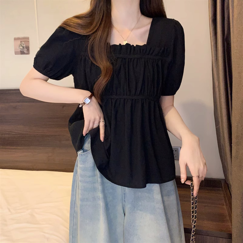 플러스 사이즈 여성 스퀘어 칼라 팬티 반팔 쉬폰 셔츠 여성 여름 디자인 센스 루즈 벨리 커버링 탑스토어 가기