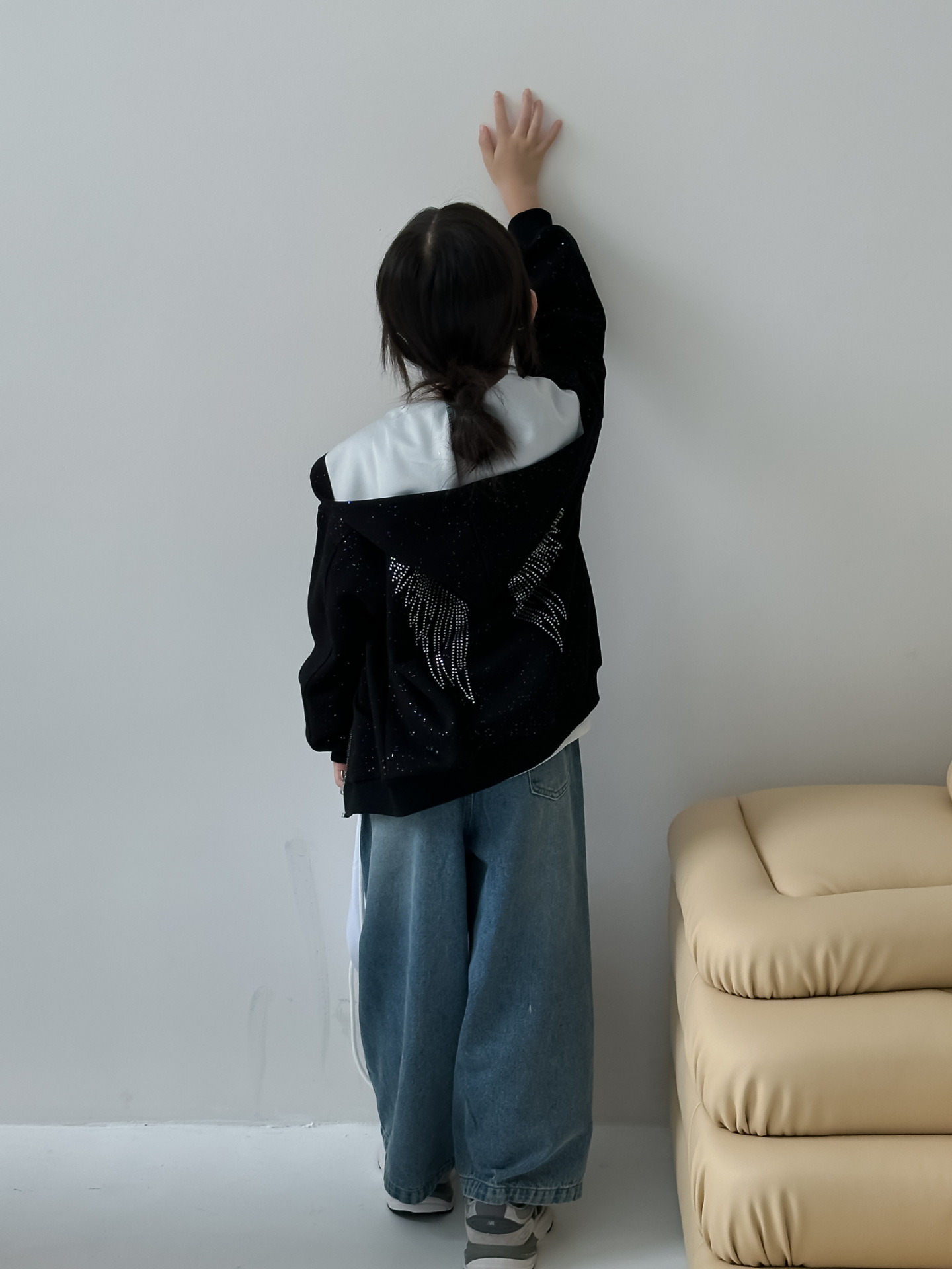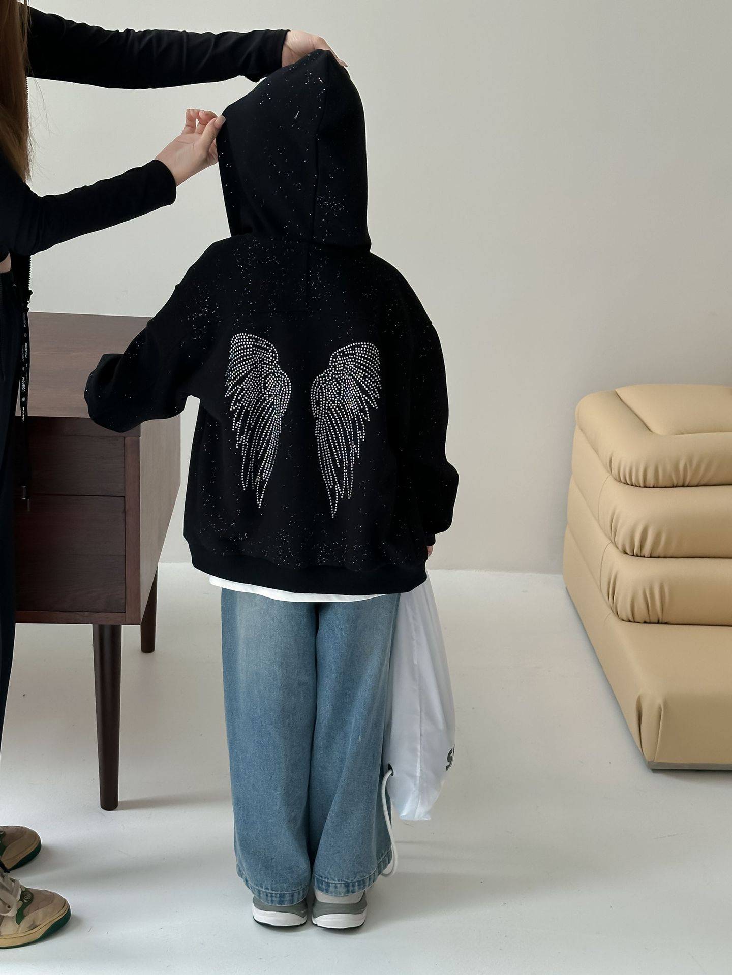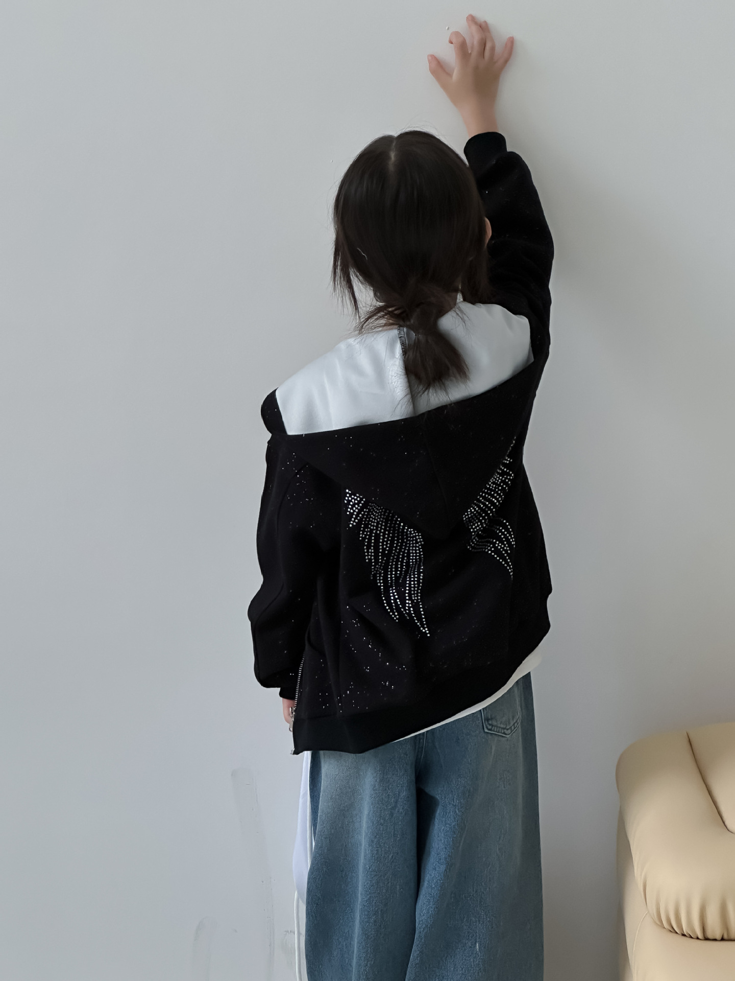 어린이 코트 2024 가을 어린이 스팽글 날개 후드 코트 중립 스타일 소년과 소년의 트렌디 한 핫 드릴링 카디건 탑
