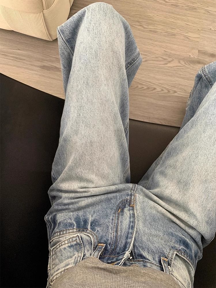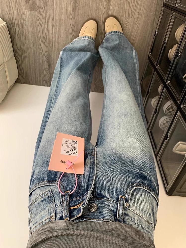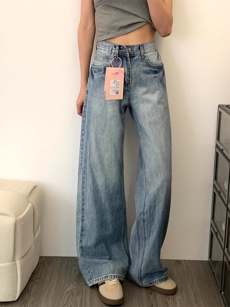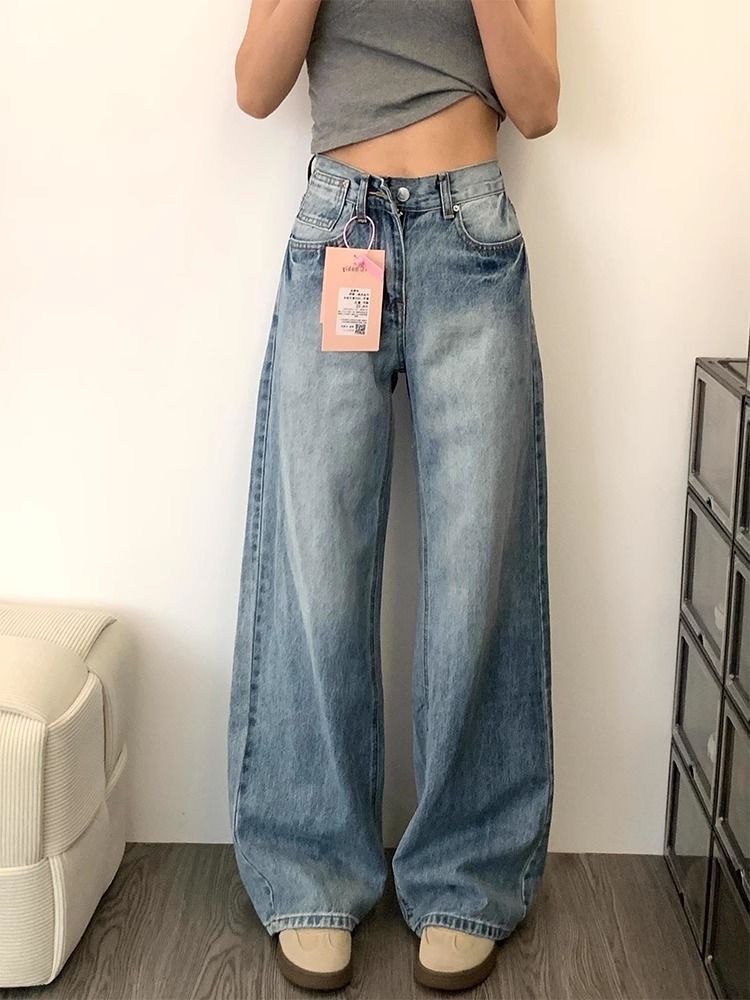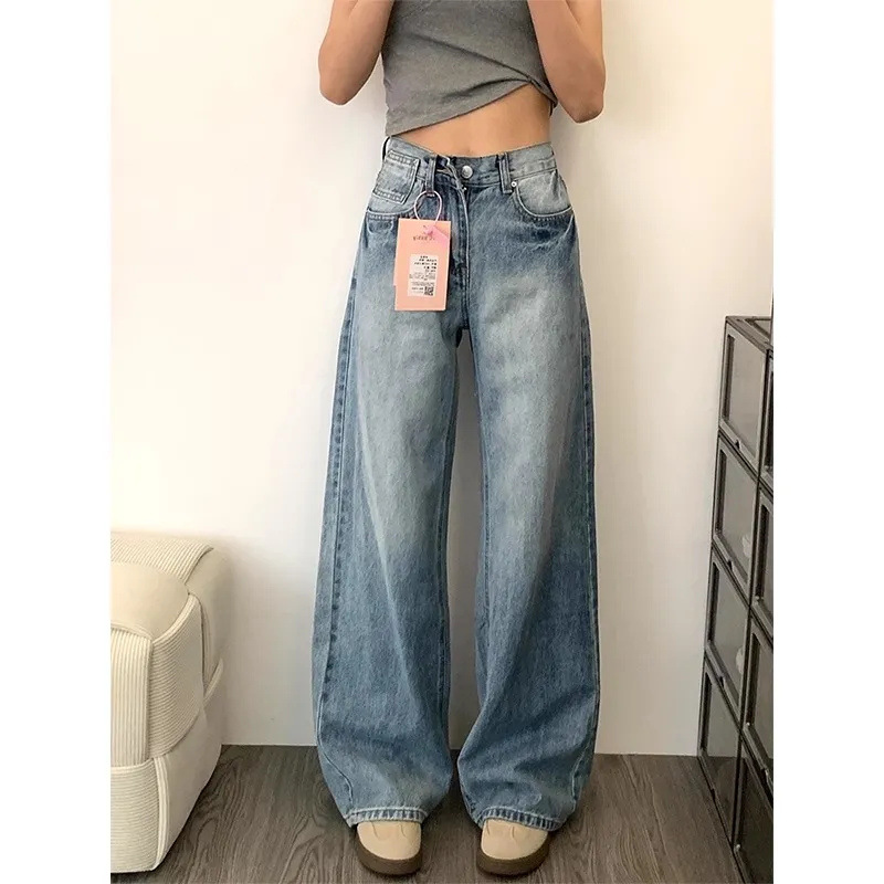 높은 허리 아메리칸 스타일 레트로 와이드 레그 청바지 여성 여름 2024 새로운 스타일 스트레이트 올 매치 느슨한 슬림 핏 걸레 바지스토어 가기