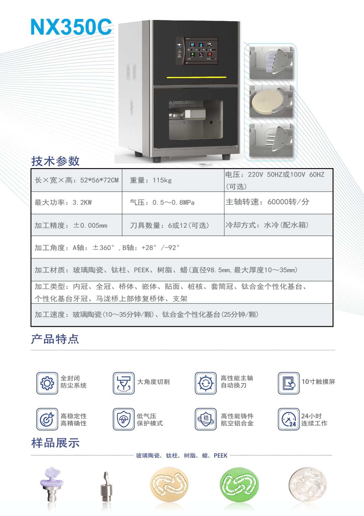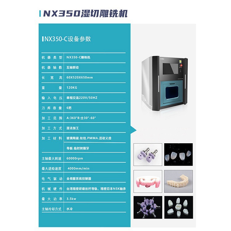 主要加工:玻璃陶瓷、钛柱、PMMA、活动义齿、导板、临时树脂牙