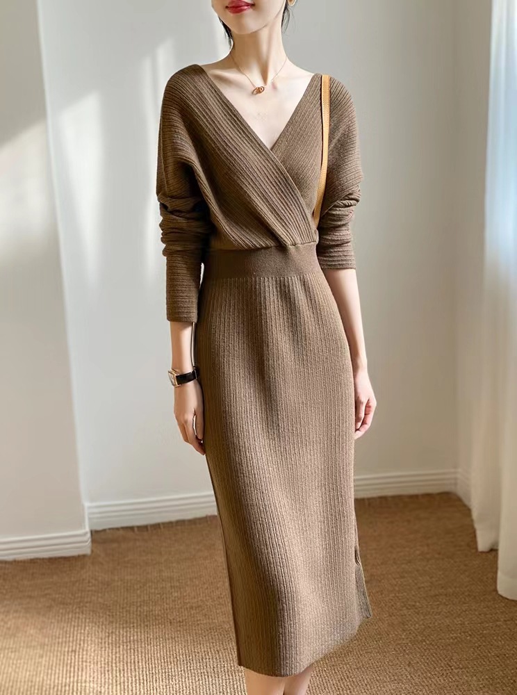 꽉 허리 슬림 크로스 넥 니트 원피스 여성용 2024 가을 및 겨울 코트 V-Neck 롱베이스 스웨터 원피스스토어 가기