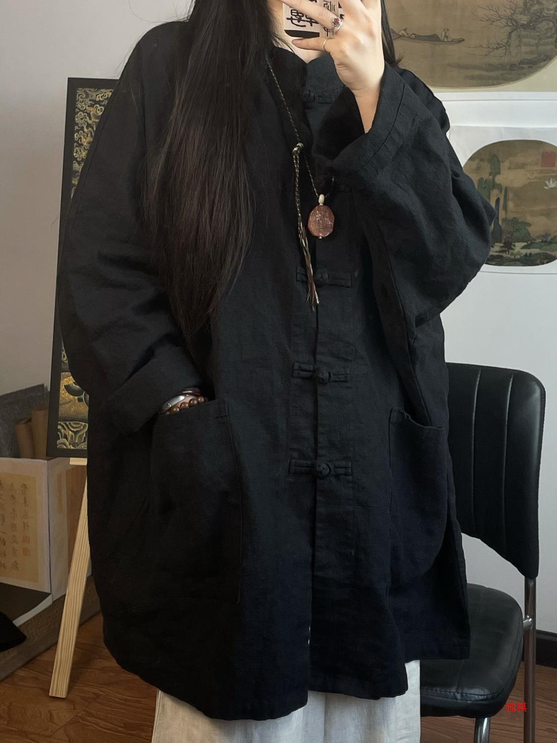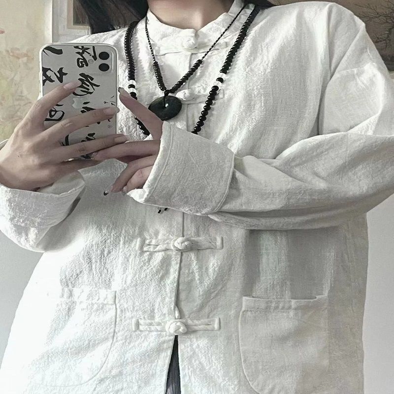 봄 2024 새로운 중국 스타일 국가 스타일 최고 선 차 옷 쿨 버클 느슨한 코트 코튼 리넨 셔츠 긴 소매스토어 가기
