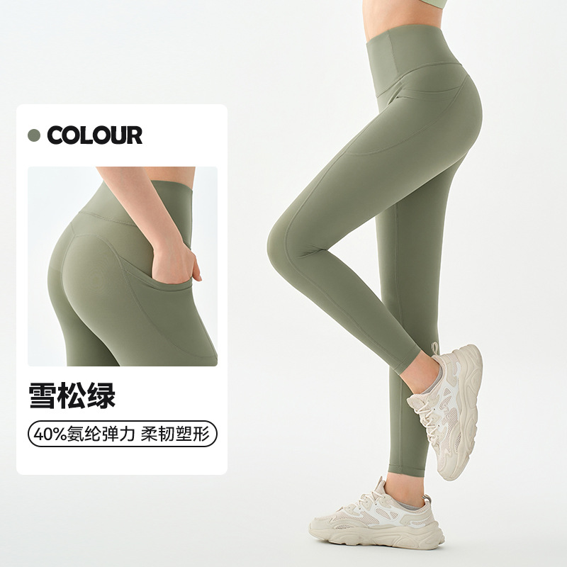 Nulux 고강도 스포츠 스타킹 하이 웨이스트 배 컨트롤 요가 바지 여성 유럽과 미국의 사이드 포켓 복숭아 엉덩이 피트니스 바지