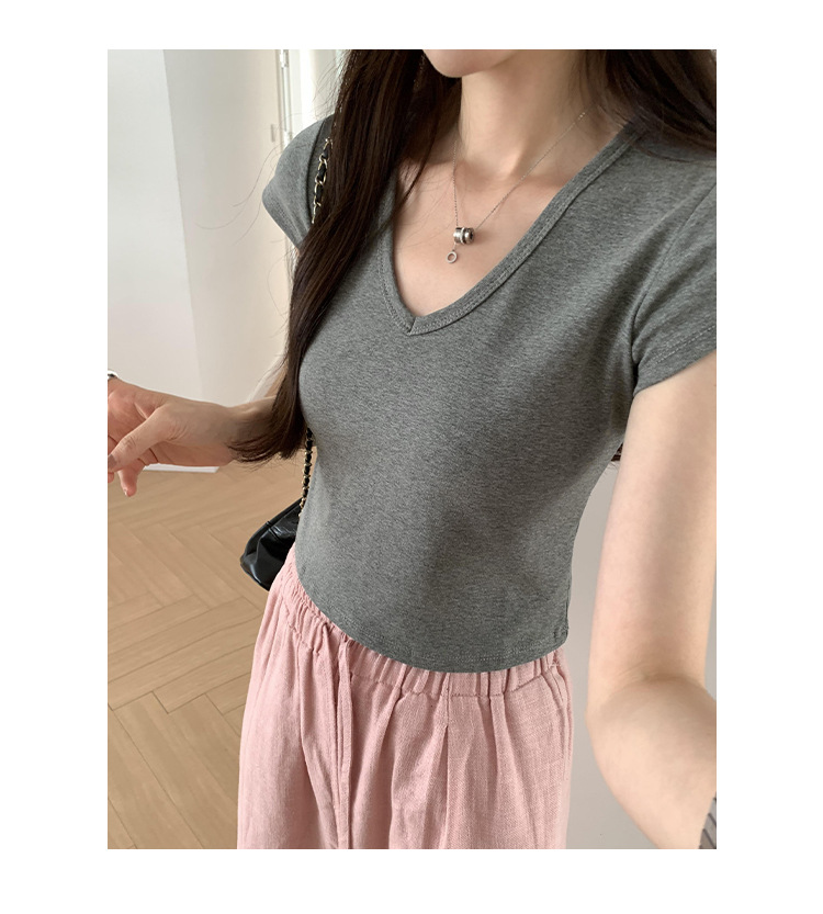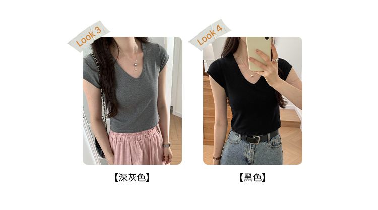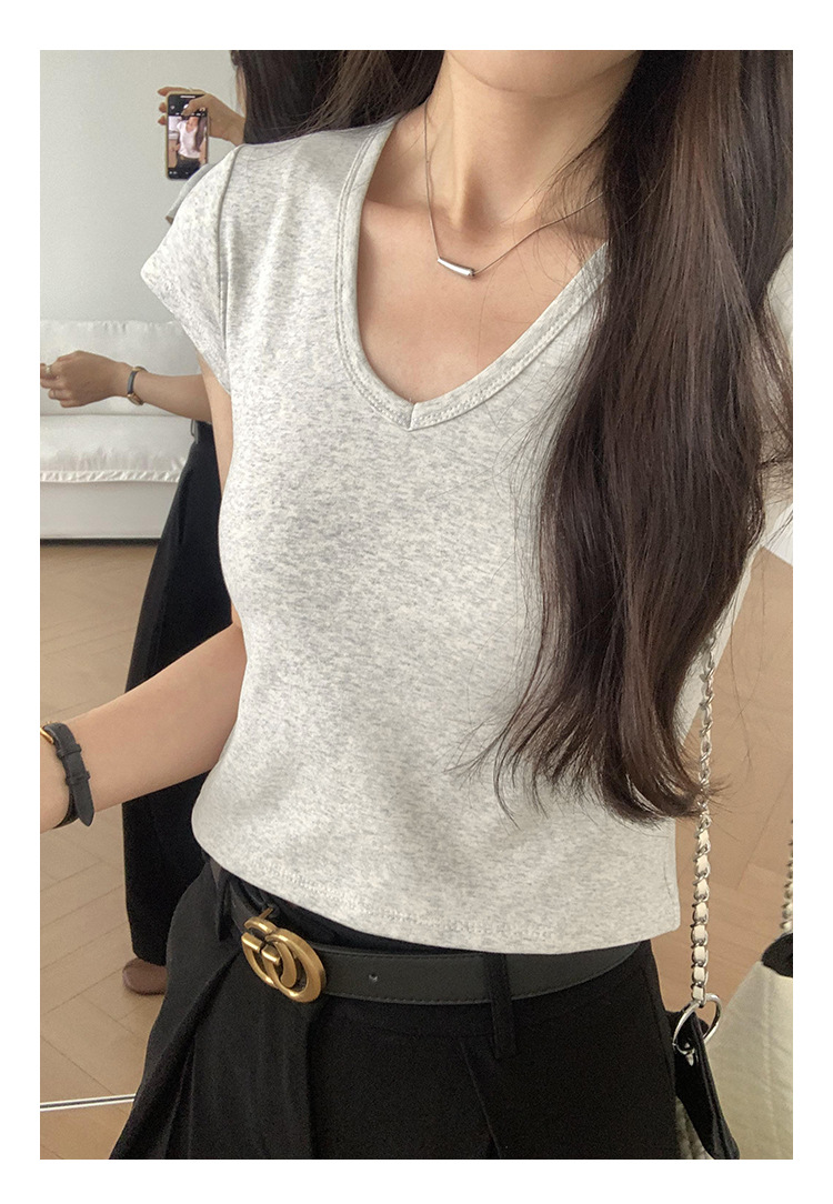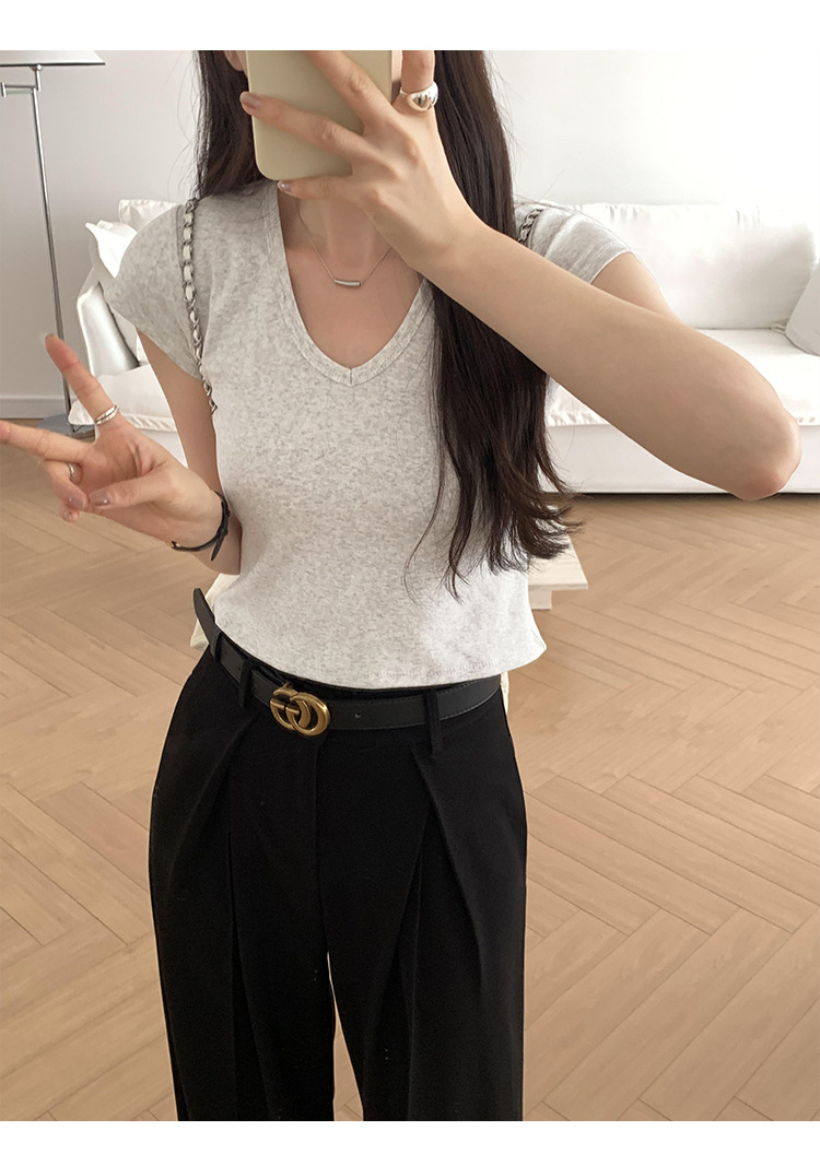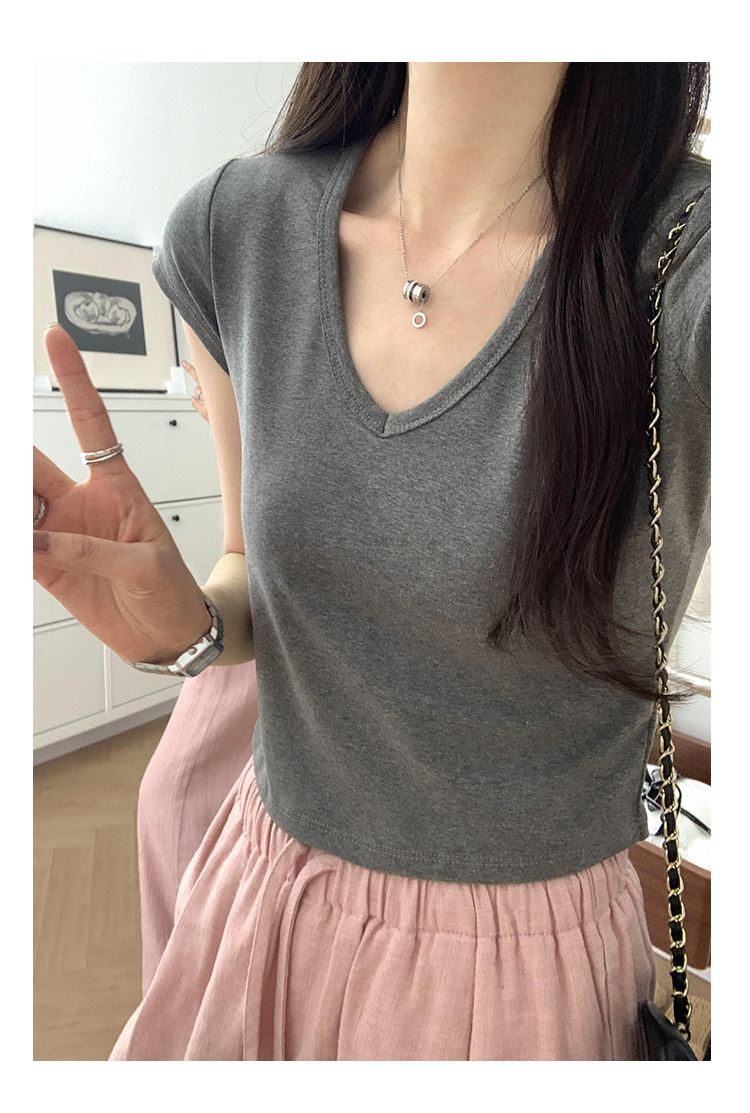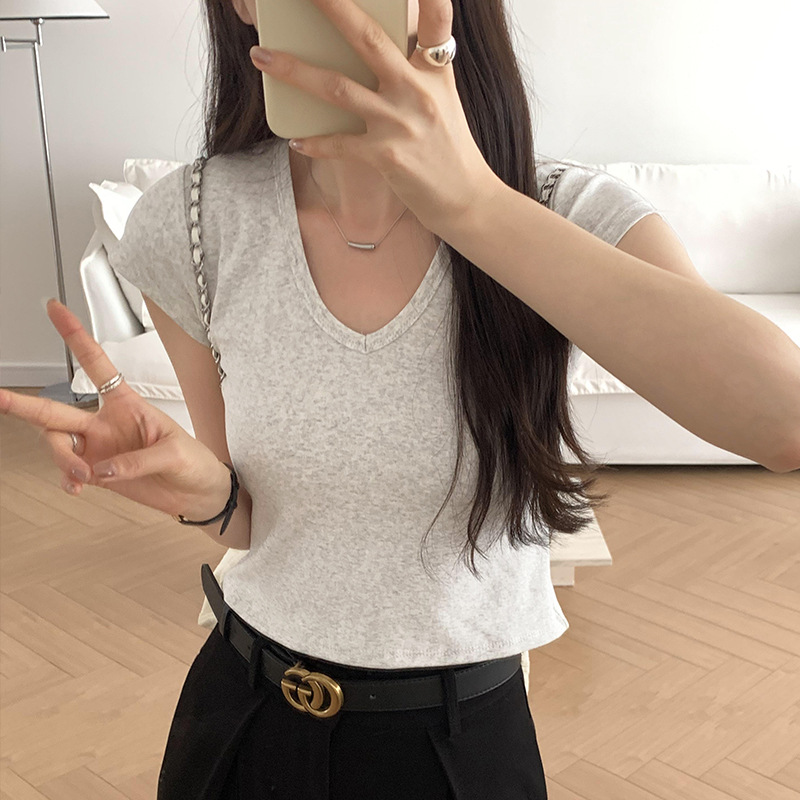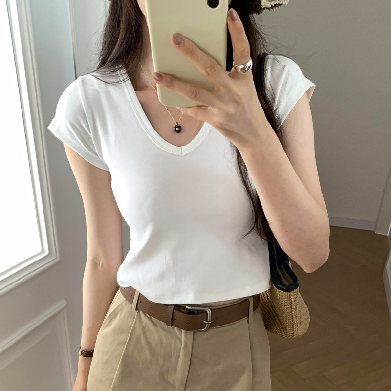 우아한 슬림 어깨 V-넥 반팔 티셔츠 여성 여름 2024 새로운 핫 스타일 아름다운 틈새 독특한 세련된 탑스토어 가기