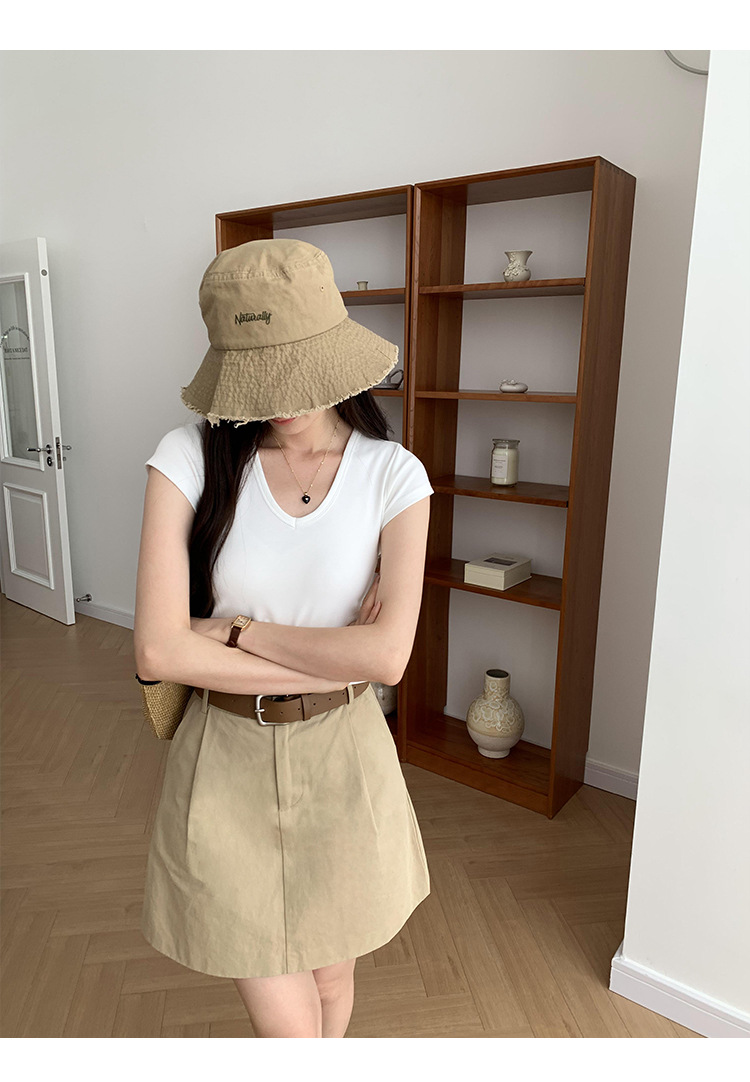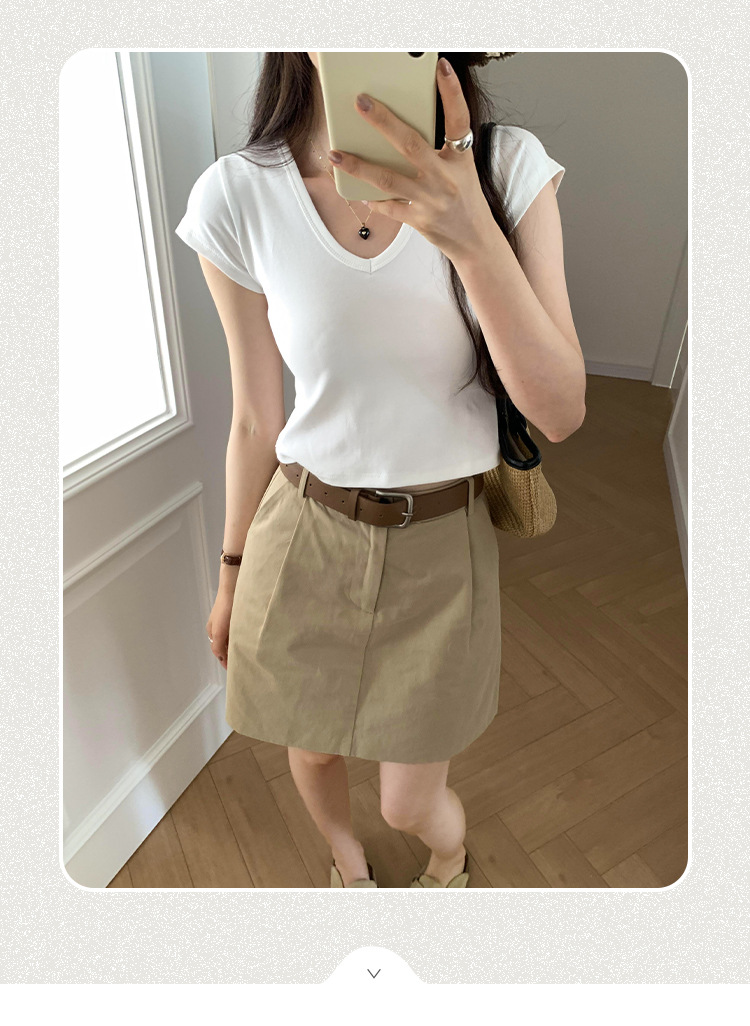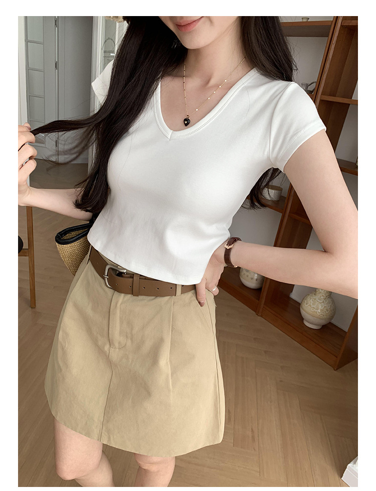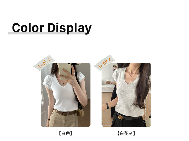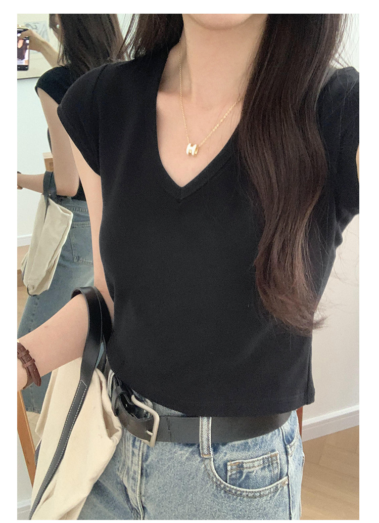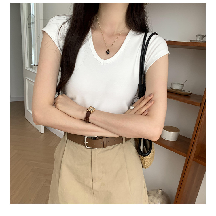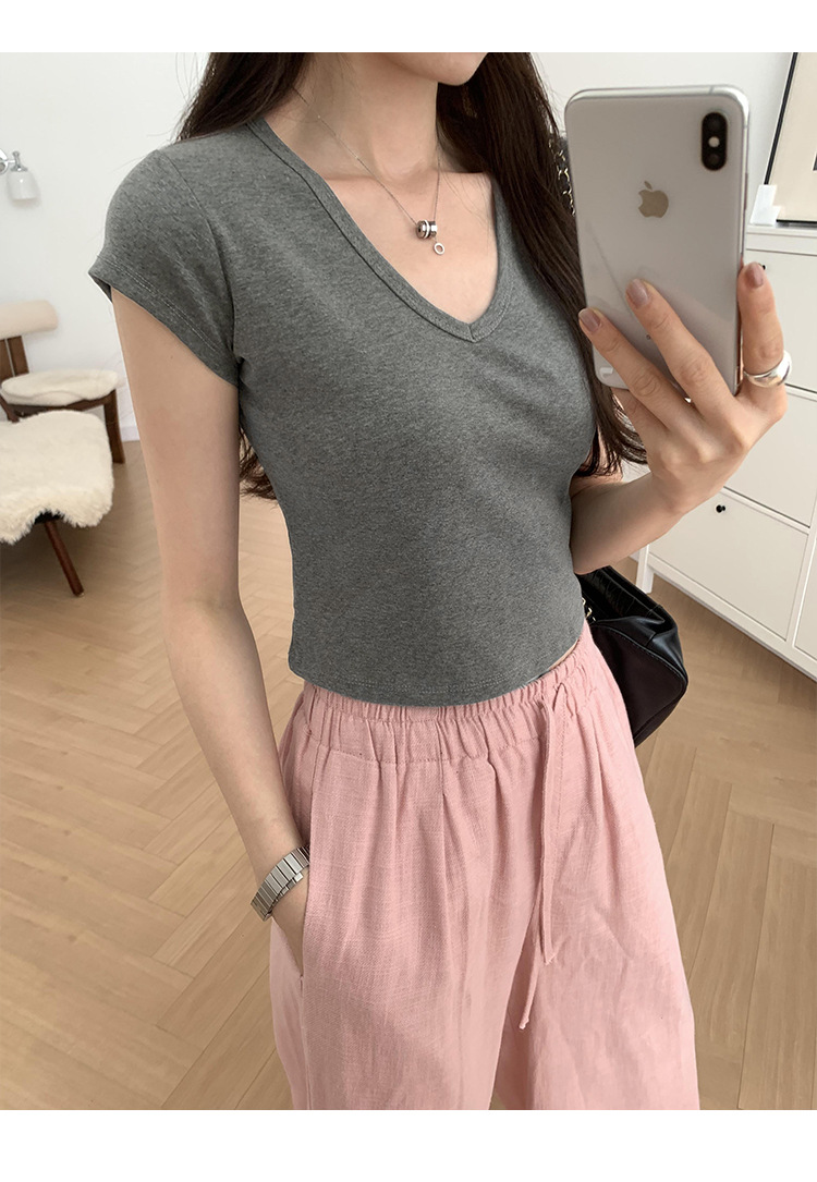 우아한 슬림 어깨 V-넥 반팔 티셔츠 여성 여름 2024 새로운 핫 스타일 아름다운 틈새 독특한 세련된 탑스토어 가기