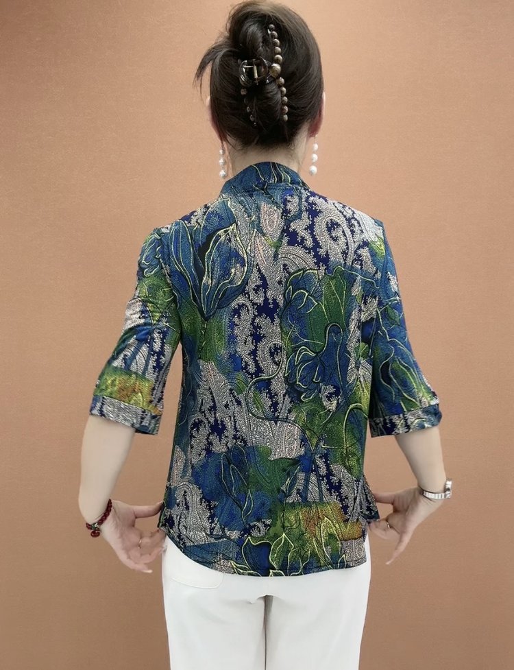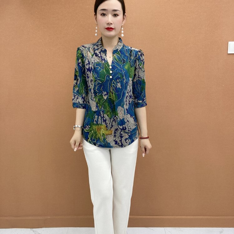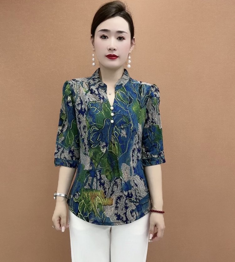 여름 중년 어머니 어깨 셔츠 새로운 2024 반팔 유행 루즈 티셔츠 편안한 스트레치 중소매 셔츠스토어 가기