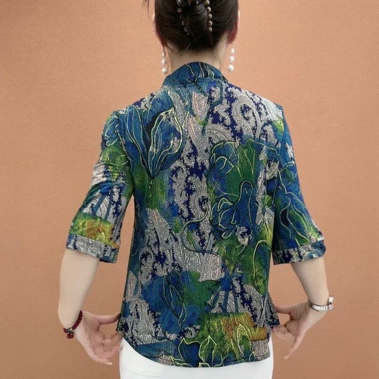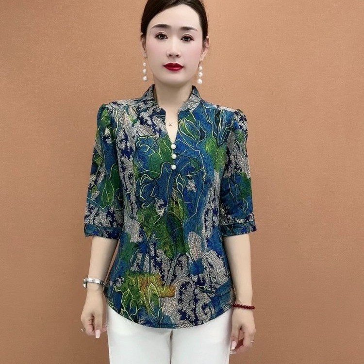 여름 중년 어머니 어깨 셔츠 새로운 2024 반팔 유행 루즈 티셔츠 편안한 스트레치 중소매 셔츠