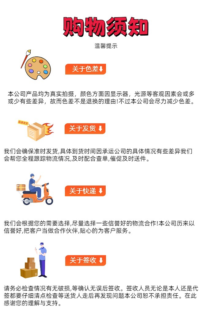 本店包邮产品如果需要拦截退回, 拒收或者退货退款, 造成交易不成功的情况下, 申请售后的时候如若已经产生单号,请扣除发货运费(运费和客服协商,正常2.5-5元), 本司不承担发出运费 , 请知悉, 拍下即作为认同此项!