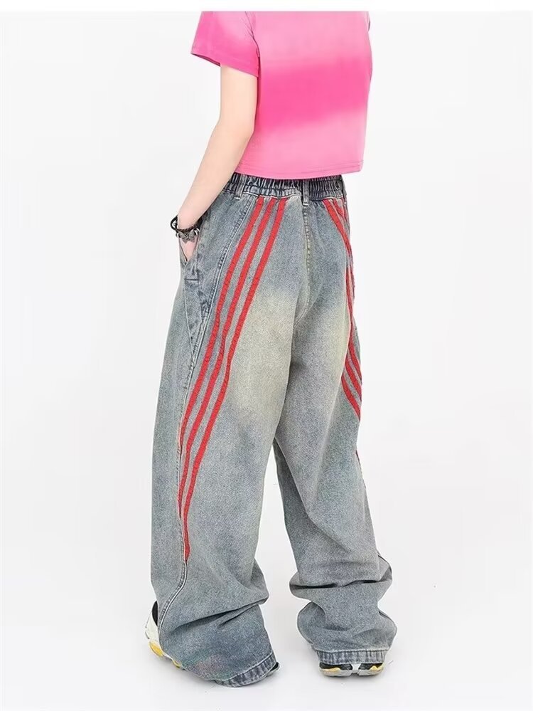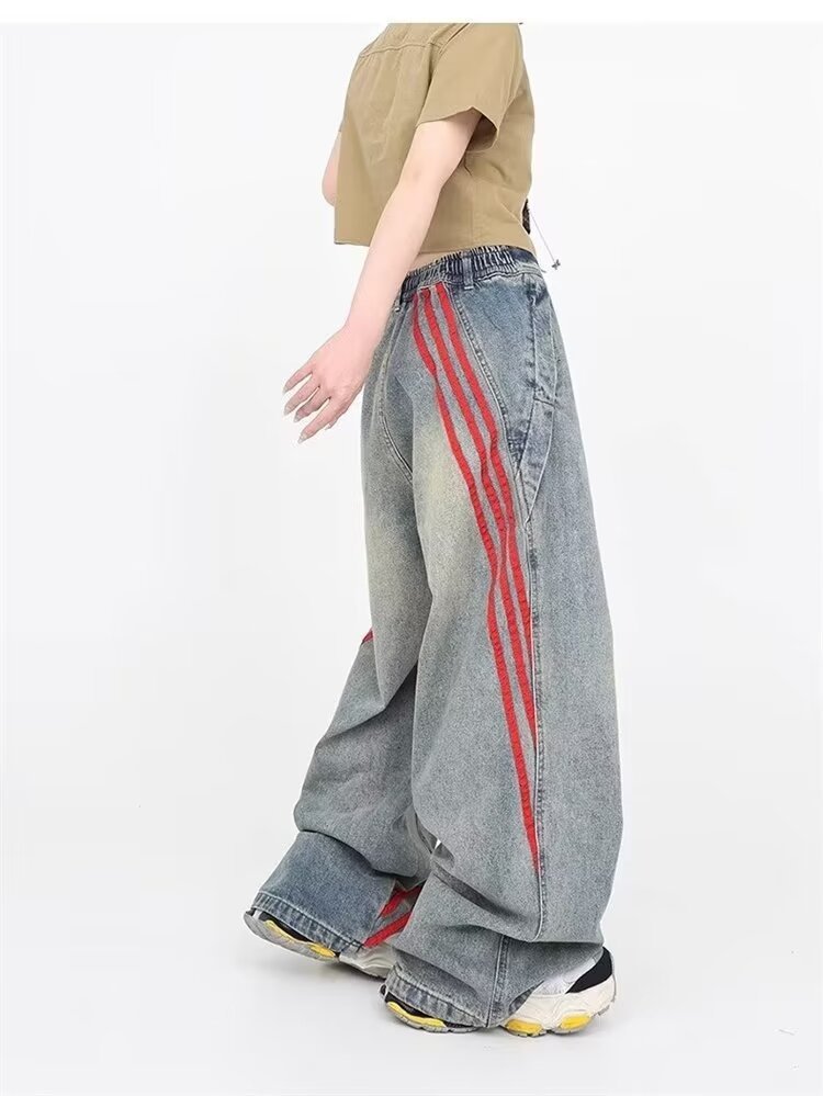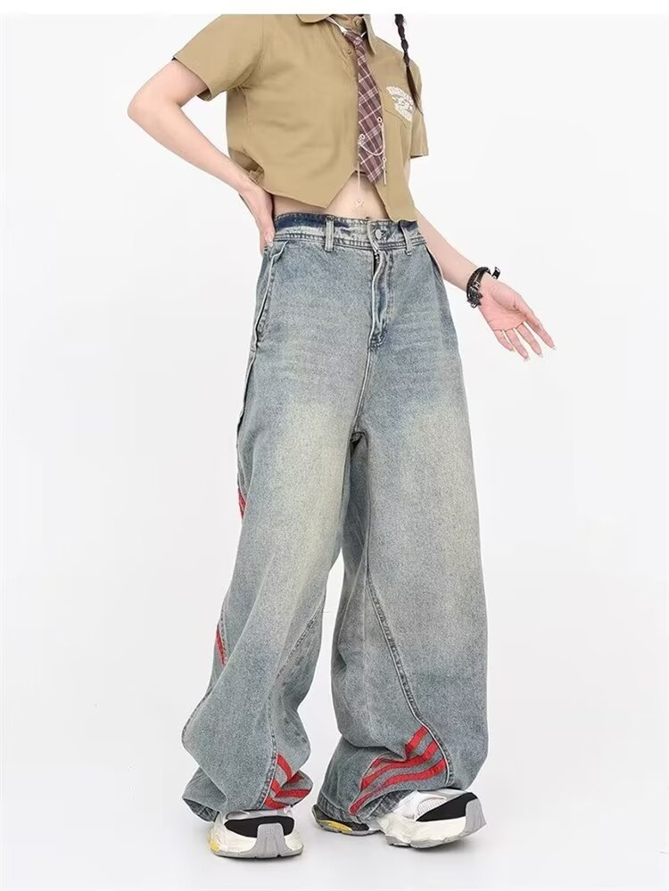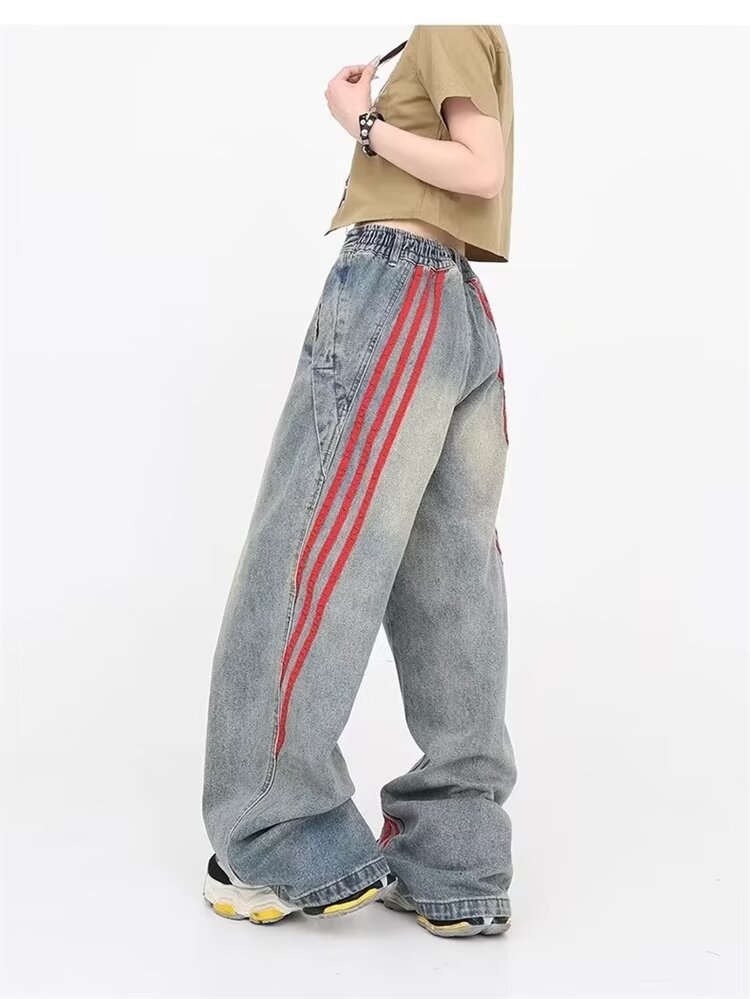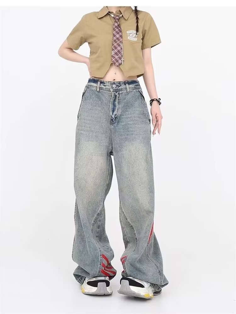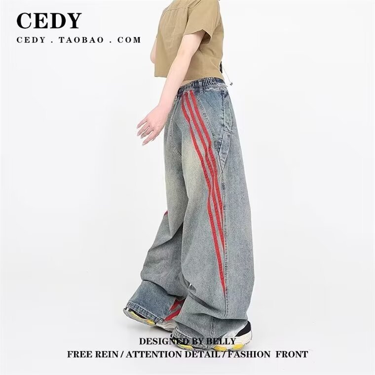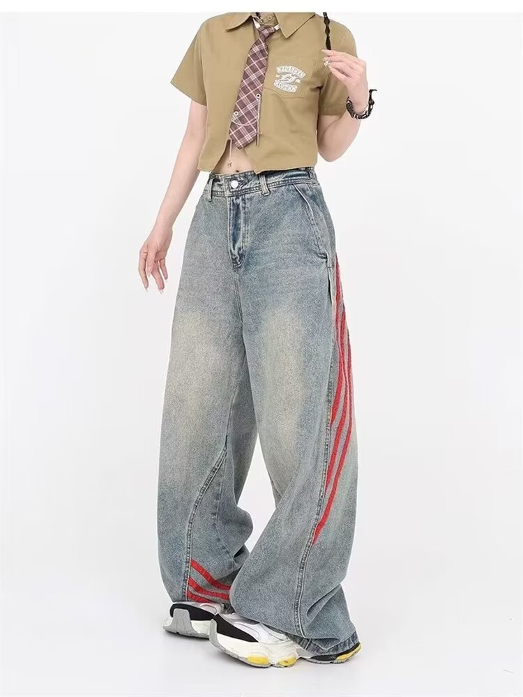 미국식 바이브 빈티지 줄무늬 스티칭 청바지 여성 하이 스트리트 패션 브랜드 루즈 스트레이트 캐주얼 작업복 와이드 레그 바지