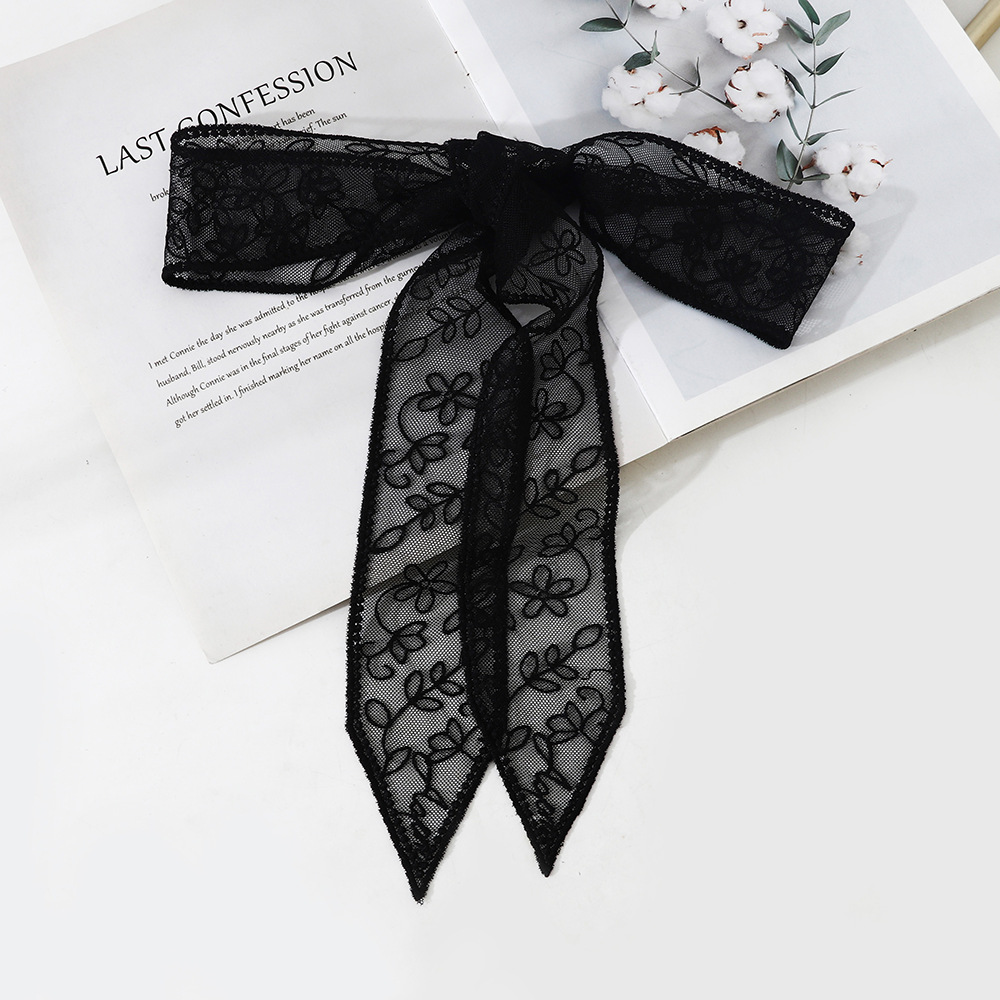 • 한국 스타일 우아한 레트로 레이스 롱 벨트 실크 스카프 블랙