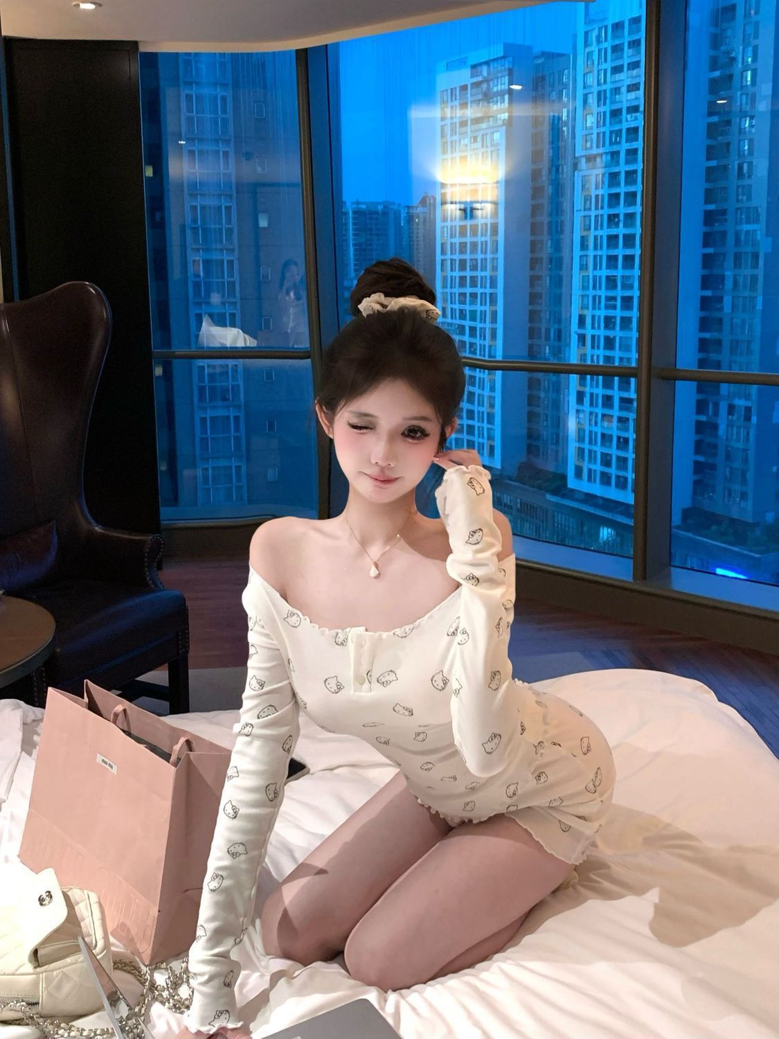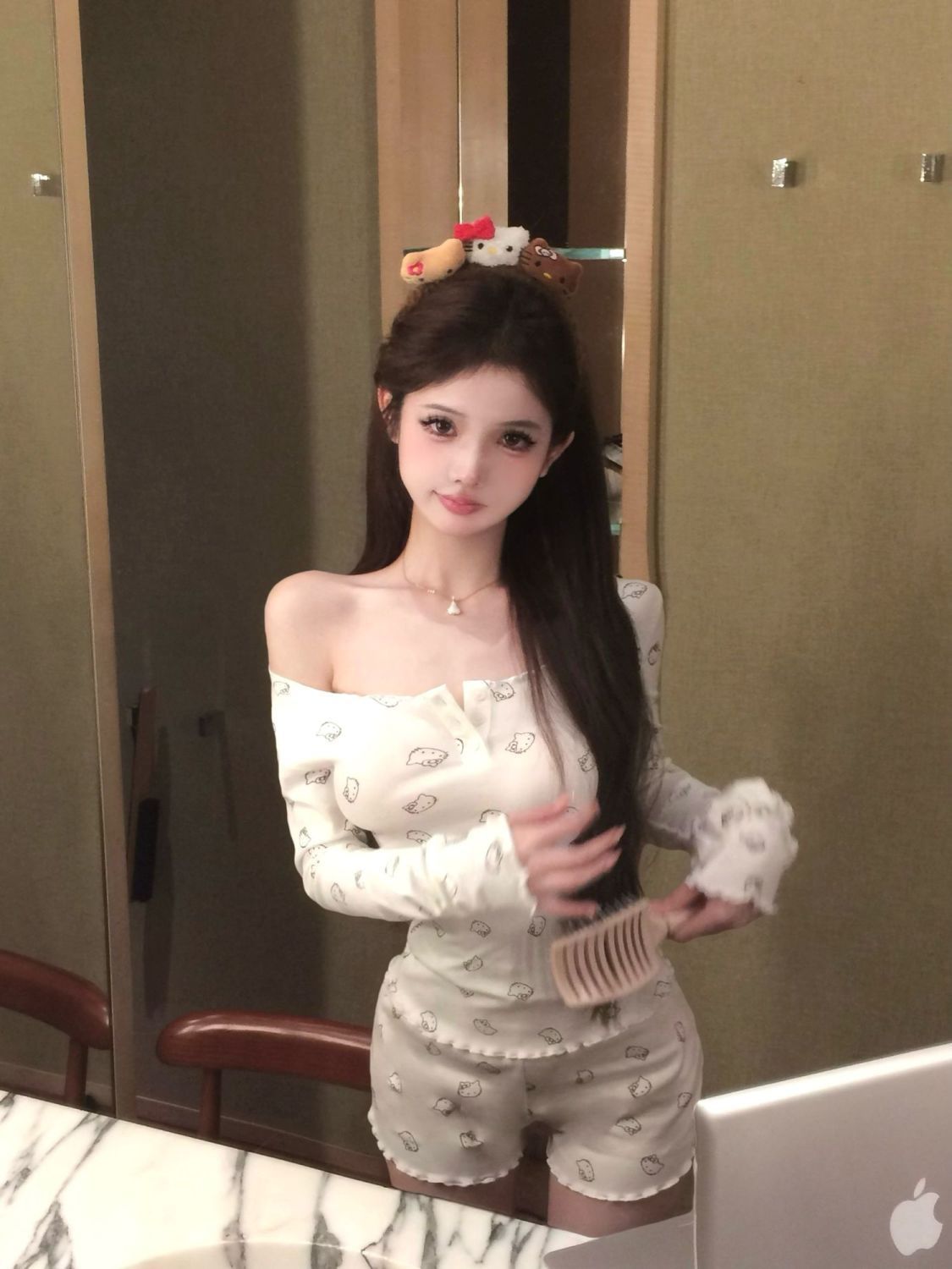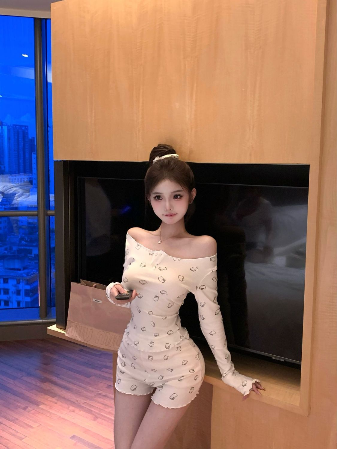 [공장 재고] 순수한 욕망 오프 숄더 만화 프린트 긴팔 티셔츠 여성 여름 세트 캐주얼 반바지 투피스 세트