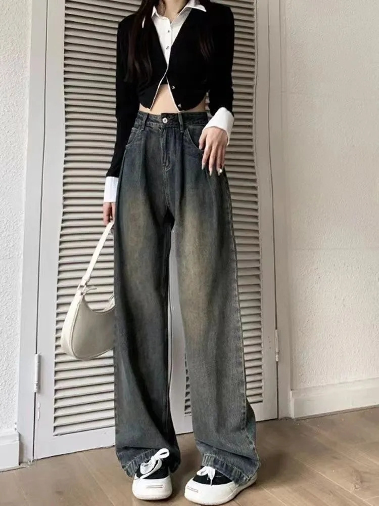 시멘트 회색 넓은 다리 청바지 여성의 봄과 가을 2024 새로운 스타일 작은 느슨한 복고풍 플러스 사이즈 높은 허리 스트레이트 바지스토어 가기