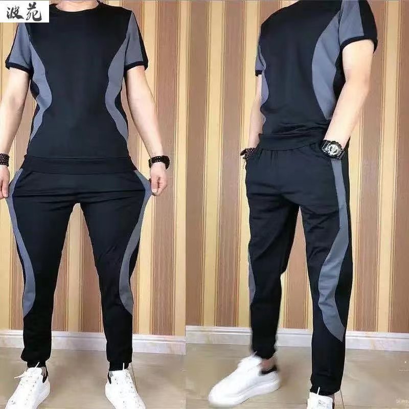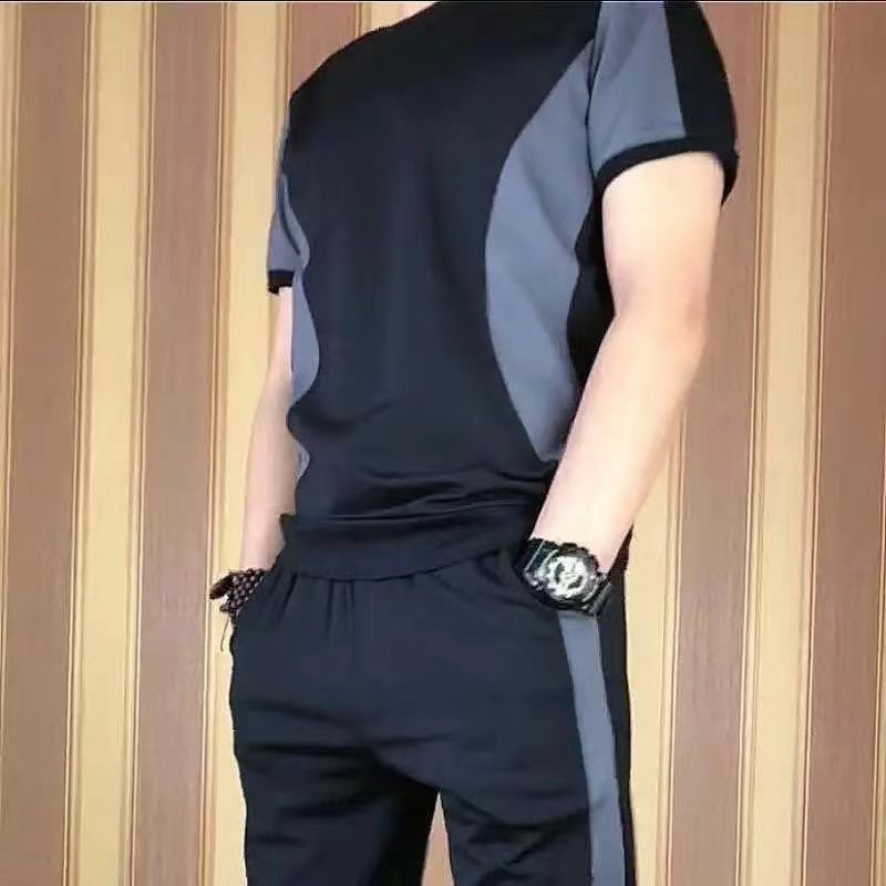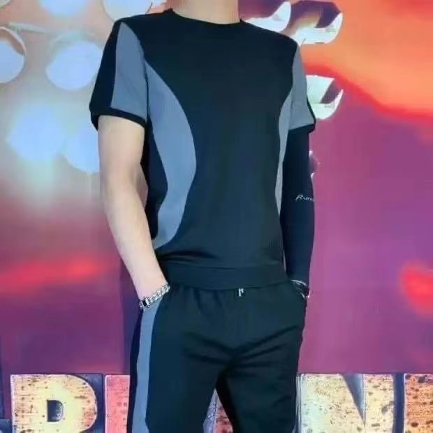 여름 남성 반팔 티셔츠 아이스 실크 얇은 2023 새로운 패션 브랜드 캐주얼 세트 세트 유행 아이스 느낌 옷