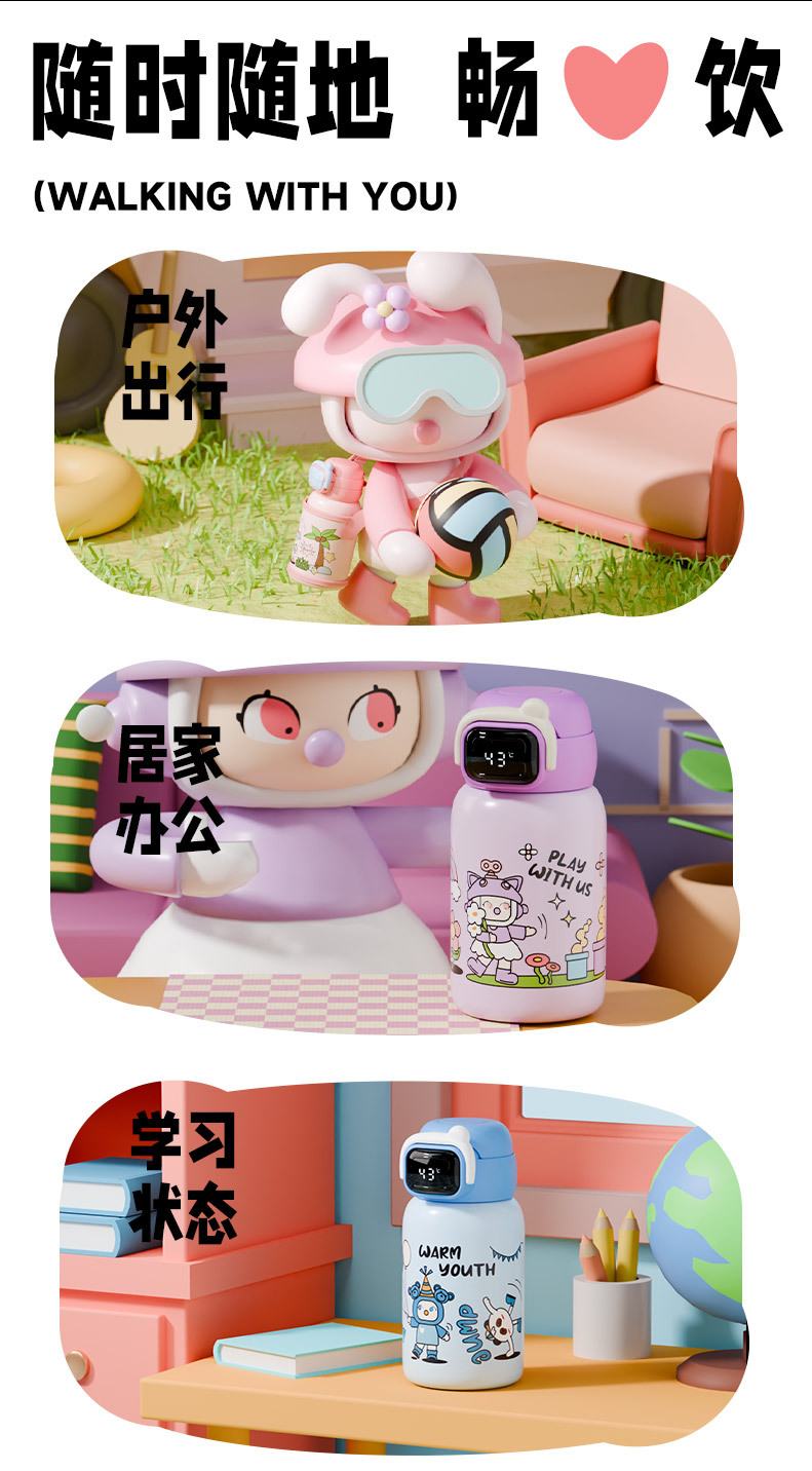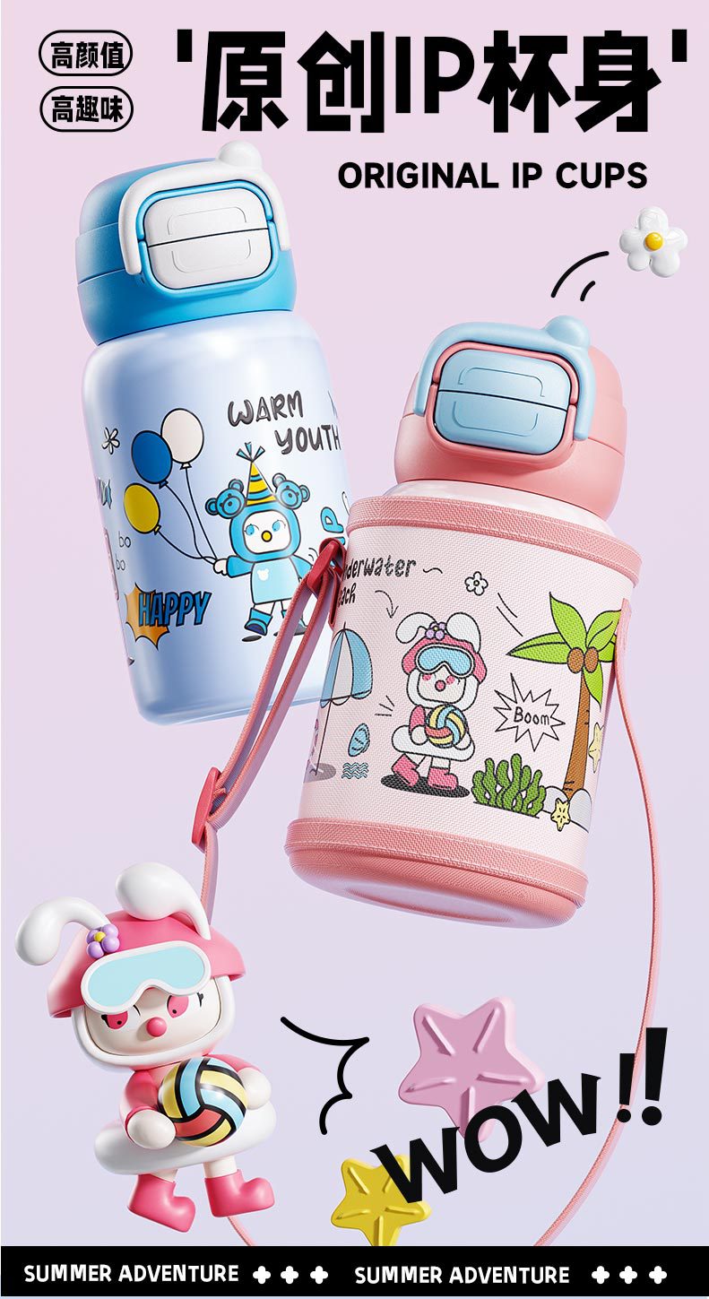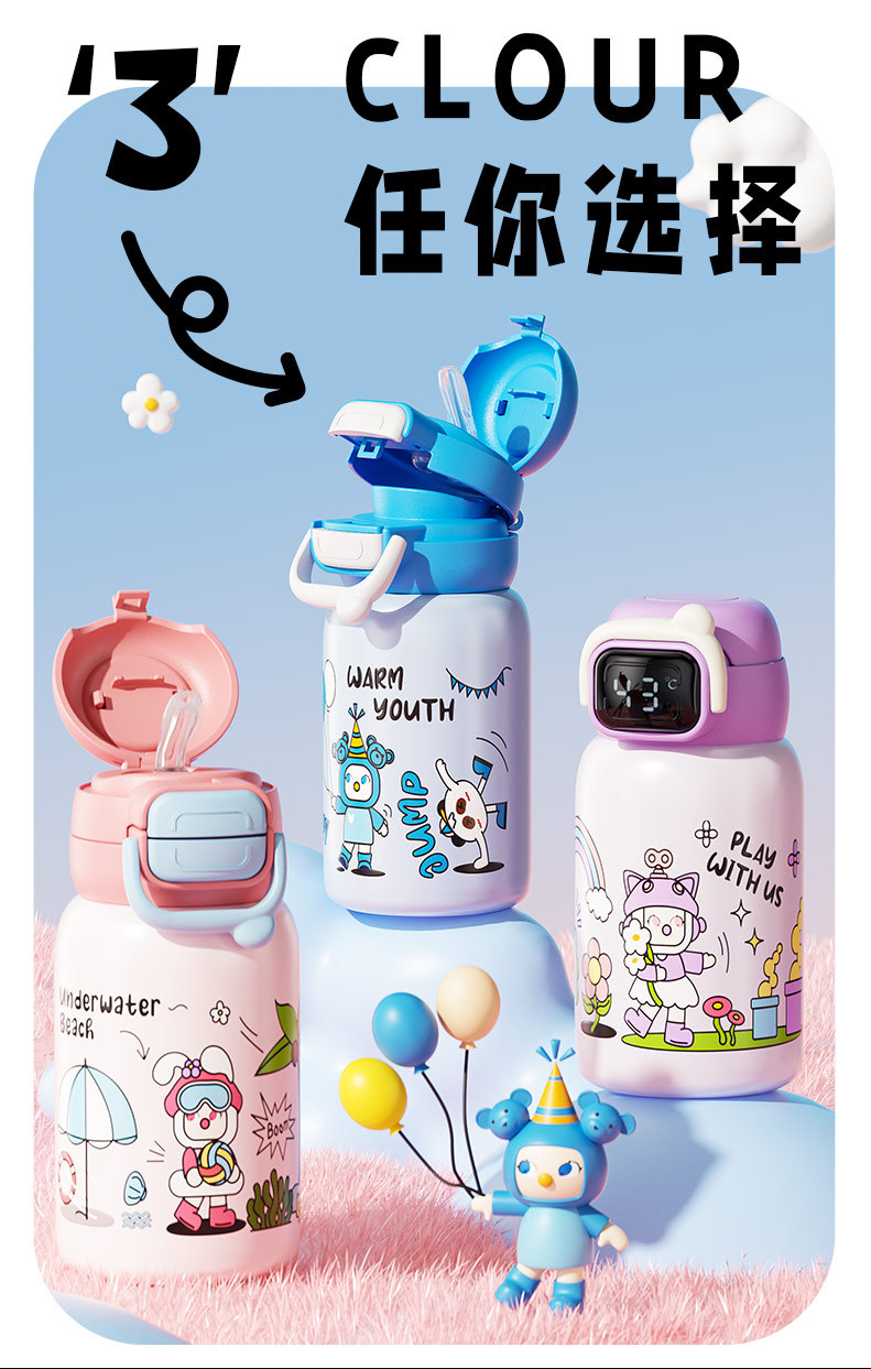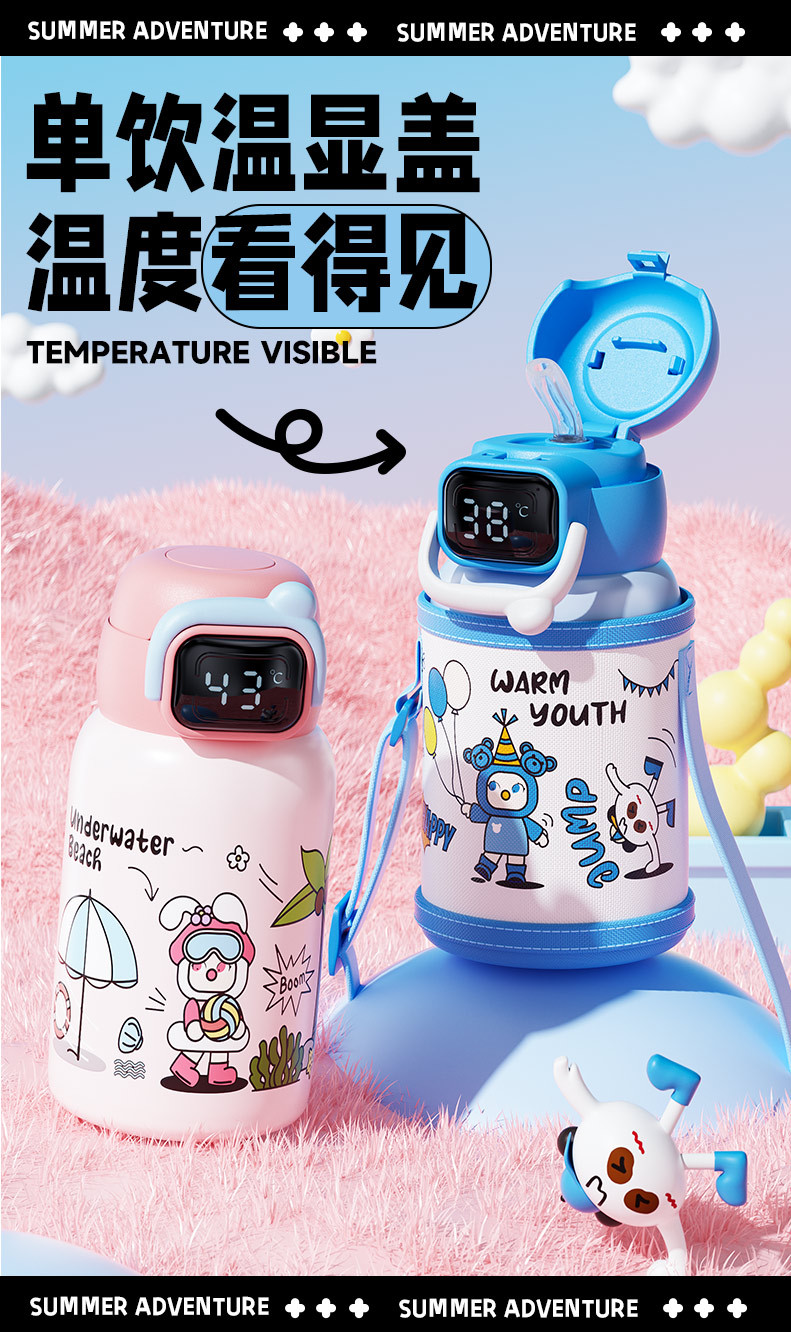 지능형 온도 측정 316 스테인레스 스틸 더블 음료 어린이 보온병 만화 높은 색상 가치 보온병 학생 밀짚 컵스토어 가기