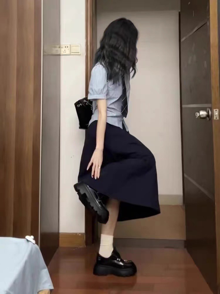 세트 여성 2024 년 여름 새로운 한국 스타일 나이를 줄이는 부드러운 스타일 반팔 줄무늬 셔츠 탑 하이 허리 트렌디 스커트스토어 가기