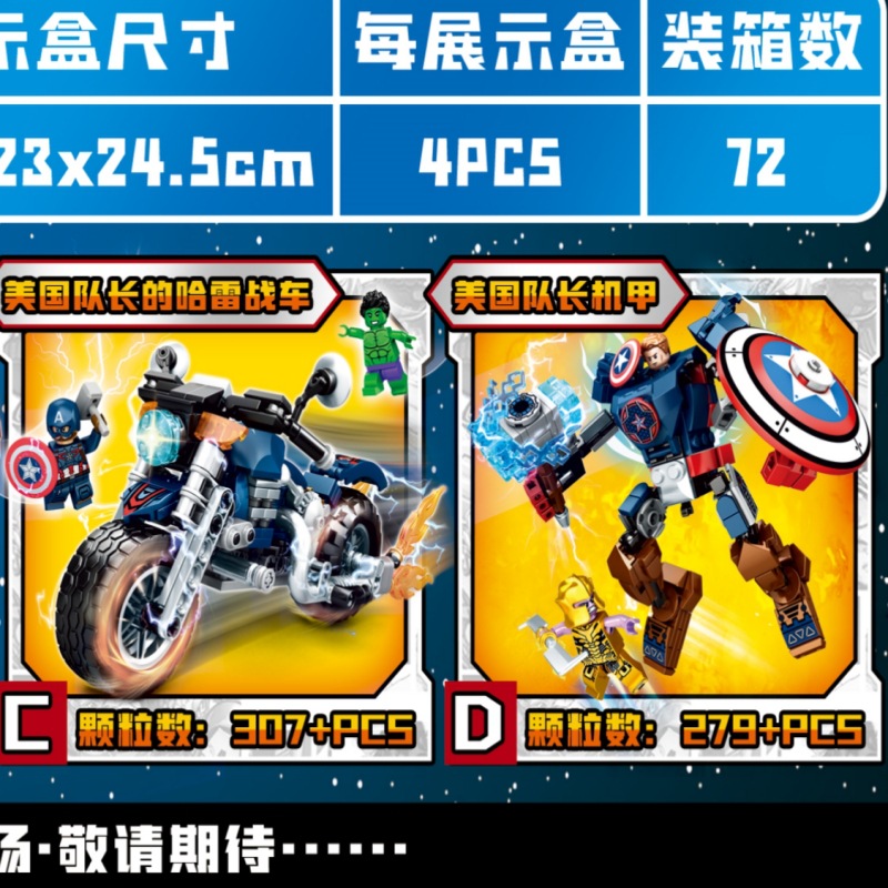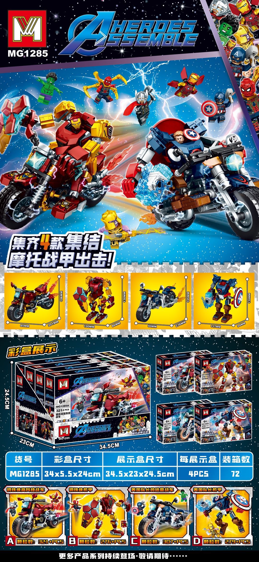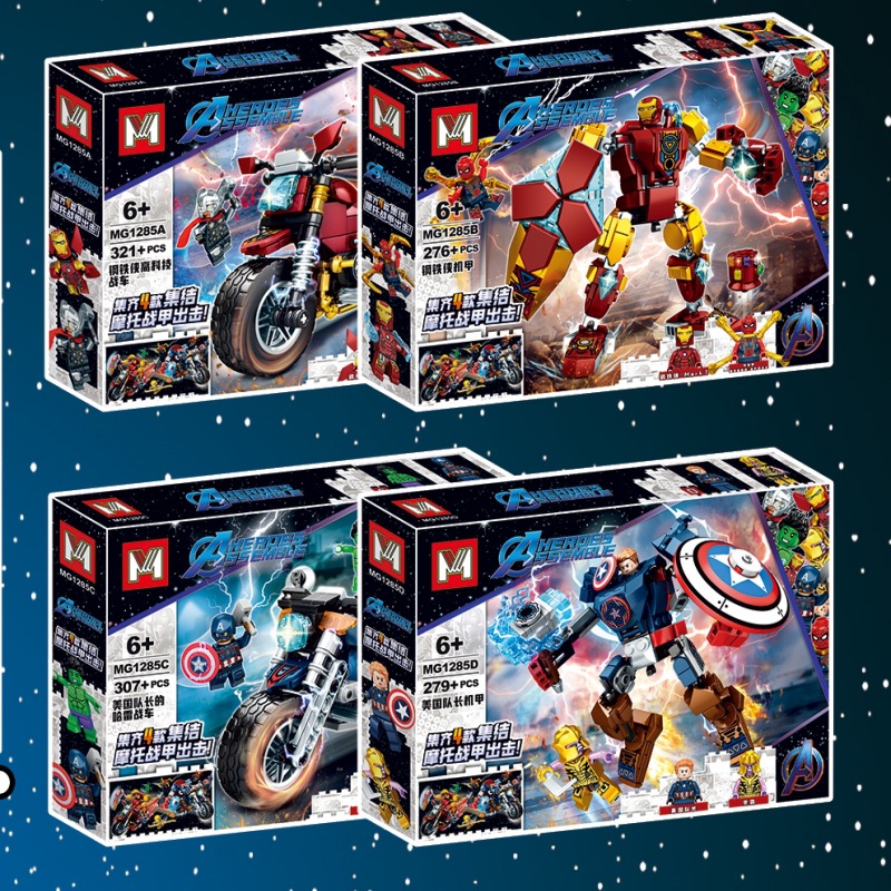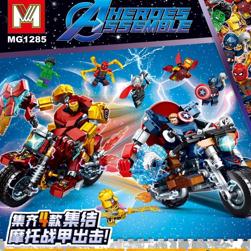M 브랜드 1285 어벤저스 오토바이 만화 캐릭터 퍼즐 어린이 장난감 창조적 인 선물 모델 빌딩 블록스토어 가기