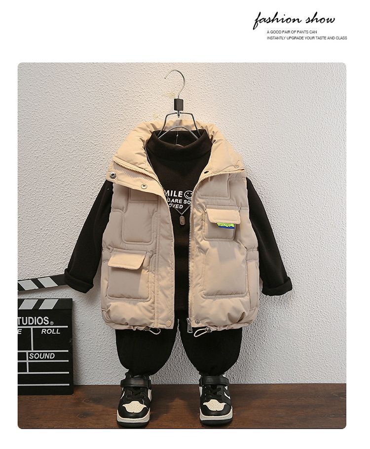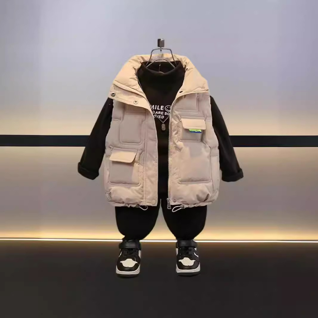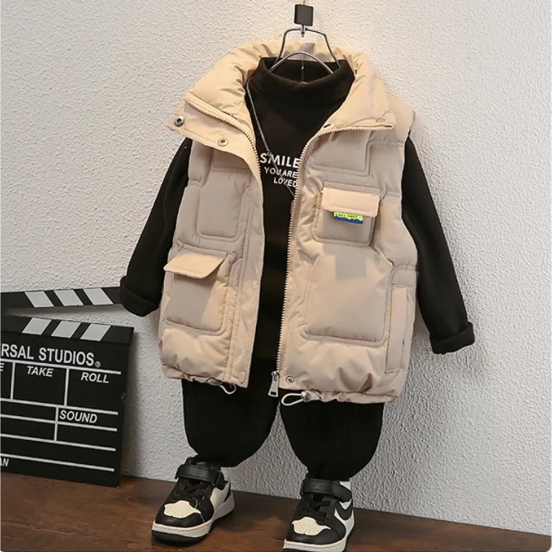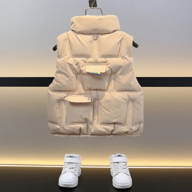 어린이 및 소년을위한 조끼 2024 새로운 스타일 중대형 어린이의 겨울 다운 코튼 웨어 보이스 스타일 외모 두꺼운 조끼스토어 가기