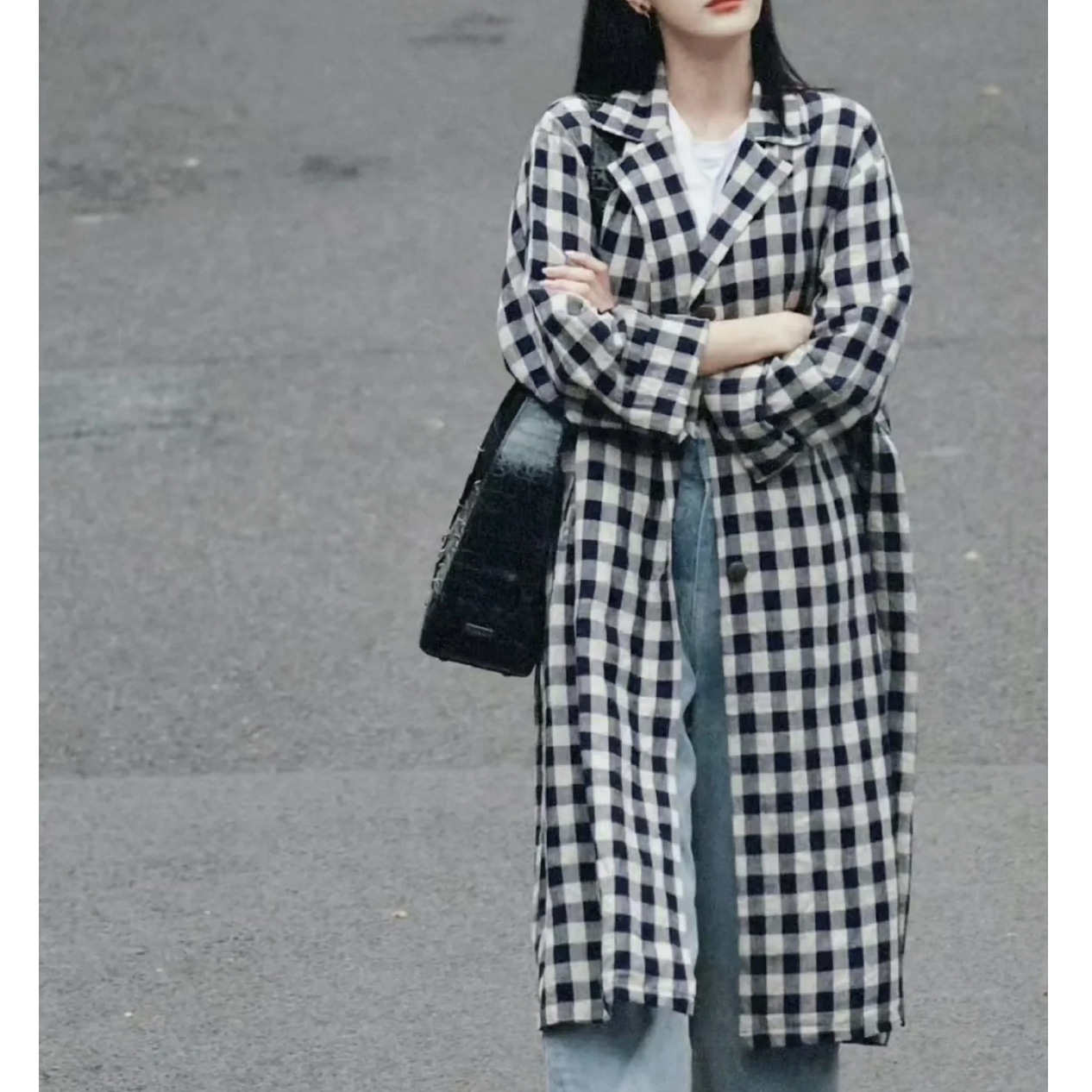 재고 샤오 헤펑 격자 무늬 옷깃 코트 여성용 긴 가을 느슨한 슬리밍 우아한 캐주얼 코트