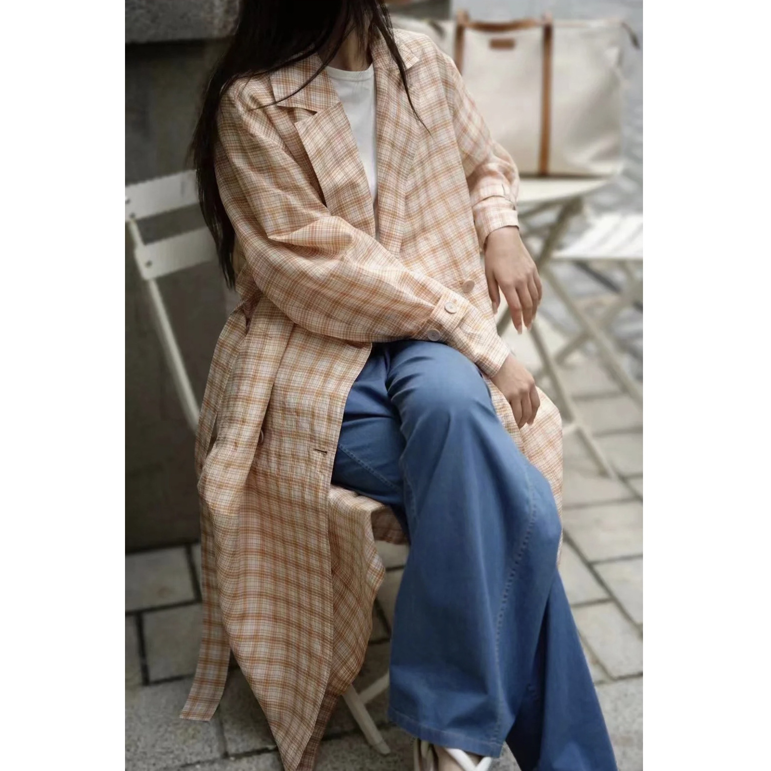 재고 샤오 헤펑 격자 무늬 옷깃 코트 여성용 긴 가을 느슨한 슬리밍 우아한 캐주얼 코트스토어 가기