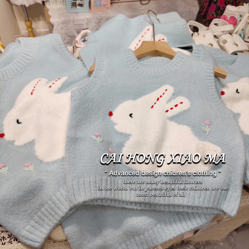여아 신상 봄 가을 니트 조끼 한국 신상품 흰토끼 니트 조끼 아동복 어린이 스웨터 조끼스토어 가기