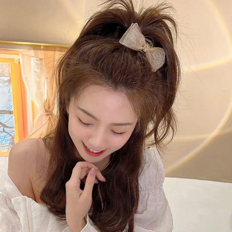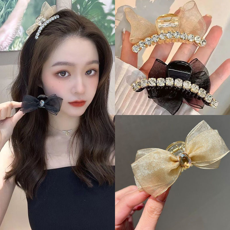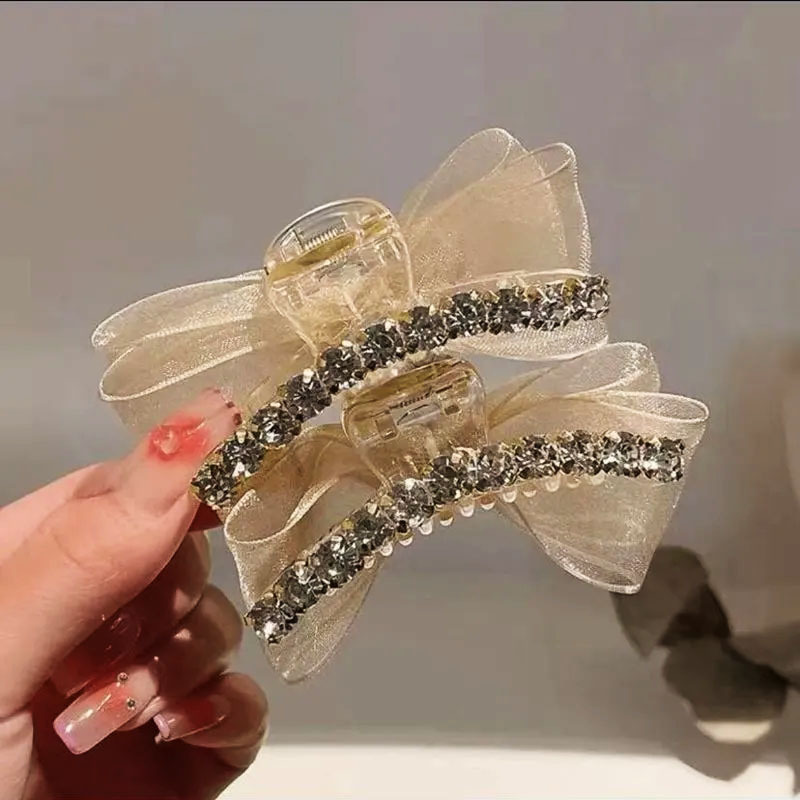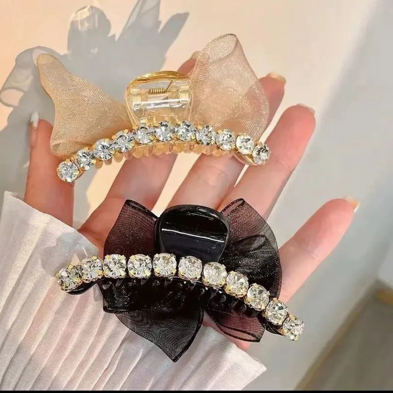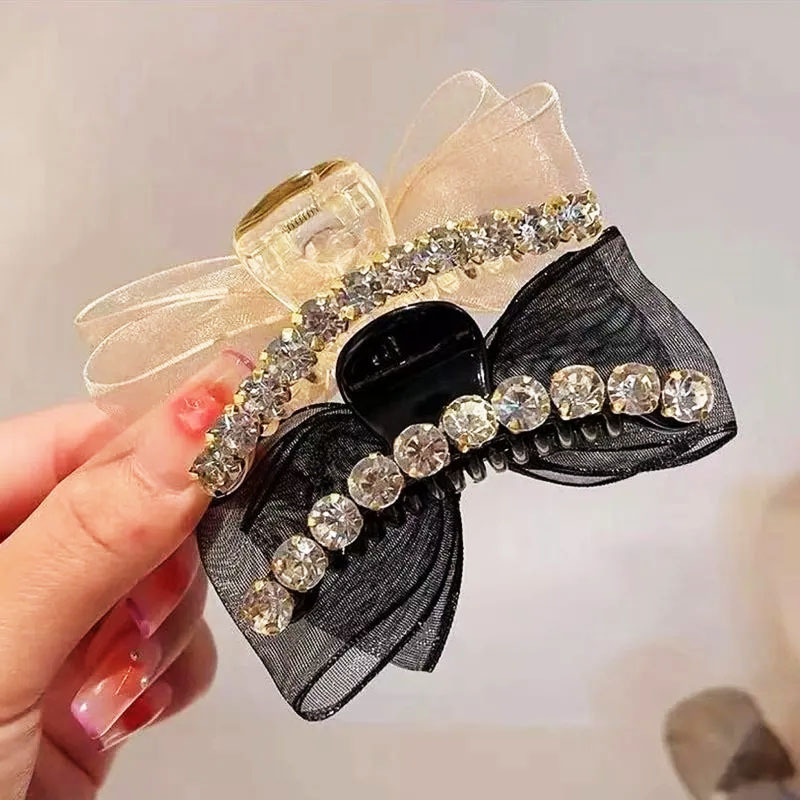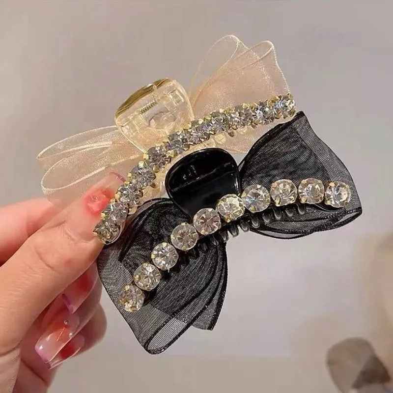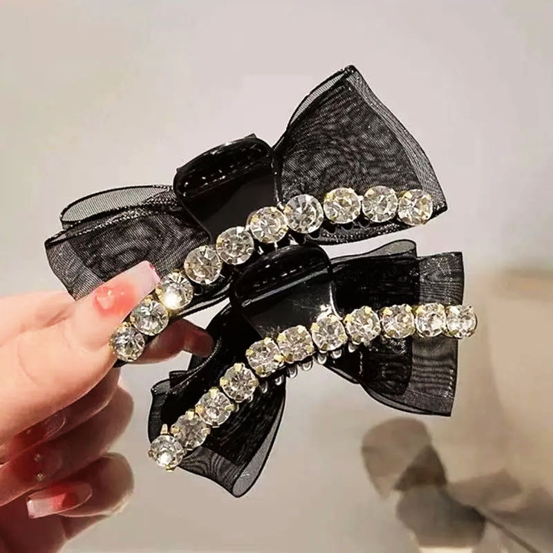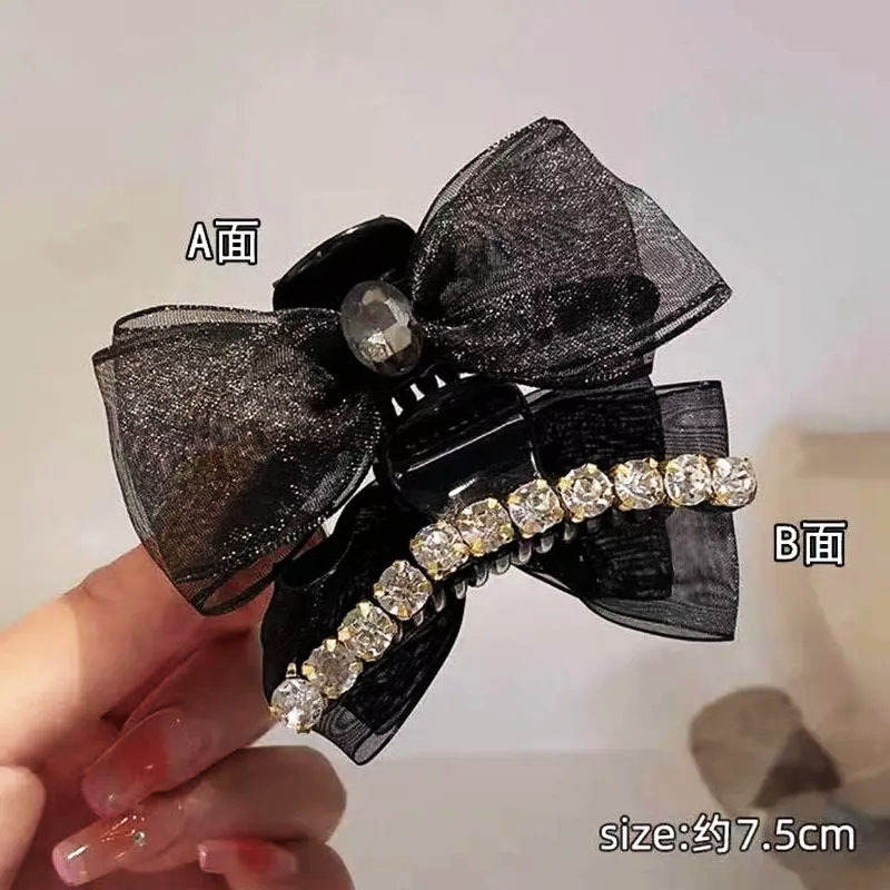 샤넬 스타일 양면 활 그랩 클립 메쉬 라인스톤 클로 클립 헤어핀 여성 사이드 뱅 클립 헤드 라인 우아한 헤어핀