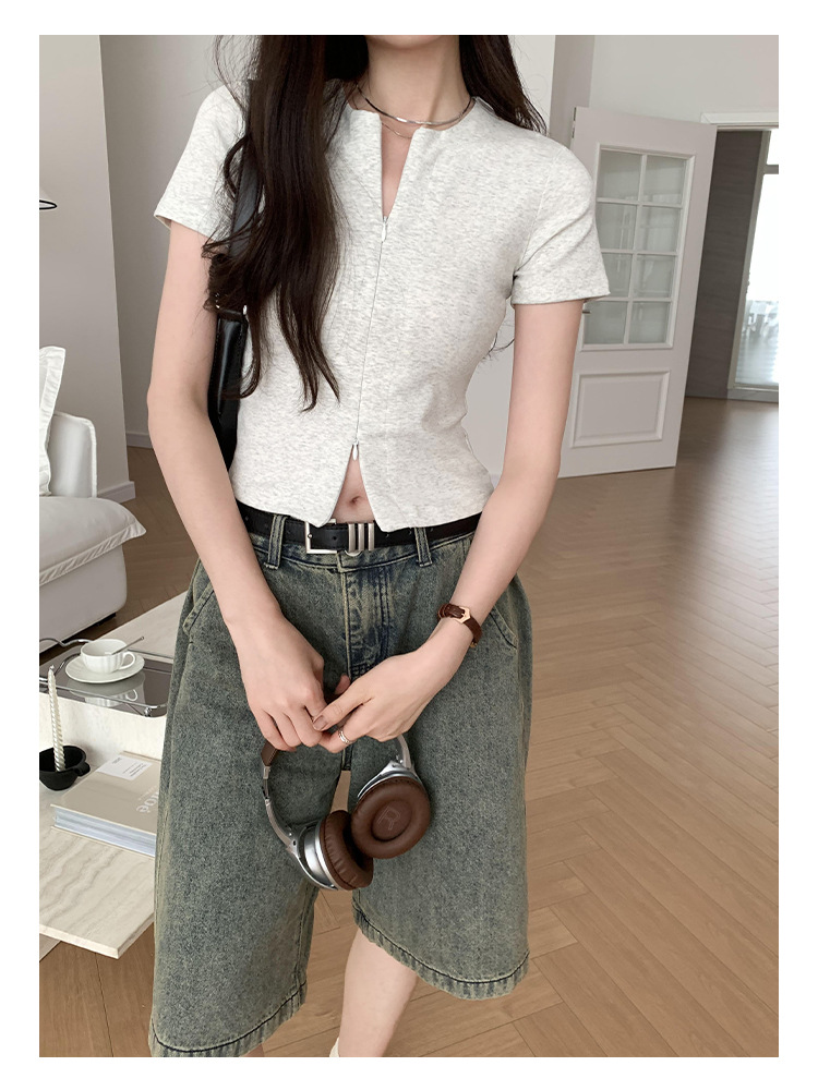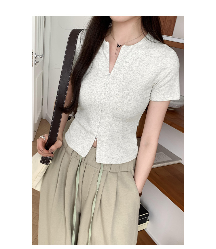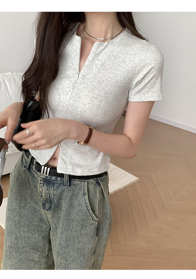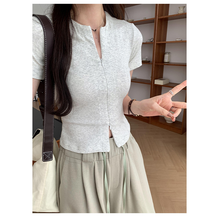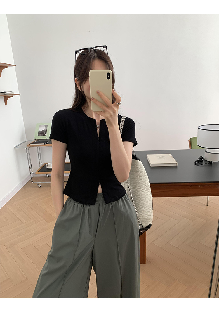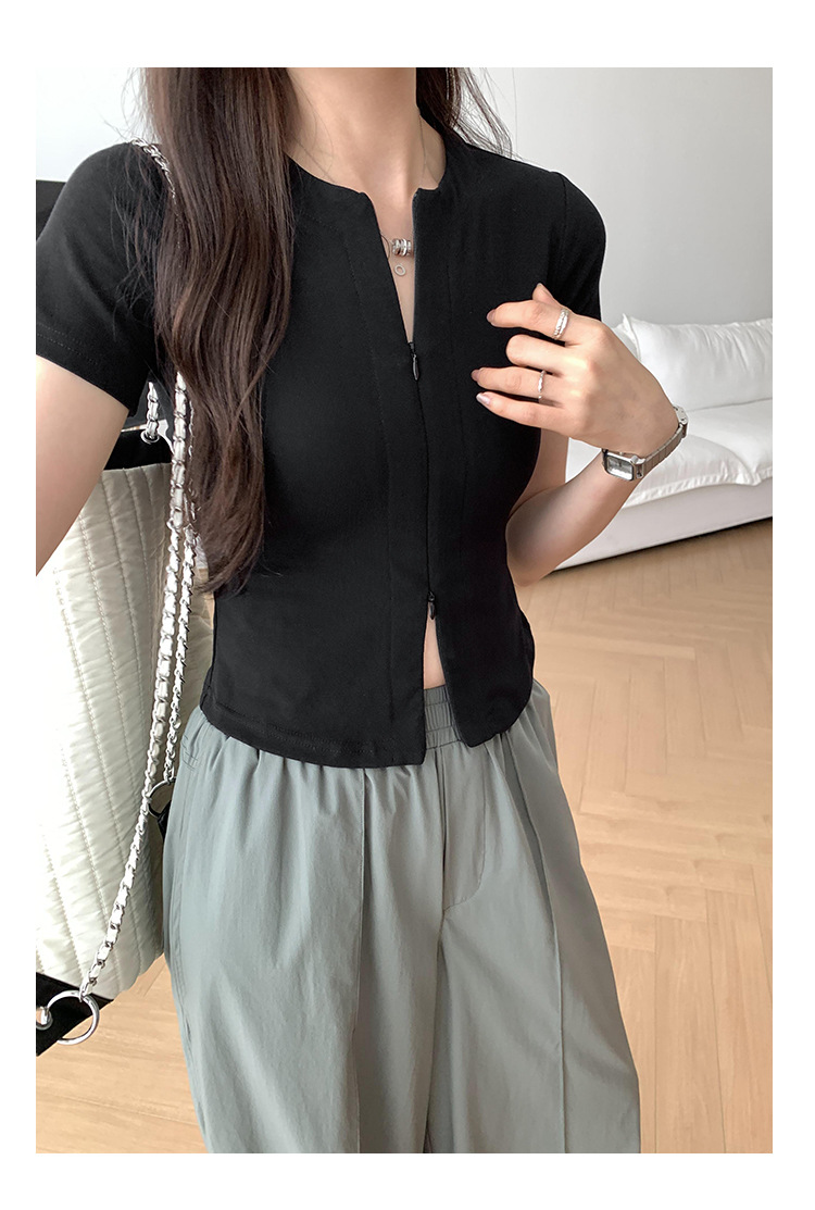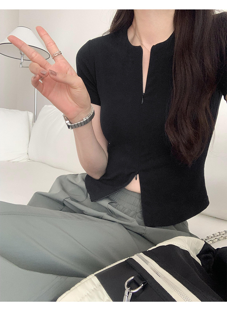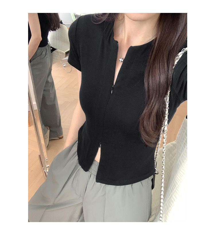 디자인 센스 더블 헤드 지퍼 프론트 숄더 반팔 티셔츠 여성의 여름 새로운 달콤하고 뜨거운 허리 슬리밍 짧은 카디건 탑