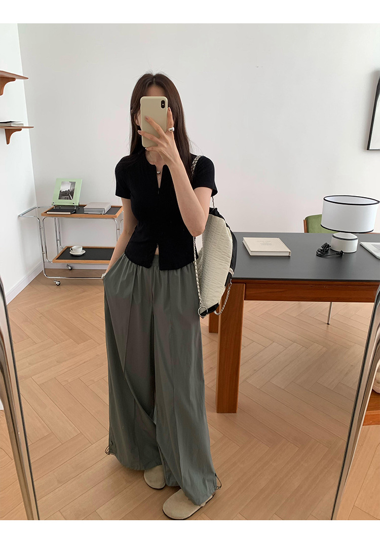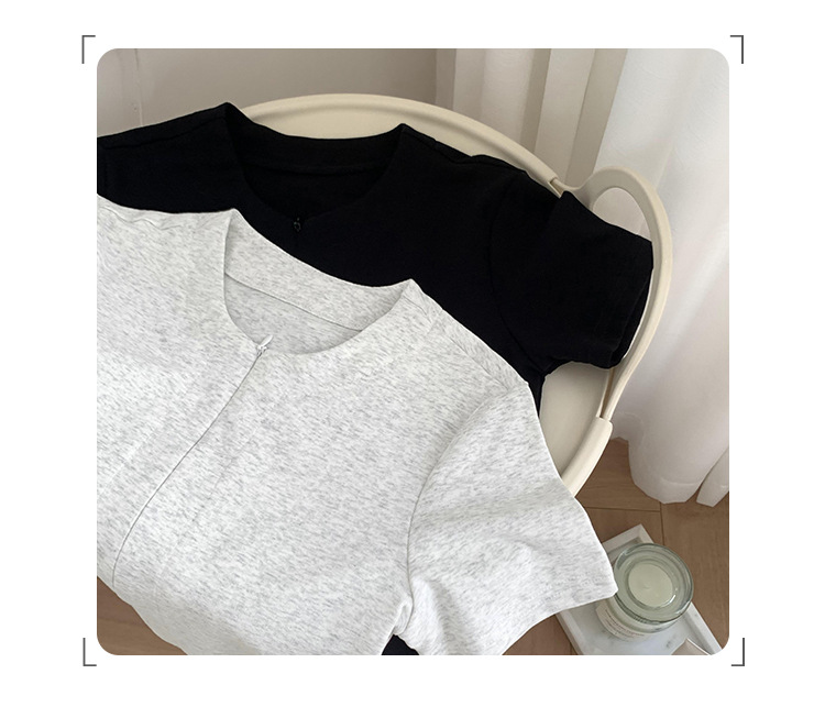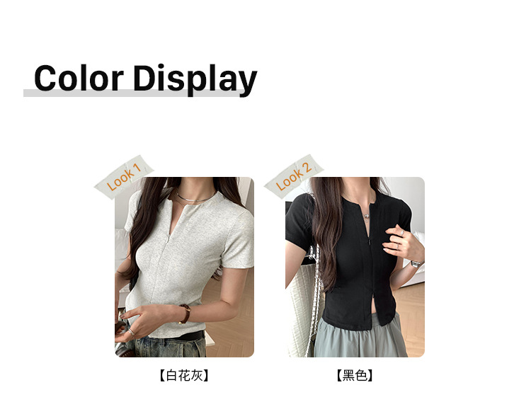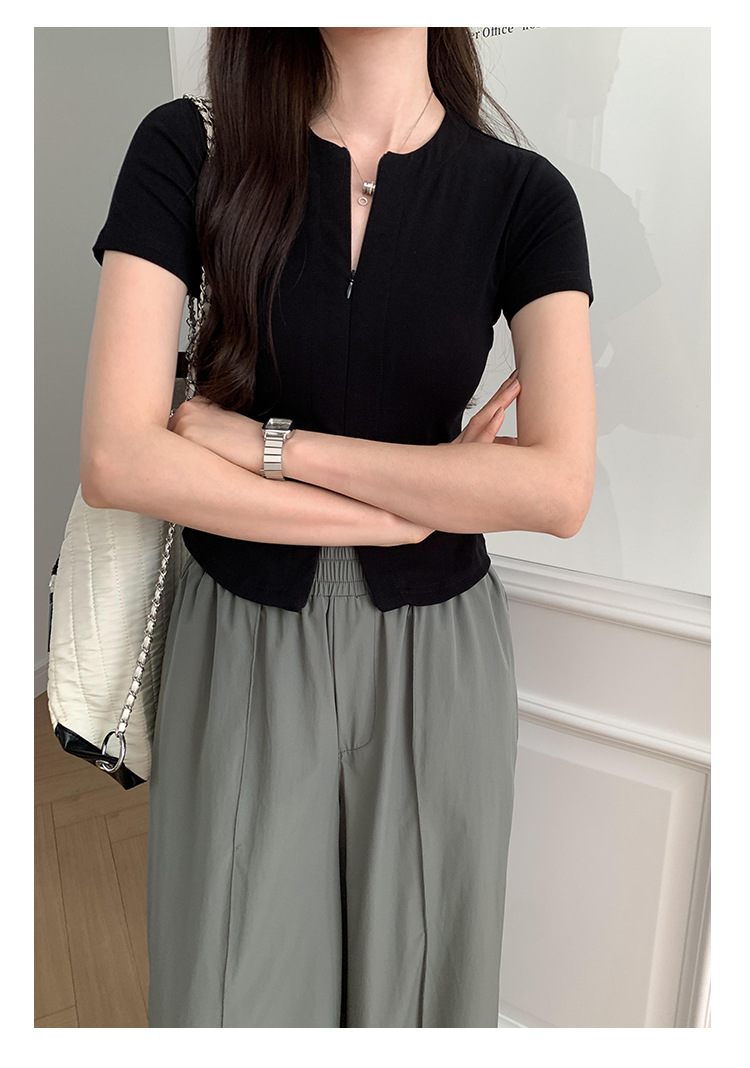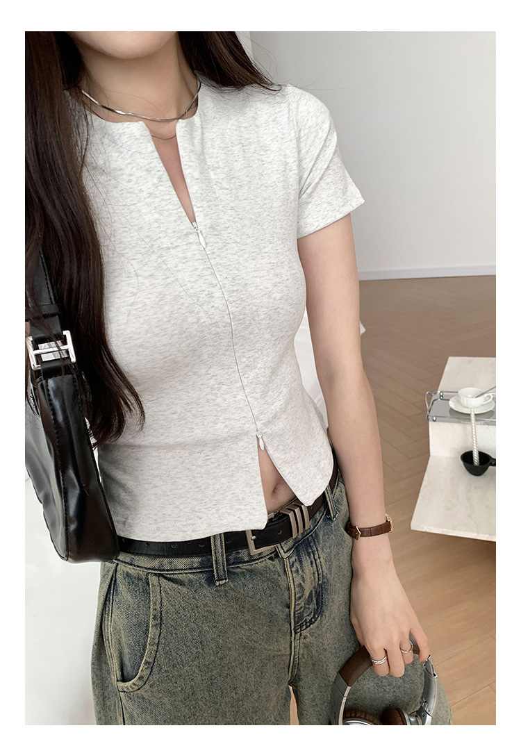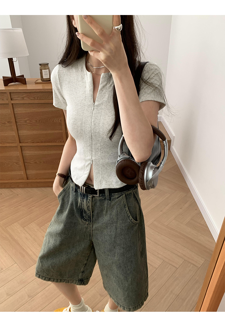 디자인 센스 더블 헤드 지퍼 프론트 숄더 반팔 티셔츠 여성의 여름 새로운 달콤하고 뜨거운 허리 슬리밍 짧은 카디건 탑스토어 가기