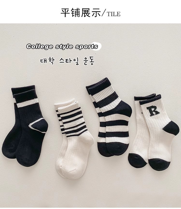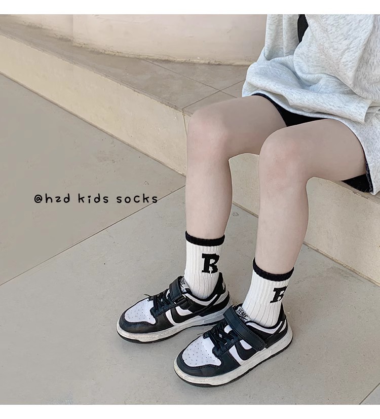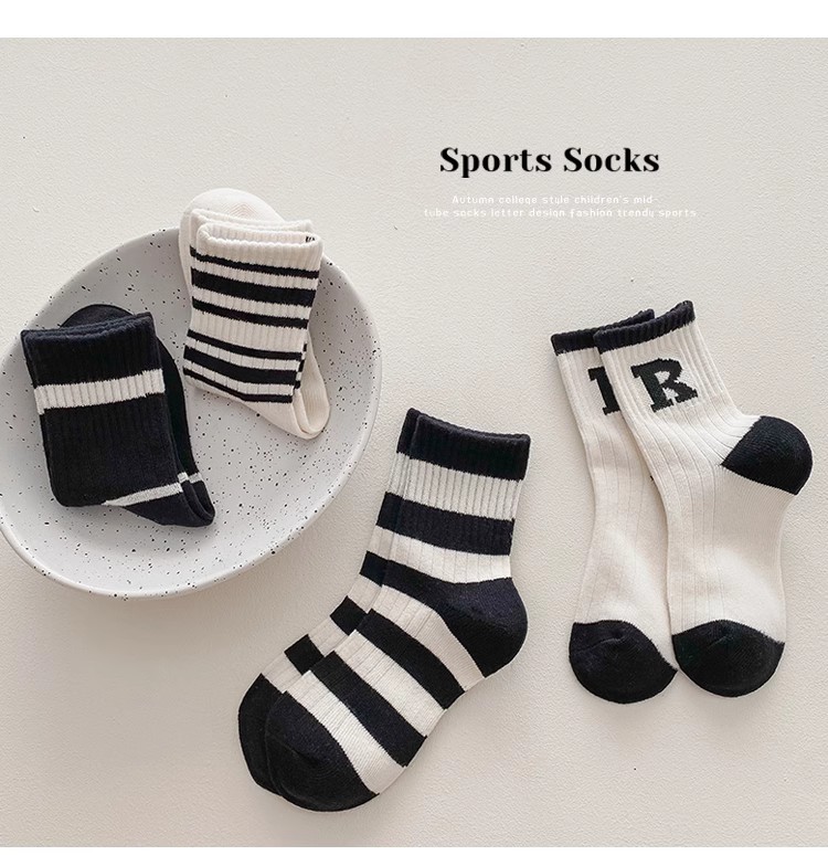 어린이 양말 봄 및 가을 Ins 유행 양말 여자 중간 튜브 양말 소년 스포츠 아기 양말 한국 스타일 흑백 줄무늬 편지