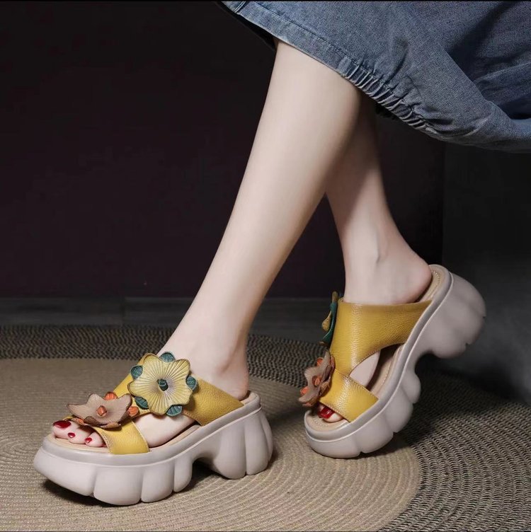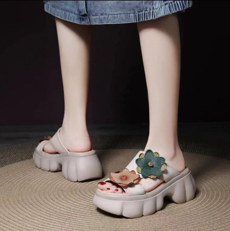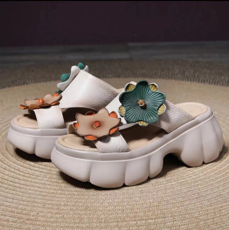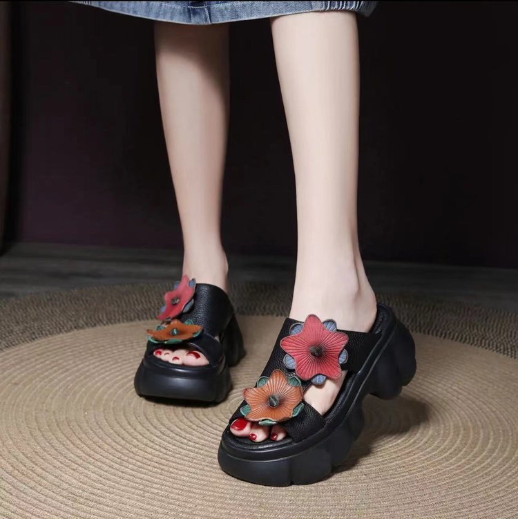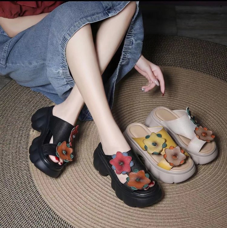 봄과 여름 2024 새로운 대외 무역 가죽 두꺼운 밑창 샌들과 슬리퍼 여성의 복고풍 패션 꽃 비치 샌들 국경 무역 국경스토어 가기