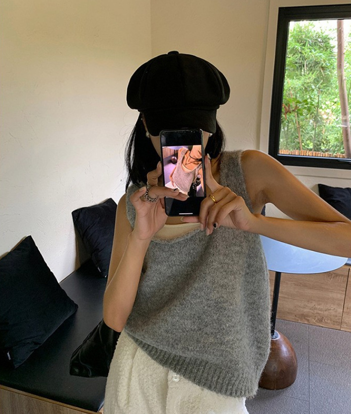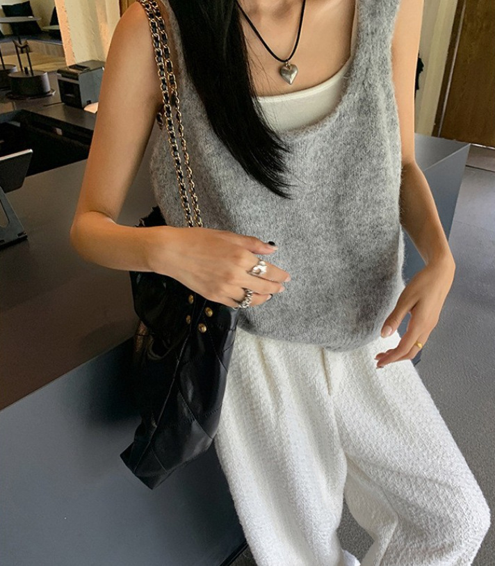 봄과 가을 쌓인 U-넥 니트 조끼 여자 느슨한 게으른 스타일 올매치 한국식 솔리드 컬러 풀오버 카미솔