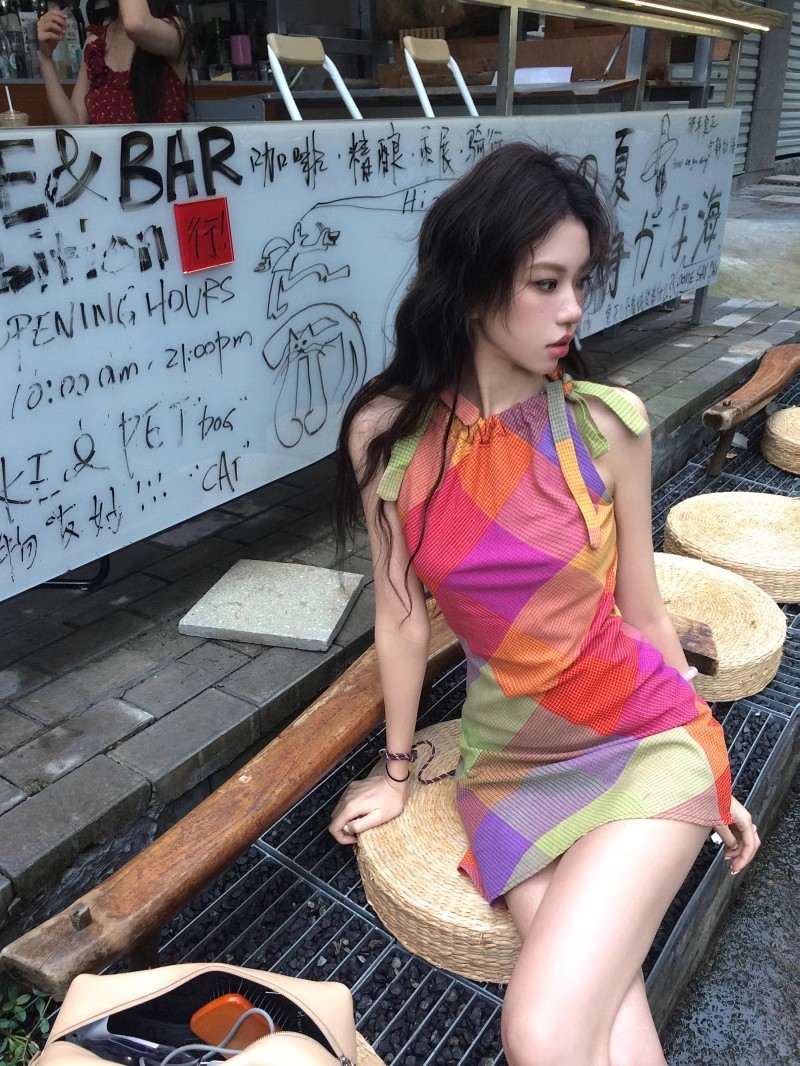 도파민 컬러 유료 스커트 틈새 스트랩 원피스 여성의 2024 여름 새로운 허리 슬리밍 짧은 치마